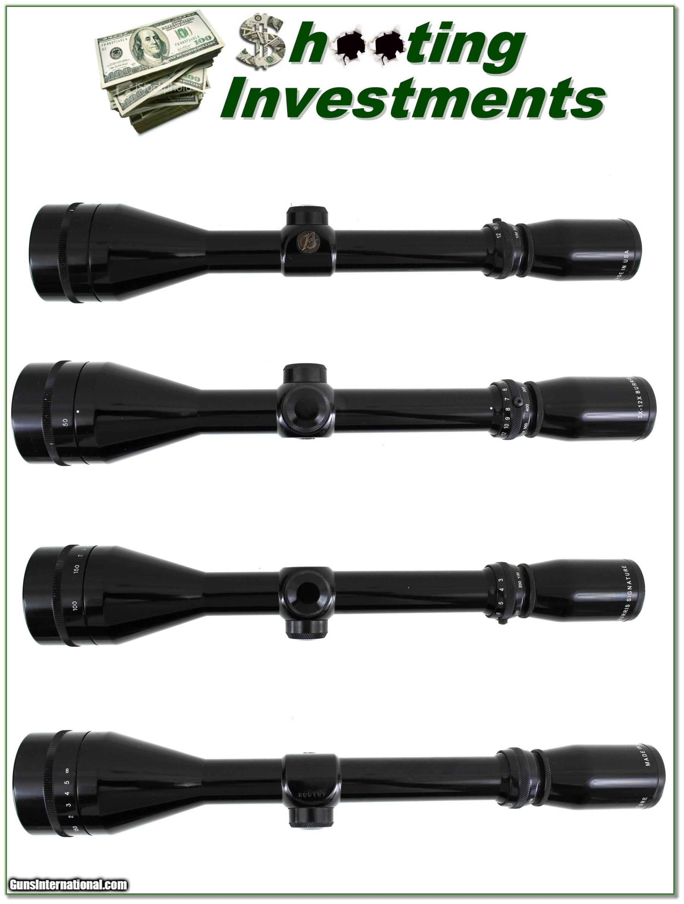 Description: Collectors, this is a vintage top of the line USA made Burris scope in a high GLOSS finish. It is their Signature series in 3 to 12 power with AO. It is in excellent condition with no marks I see. It has Duplex crosshairs and the optics are crystal clear. The image is as bright as you will find. These are top quality scopes. Shipping is $14.95 and please email me with any questions or larger pictures. (Consign your quality firearms with Shooting Investments for only 12%! Let me know if you have any you would like to sell!) 24-0803s Payment: Payment is by Money Order, Cashier’s Check or Personal Check. I can now also accept Credit Cards (MasterCard, Visa, Discover & American Express) with a 3% convenience fee. Shipping: The shipping charge will be listed in each description. It is $49 for most firearms. Some heavy guns or those insured for over $2000 will be higher. Shipments to Alaska and Hawaii are higher because air shipment is required. Most firearms are shipped on Tuesday and Thursday and usually in 5 days of receipt of payment. We package all shipments carefully and insure them. Optics are shipped Priority Mail and most other non-firearm shipments are shipped First Class. Returns: Our return policy is simple. If for any reason you are not pleased with your purchase, you may return your item for a full refund of purchase price. Ammunition cannot be returned. It is important to us that you are happy. Guns cannot be fired or dissembled before returning them and they must be returned in the same condition as received. Notification of a return must occur within 3 days of receipt at your dealer. Shipping, convenience and dealer fees are not refundable and are the responsibility of the buyer. Lay-a-way: If needed, we offer a 60 day lay-a-way option on most firearms. It is 1/3 now, 1/3 in 30 days and 1/3 in 60 days. Lay-a-way firearm sales are final and cannot be returned. If a lay-a-way is not completed the first payment cannot be refunded. Consigning your firearms with Shooting Investments: We will help you get top dollar for your firearms. While most local guns shops charge 20% or more, our fee is only 12% with a minimum of $75. At your local gun shop it might take months to sell. Selling on-line provides instant access to thousands of interested buyers. You won’t find any other on-line dealer willing to sell your firearms for only 12% or listing every gun on 3 separate s. Selling through an House typically costs the seller 15% and the buyer an addition 15% (so 30%) and you have to wait several months to sell and longer to receive funds. If properly priced, we will sell your firearms within a few weeks. Send us an email or give us a call and we’ll explain how easy it is for you to get top dollar. Trading: Trading for us is really just buying your gun to re-sell. If you have a gun you want to trade, please email a picture and we will let you know what we can give for it. You will always get more if we sell it for you on consignment. SOLD |