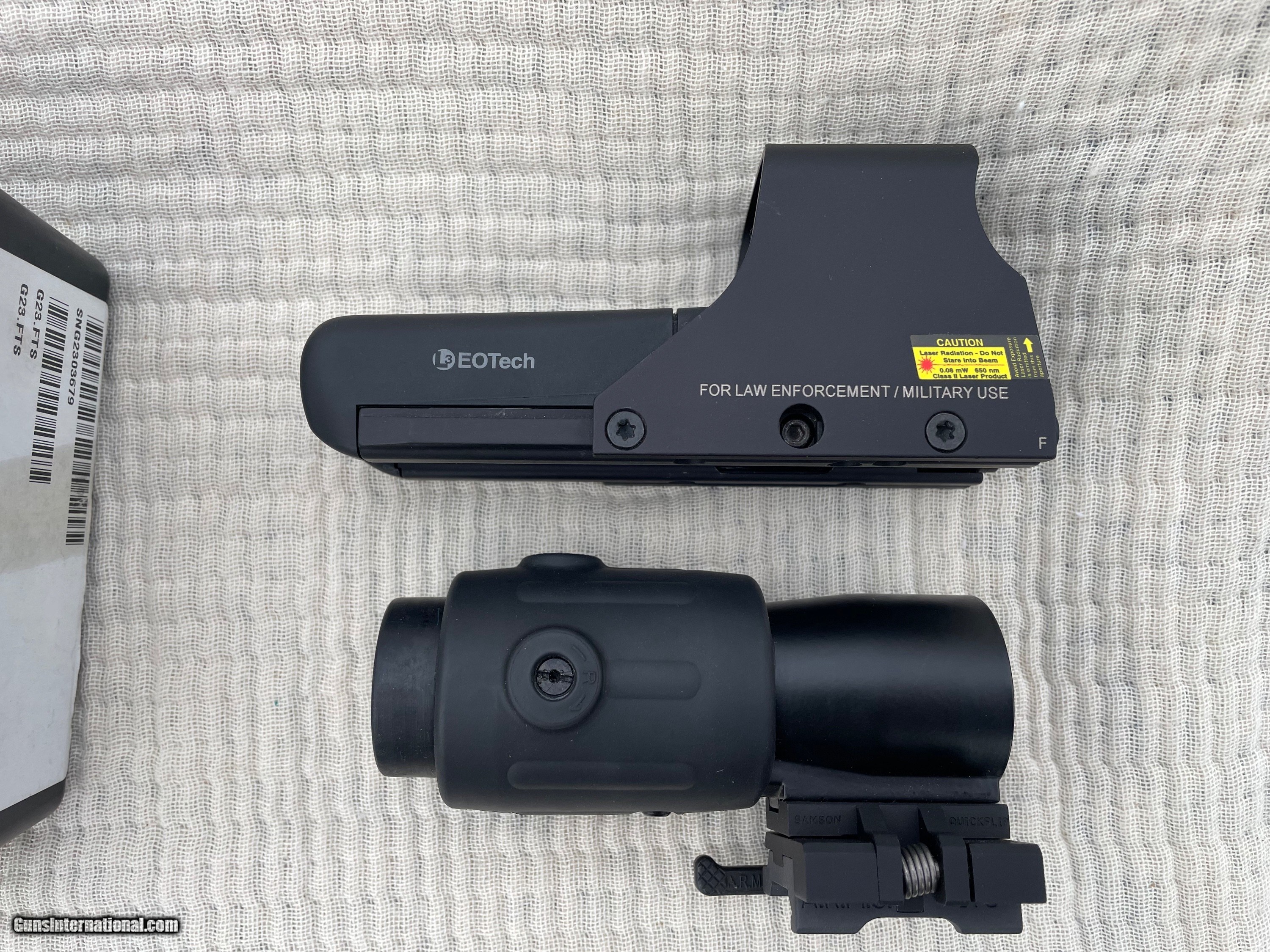 Description: EOTech Holographic sight with G23.FTS 3x magnifier. All in excellent order. came off a gun that was set up but never shot. Although this is a previous generation, all works just as new. includes flip out mount for magnifier. Price: $500.00 Shipping: $25.00 Contact Seller |