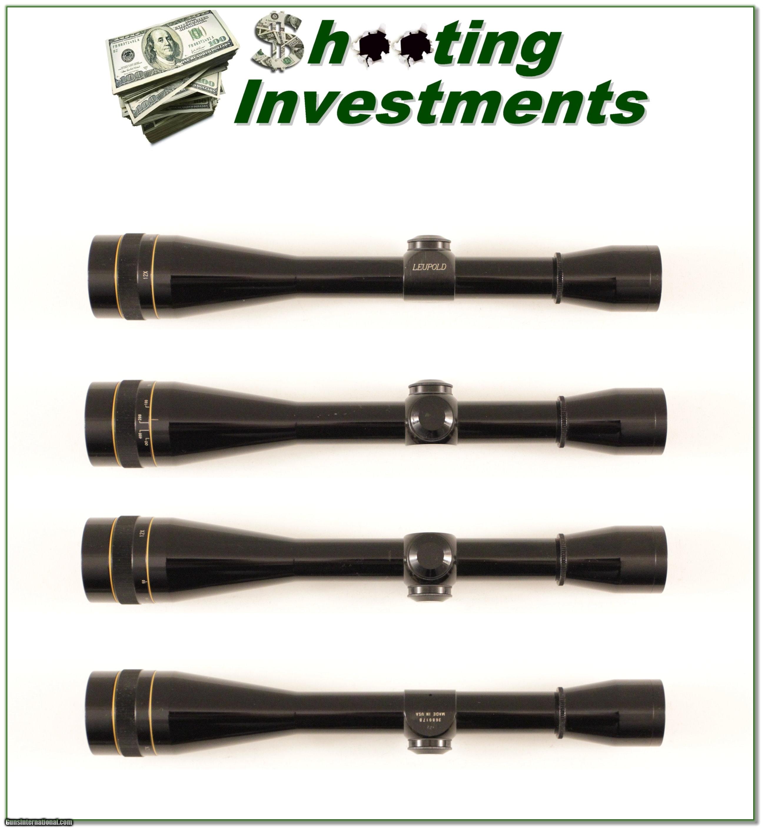 Description: This is a Leupold 12X fixed power scope with adjustable Objective and gloss finish. The optics are crystal clear with fine duplex crosshair. It is in excellent condition with only a few ring marks. This will make a very nice scope for any varmint vintage or hunting rifle. These are hard to find and come with Leupolds forever warrantee! Please email me with any questions or for larger photos. Shipping is $12.95. (I now consign quality firearms only 10%! Let me know if you have any you would like to sell!) [16-0805s] Payment: Payment is by Money Order, Cashiers Check or Personal Check. I can now also accept MasterCard and Visa with a 3% convenience fee. PayPal can be used for some items but never firearms. Please let us know if you would like to pay via PayPal. Shipping: The shipping charge will be listed in each description. It is $35 for most guns. Some heavy guns or those insured for over $2000 will be higher. Shipments to Alaska and Hawaii are higher because air shipment is required. Most firearms are shipped within 5 days of receipt of payment. We prefer shipping at the beginning of the week to avoid firearms in transit over weekends. We package all shipments carefully and insure them for the full purchase price, rounded up to the next $100. In the unlikely event that damage occurs, it is important that you save all packaging material for the claims process. Optics are shipped Priority Mail and most other non-firearm shipments are shipped First Class. Returns: Our return policy is simple. If for any reason you are not pleased with your purchase, you may return your item for a refund. The only exception is ammunition, it cannot be returned. It is important to us that you are happy. Guns cannot be fired or dissembled before returning them and must be returned in the same condition as received. Notification of a return must occur with-in 3 days of receipt at your dealer. Shipping, convenience and dealer fees are not refundable and are the responsibility of the buyer. Lay-a-way: If needed, we offer a 60 day lay-a-way option on most firearms. It is 1/3 now, 1/3 in 30 days and 1/3 in 60 days. Lay-a-way firearm sales are final. Consigning your firearms with Shooting Investments: We will help you get top dollar for your firearms. While most local guns shops charge 20% or more, our fee is only 10% with a minimum of $50. At your local gun shop it might take months to sell. Selling on-line provides instant access to thousands of interested buyers. You won’t find any other on-line dealer willing to sell your firearms for only 10% or listing every gun on 4 separate s. Selling through an House typically costs the seller 15% and the buyer an addition 15% (so 30%) and you have to wait several months to sell and longer to receive funds. If properly priced, we will sell your firearms in a week or two. Send us an email or give us a call and we’ll explain how easy it is for you to get top dollar. Trading: We collect guns and usually just trade for guns we want to add to our collections. We often sell guns for others wanting to purchase one of ours. We find this the most fair to both of us. Our Commission is only 10% and we hold the gun you want until yours sells. Please contact us if you want to sell one of yours to buy one of ours. Help for California Buyers: We are happy to ship to California. It is the buyer’s responsibility to make sure any item you buy is legal in your state. We are also happy to help with your purchase of a firearm from someone other than us. If you see a gun you would like to buy but the seller can’t or won’t ship to California we can help. You buy the gun and have it shipped to us. We’ll then ship it to your California dealer. The cost for this service is only $30 + shipping. Let me know if we can help! SOLD |