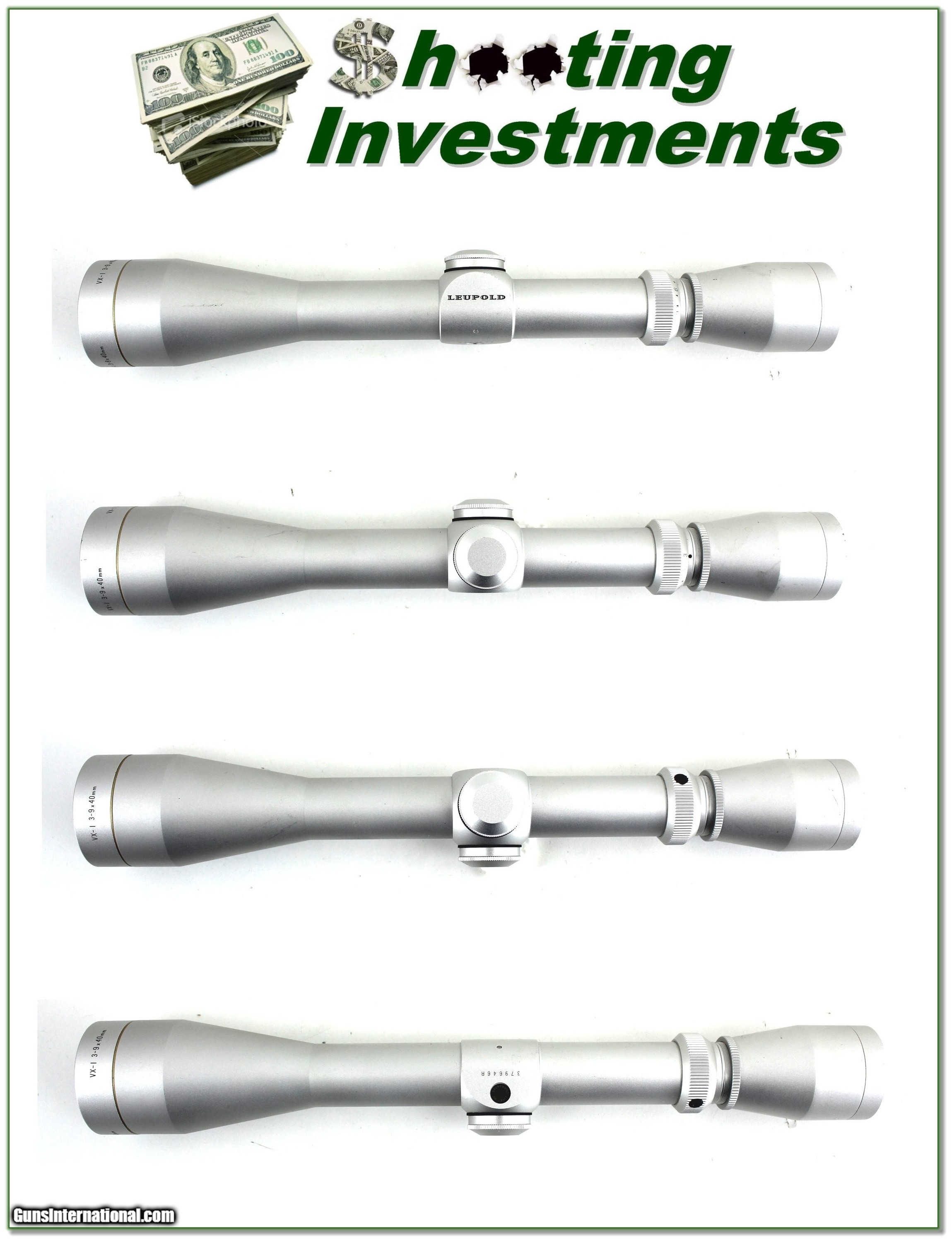 Description: This is a no longer made Silver Leupold rifle scope. It is a VX-1 3-9 x 40mm. It has duplex crosshairs with crystal clear optics. I find just a few marks. Shipping is $14.95 and please email me with any questions or larger pictures. (Consign your quality firearms with Shooting Investments for only 12%! Let me know if you have any you would like to sell!) 24-1025s Payment: Payment is by Money Order, Cashier’s Check or Personal Check. I can now also accept Credit Cards (MasterCard, Visa, Discover & American Express) with a 3% convenience fee. Shipping: The shipping charge will be listed in each description. It is $49 for most firearms. Some heavy guns or those insured for over $2000 will be higher. Shipments to Alaska and Hawaii are higher because air shipment is required. Most firearms are shipped on Tuesday and Thursday and usually in 5 days of receipt of payment. We package all shipments carefully and insure them. Optics are shipped Priority Mail and most other non-firearm shipments are shipped First Class. Returns: Our return policy is simple. If for any reason you are not pleased with your purchase, you may return your item for a full refund of purchase price. Ammunition cannot be returned. It is important to us that you are happy. Guns cannot be fired or dissembled before returning them and they must be returned in the same condition as received. Notification of a return must occur within 3 days of receipt at your dealer. Shipping, convenience and dealer fees are not refundable and are the responsibility of the buyer. Lay-a-way: If needed, we offer a 60 day lay-a-way option on most firearms. It is 1/3 now, 1/3 in 30 days and 1/3 in 60 days. Lay-a-way firearm sales are final and cannot be returned. If a lay-a-way is not completed the first payment cannot be refunded. Consigning your firearms with Shooting Investments: We will help you get top dollar for your firearms. While most local guns shops charge 20% or more, our fee is only 12% with a minimum of $75. At your local gun shop it might take months to sell. Selling on-line provides instant access to thousands of interested buyers. You won’t find any other on-line dealer willing to sell your firearms for only 12% or listing every gun on 3 separate s. Selling through an House typically costs the seller 15% and the buyer an addition 15% (so 30%) and you have to wait several months to sell and longer to receive funds. If properly priced, we will sell your firearms within a few weeks. Send us an email or give us a call and we’ll explain how easy it is for you to get top dollar. Trading: Trading for us is really just buying your gun to re-sell. If you have a gun you want to trade, please email a picture and we will let you know what we can give for it. You will always get more if we sell it for you on consignment. SOLD |