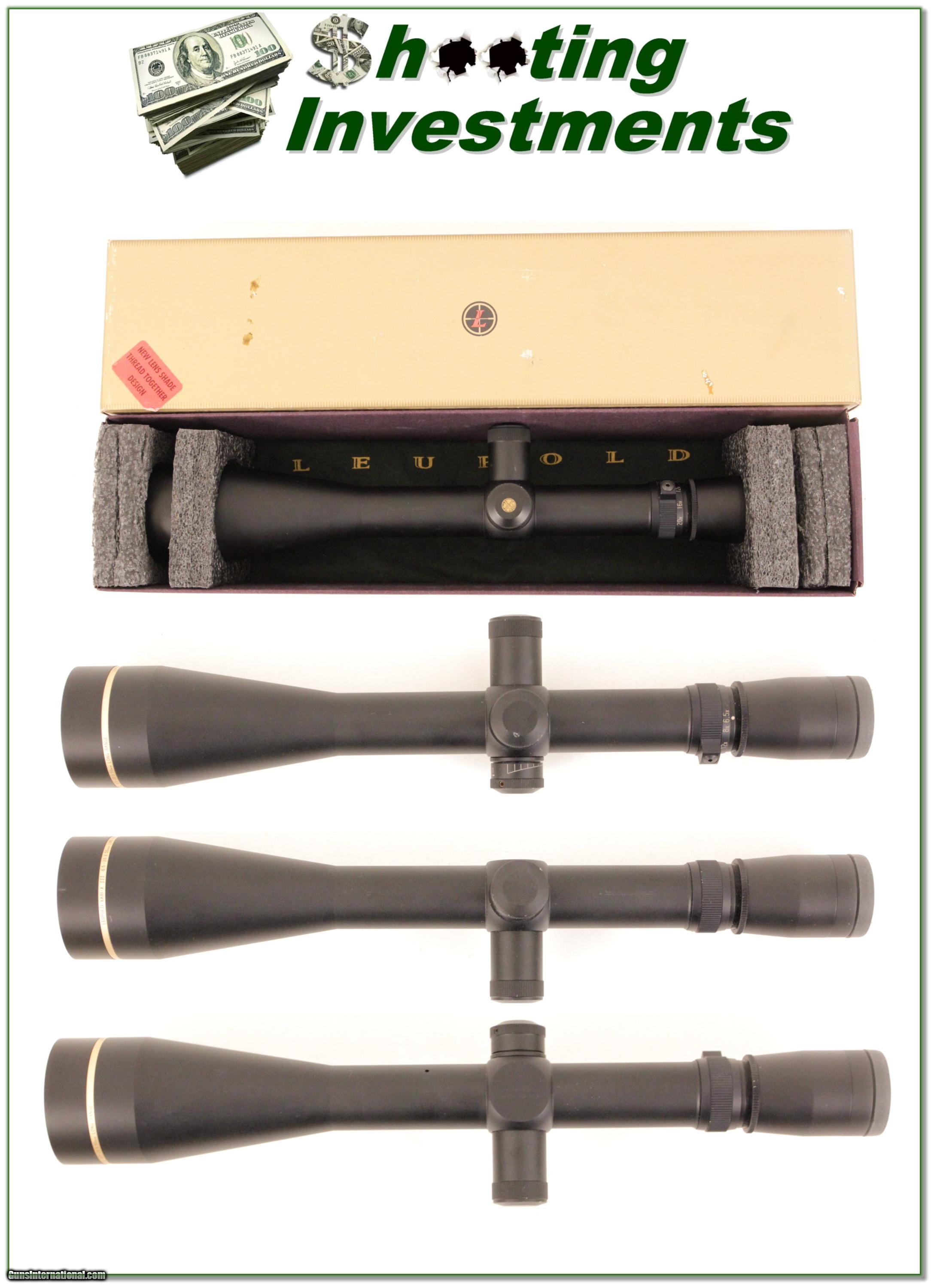 Description: This is a top quality Leupold Long Range 6.5-20 X 50mm scope. It is as new in the box with Target Dot crosshair and matte finish. These have 30mm tubes. Compare to the 6.5-20 VX-3i. The current Cableas price for it is $999! This one is just as nice. Shipping $19.95 and please email me with any questions or larger pictures. (I now consign quality firearms only 10%! Let me know if you have any you would like to sell!) [16-s029] Payment: Payment is by Money Order, Cashiers Check or Personal Check. I can now also accept MasterCard and Visa with a 3% convenience fee. PayPal can be used for some items but never firearms. Please let us know if you would like to pay via PayPal. Shipping: The shipping charge will be listed in each description. It is $35 for most guns. Some heavy guns or those insured for over $2000 will be higher. Shipments to Alaska and Hawaii are higher because air shipment is required. Most firearms are shipped within 5 days of receipt of payment. We prefer shipping at the beginning of the week to avoid firearms in transit over weekends. We package all shipments carefully and insure them for the full purchase price, rounded up to the next $100. In the unlikely event that damage occurs, it is important that you save all packaging material for the claims process. Optics are shipped Priority Mail and most other non-firearm shipments are shipped First Class. Returns: Our return policy is simple. If for any reason you are not pleased with your purchase, you may return your item for a refund. The only exception is ammunition, it cannot be returned. It is important to us that you are happy. Guns cannot be fired or dissembled before returning them and must be returned in the same condition as received. Notification of a return must occur with-in 3 days of receipt at your dealer. Shipping, convenience and dealer fees are not refundable and are the responsibility of the buyer. Lay-a-way: If needed, we offer a 60 day lay-a-way option on most firearms. It is 1/3 now, 1/3 in 30 days and 1/3 in 60 days. Lay-a-way firearm sales are final. Consigning your firearms with Shooting Investments: We will help you get top dollar for your firearms. While most local guns shops charge 20% or more, our fee is only 10% with a minimum of $50. At your local gun shop it might take months to sell. Selling on-line provides instant access to thousands of interested buyers. You won’t find any other on-line dealer willing to sell your firearms for only 10% or listing every gun on 4 separate s. Selling through an House typically costs the seller 15% and the buyer an addition 15% (so 30%) and you have to wait several months to sell and longer to receive funds. If properly priced, we will sell your firearms in a week or two. Send us an email or give us a call and we’ll explain how easy it is for you to get top dollar. Trading: We collect guns and usually just trade for guns we want to add to our collections. We often sell guns for others wanting to purchase one of ours. We find this the most fair to both of us. Our Commission is only 10% and we hold the gun you want until yours sells. Please contact us if you want to sell one of yours to buy one of ours. Help for California Buyers: We are happy to ship to California. It is the buyer’s responsibility to make sure any item you buy is legal in your state. We are also happy to help with your purchase of a firearm from someone other than us. If you see a gun you would like to buy but the seller can’t or won’t ship to California we can help. You buy the gun and have it shipped to us. We’ll then ship it to your California dealer. The cost for this service is only $30 + shipping. Let me know if we can help! SOLD |