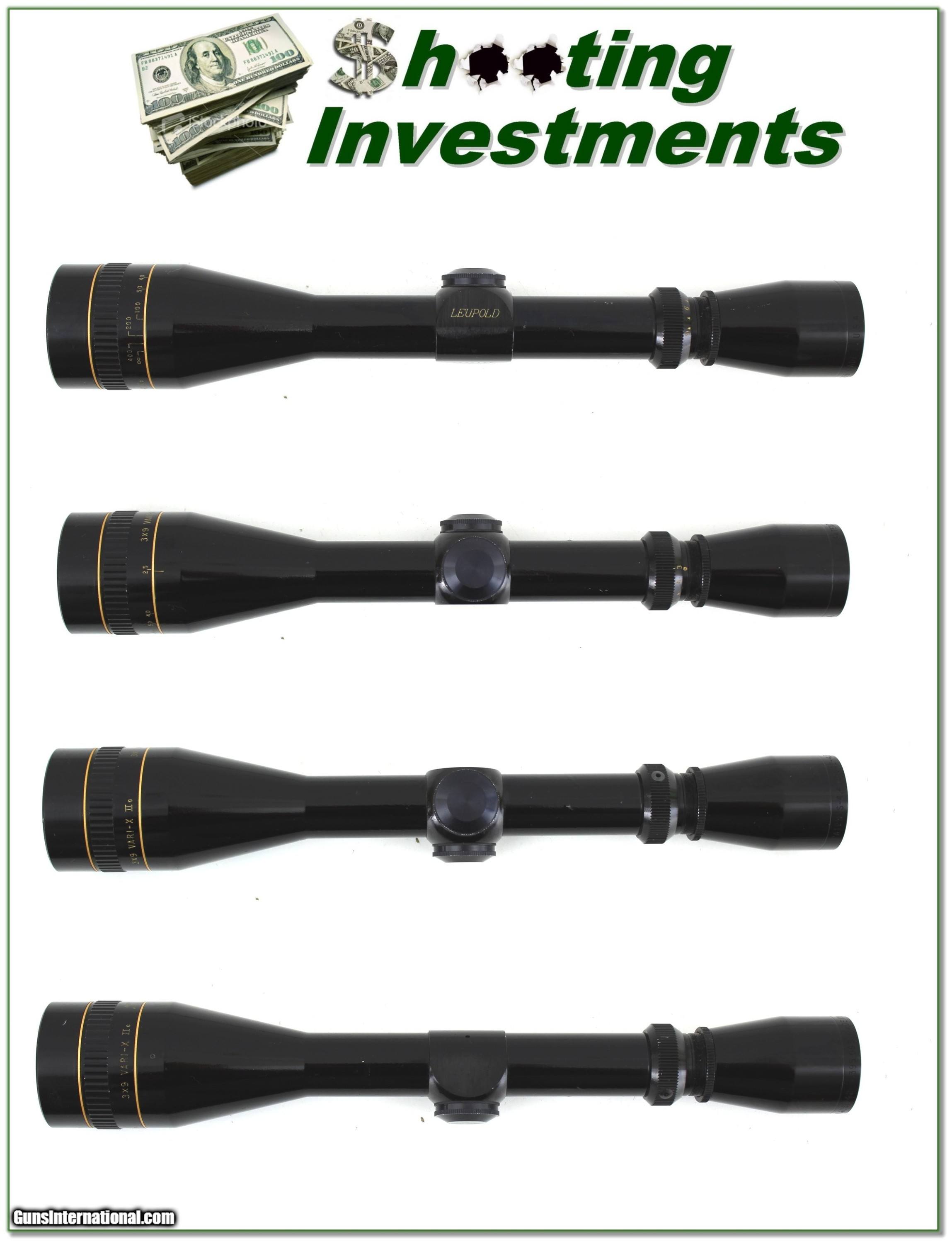 Description: This is a hard to find GLOSS Leupold Vari-X II 3-9 with AO scope. It has an Adjustable Objective and standard duplex crosshairs. The optics are crystal clear. It is in excellent condition. This will make a nice scope for your vintage or hunting rifle. Shipping is $14.95. Please email me with any questions or larger pictures. (Consign your quality firearms with Shooting Investments for only 12%! Let me know if you have any you would like to sell!) 21-0655s Payment: Payment is by Money Order, Cashier’s Check or Personal Check. I can now also accept Credit Cards (MasterCard, Visa, Discover & American Express) with a 3% convenience fee. Shipping: The shipping charge will be listed in each description. It is $39 for most firearms. Some heavy guns or those insured for over $2000 will be higher. Shipments to Alaska and Hawaii are higher because air shipment is required. Most firearms are shipped on Tuesday and Thursday and usually in 5 days of receipt of payment. We package all shipments carefully and insure them. Optics are shipped Priority Mail and most other non-firearm shipments are shipped First Class. Returns: Our return policy is simple. If for any reason you are not pleased with your purchase, you may return your item for a full refund of purchase price. Ammunition cannot be returned. It is important to us that you are happy. Guns cannot be fired or dissembled before returning them and they must be returned in the same condition as received. Notification of a return must occur within 3 days of receipt at your dealer. Shipping, convenience and dealer fees are not refundable and are the responsibility of the buyer. Lay-a-way: If needed, we offer a 60 day lay-a-way option on most firearms. It is 1/3 now, 1/3 in 30 days and 1/3 in 60 days. Lay-a-way firearm sales are final and cannot be returned. If a lay-a-way is not completed the first payment cannot be refunded. Consigning your firearms with Shooting Investments: We will help you get top dollar for your firearms. While most local guns shops charge 20% or more, our fee is only 12% with a minimum of $75. At your local gun shop it might take months to sell. Selling on-line provides instant access to thousands of interested buyers. You won’t find any other on-line dealer willing to sell your firearms for only 12% or listing every gun on 3 separate s. Selling through an House typically costs the seller 15% and the buyer an addition 15% (so 30%) and you have to wait several months to sell and longer to receive funds. If properly priced, we will sell your firearms within a few weeks. Send us an email or give us a call and we’ll explain how easy it is for you to get top dollar. Trading: Trading for us is really just buying your gun to re-sell. If you have a gun you want to trade, please email a picture and we will let you know what we can give for it. You will always get more if we sell it for you on consignment. Help for California Buyers: We are happy to ship to California. It is the buyer’s responsibility to make sure any item you buy is legal in your state. We are also happy to help with your purchase of a firearm from someone other than us. If you see a gun you would like to buy but the seller can’t or won’t ship to California they can ship to use and we’ll then ship it to your California dealer. The cost for this service is only $30 + shipping. Let us know if we can help! SOLD |
