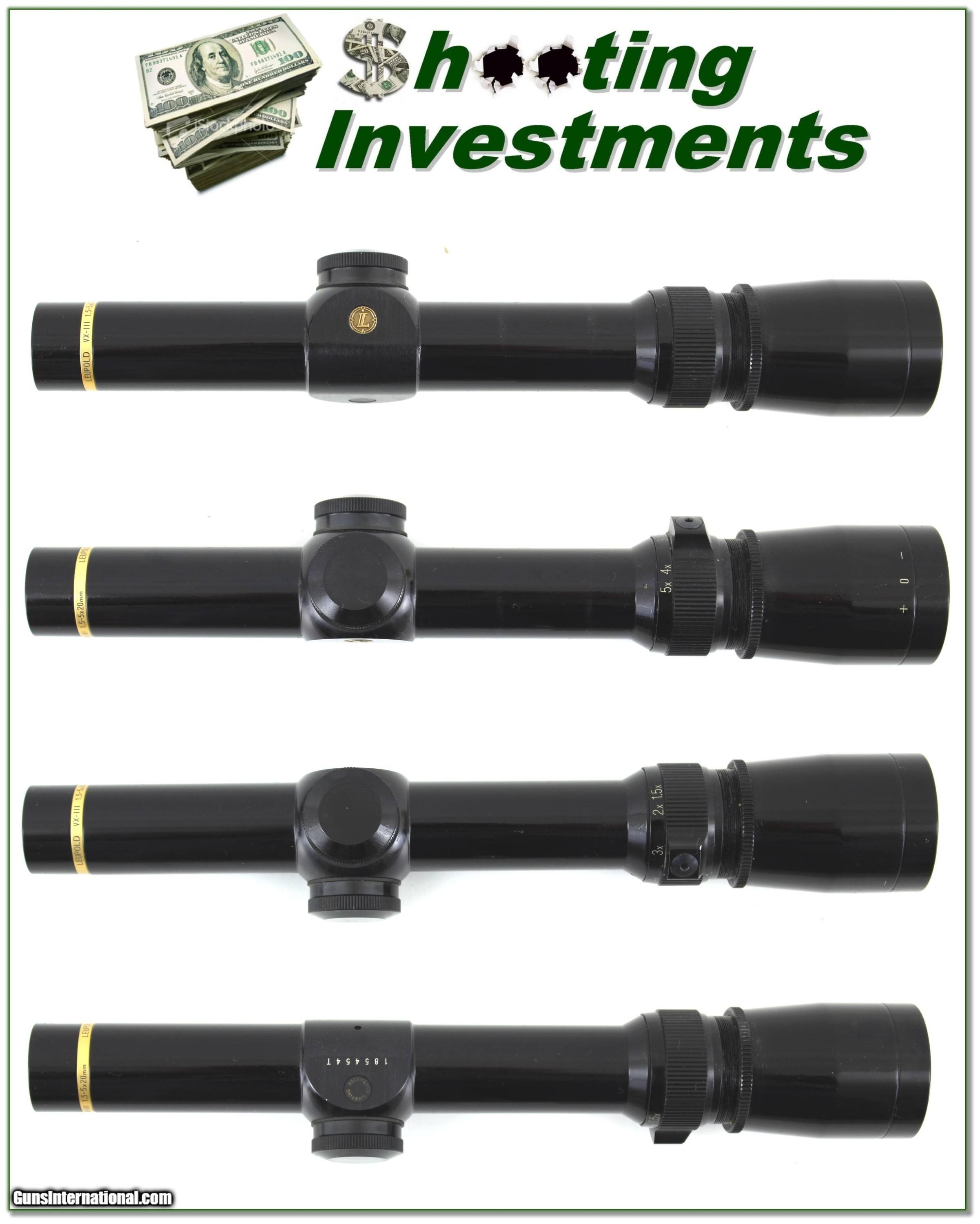 Description: This is a top of the line Leupold Vari-X III in 1.5 X 5 power. It is the harder to find GLOSS and is in excellent condition. The optics are crystal clear with duplex crosshair. I find just a couple ring scuffs that should be covered when mounted. Otherwise it looks new. Shipping is $14.95. Please email me with any questions or larger pictures. (Consign your quality firearms with Shooting Investments for only 12%! Let me know if you have any you would like to sell!) 20-0165s Payment: Payment is by Money Order, Cashiers Check or Personal Check. I can now also accept Credit Cards (MasterCard, Visa, Discover & American Express) with a 3% convenience fee. PayPal can be used for some items but never for firearms. Shipping: The shipping charge will be listed in each description. It is $39 for most firearms. Some heavy guns or those insured for over $2000 will be higher. Shipments to Alaska and Hawaii are higher because air shipment is required. Most firearms are shipped on Tuesday and Thursday and usually in 5 days of receipt of payment. We package all shipments carefully and insure them. Optics are shipped Priority Mail and most other non-firearm shipments are shipped First Class. Returns: Our return policy is simple. If for any reason you are not pleased with your purchase, you may return your item for a full refund of purchase price. Ammunition cannot be returned. It is important to us that you are happy. Guns cannot be fired or dissembled before returning them and they must be returned in the same condition as received. Notification of a return must occur with-in 3 days of receipt at your dealer. Shipping, convenience and dealer fees are not refundable and are the responsibility of the buyer. Lay-a-way: If needed, we offer a 60 day lay-a-way option on most firearms. It is 1/3 now, 1/3 in 30 days and 1/3 in 60 days. Lay-a-way firearm sales are final and if not completed the first payment cannot be returned. Consigning your firearms with Shooting Investments: We will help you get top dollar for your firearms. While most local guns shops charge 20% or more, our fee is only 12% with a minimum of $75. At your local gun shop it might take months to sell. Selling on-line provides instant access to thousands of interested buyers. You won’t find any other on-line dealer willing to sell your firearms for only 12% or listing every gun on 3 separate s. Selling through an House typically costs the seller 15% and the buyer an addition 15% (so 30%) and you have to wait several months to sell and longer to receive funds. If properly priced, we will sell your firearms in a few weeks. Send us an email or give us a call and we’ll explain how easy it is for you to get top dollar. Trading: Trading for use is really just buying your gun to re-sell. If you have a gun you want to trade, please email a picture and we will let you know what we can give or it. You will always get more if we sell it for you on consignment. Help for California Buyers: We are happy to ship to California. It is the buyer’s responsibility to make sure any item you buy is legal in your state. We are also happy to help with your purchase of a firearm from someone other than us. If you see a gun you would like to buy but the seller can’t or won’t ship to California they can ship to use and we’ll then ship it to your California dealer. The cost for this service is only $30 + shipping. Let us know if we can help! SOLD |