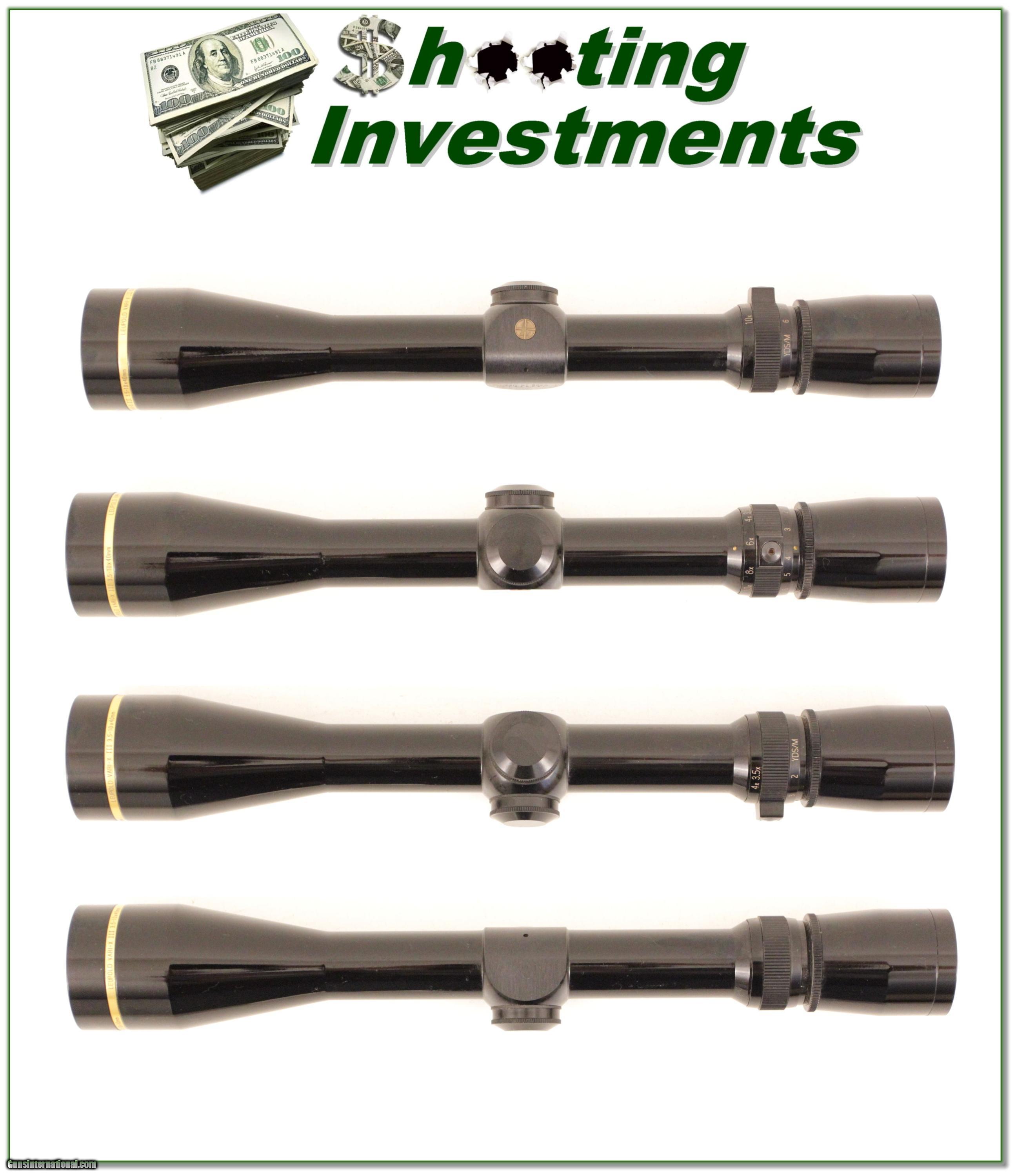 Description: This is a top of the line Leupold in 3.5-10 X 40mm. It has duplex crosshairs and crystal clear optics. It has the harder to find gloss finish and is in excellent condition with no marks of note. It will make a top quality scope for your Gloss rifle. And remember Leupolds forever warrantee. Shipping is $9.95 and please email me with any questions or larger pictures. (I now consign quality firearms only 10%! Let me know if you have any you would like to sell!) [16-1240s] Payment: Payment is by Money Order, Cashiers Check or Personal Check. I can now also accept MasterCard and Visa with a 3% convenience fee. PayPal can be used for some items but never firearms. Please let us know if you would like to pay via PayPal. Shipping: The shipping charge will be listed in each description. It is $35 for most guns. Some heavy guns or those insured for over $2000 will be higher. Shipments to Alaska and Hawaii are higher because air shipment is required. Most firearms are shipped within 5 days of receipt of payment. We prefer shipping at the beginning of the week to avoid firearms in transit over weekends. We package all shipments carefully and insure them for the full purchase price, rounded up to the next $100. In the unlikely event that damage occurs, it is important that you save all packaging material for the claims process. Optics are shipped Priority Mail and most other non-firearm shipments are shipped First Class. Returns: Our return policy is simple. If for any reason you are not pleased with your purchase, you may return your item for a refund. The only exception is ammunition, it cannot be returned. It is important to us that you are happy. Guns cannot be fired or dissembled before returning them and must be returned in the same condition as received. Notification of a return must occur with-in 3 days of receipt at your dealer. Shipping, convenience and dealer fees are not refundable and are the responsibility of the buyer. Lay-a-way: If needed, we offer a 60 day lay-a-way option on most firearms. It is 1/3 now, 1/3 in 30 days and 1/3 in 60 days. Lay-a-way firearm sales are final. Consigning your firearms with Shooting Investments: We will help you get top dollar for your firearms. While most local guns shops charge 20% or more, our fee is only 10% with a minimum of $50. At your local gun shop it might take months to sell. Selling on-line provides instant access to thousands of interested buyers. You won’t find any other on-line dealer willing to sell your firearms for only 10% or listing every gun on 4 separate s. Selling through an House typically costs the seller 15% and the buyer an addition 15% (so 30%) and you have to wait several months to sell and longer to receive funds. If properly priced, we will sell your firearms in a week or two. Send us an email or give us a call and we’ll explain how easy it is for you to get top dollar. Trading: We collect guns and usually just trade for guns we want to add to our collections. We often sell guns for others wanting to purchase one of ours. We find this the most fair to both of us. Our Commission is only 10% and we hold the gun you want until yours sells. Please contact us if you want to sell one of yours to buy one of ours. Help for California Buyers: We are happy to ship to California. It is the buyer’s responsibility to make sure any item you buy is legal in your state. We are also happy to help with your purchase of a firearm from someone other than us. If you see a gun you would like to buy but the seller can’t or won’t ship to California we can help. You buy the gun and have it shipped to us. We’ll then ship it to your California dealer. The cost for this service is only $30 + shipping. Let me know if we can help! SOLD |