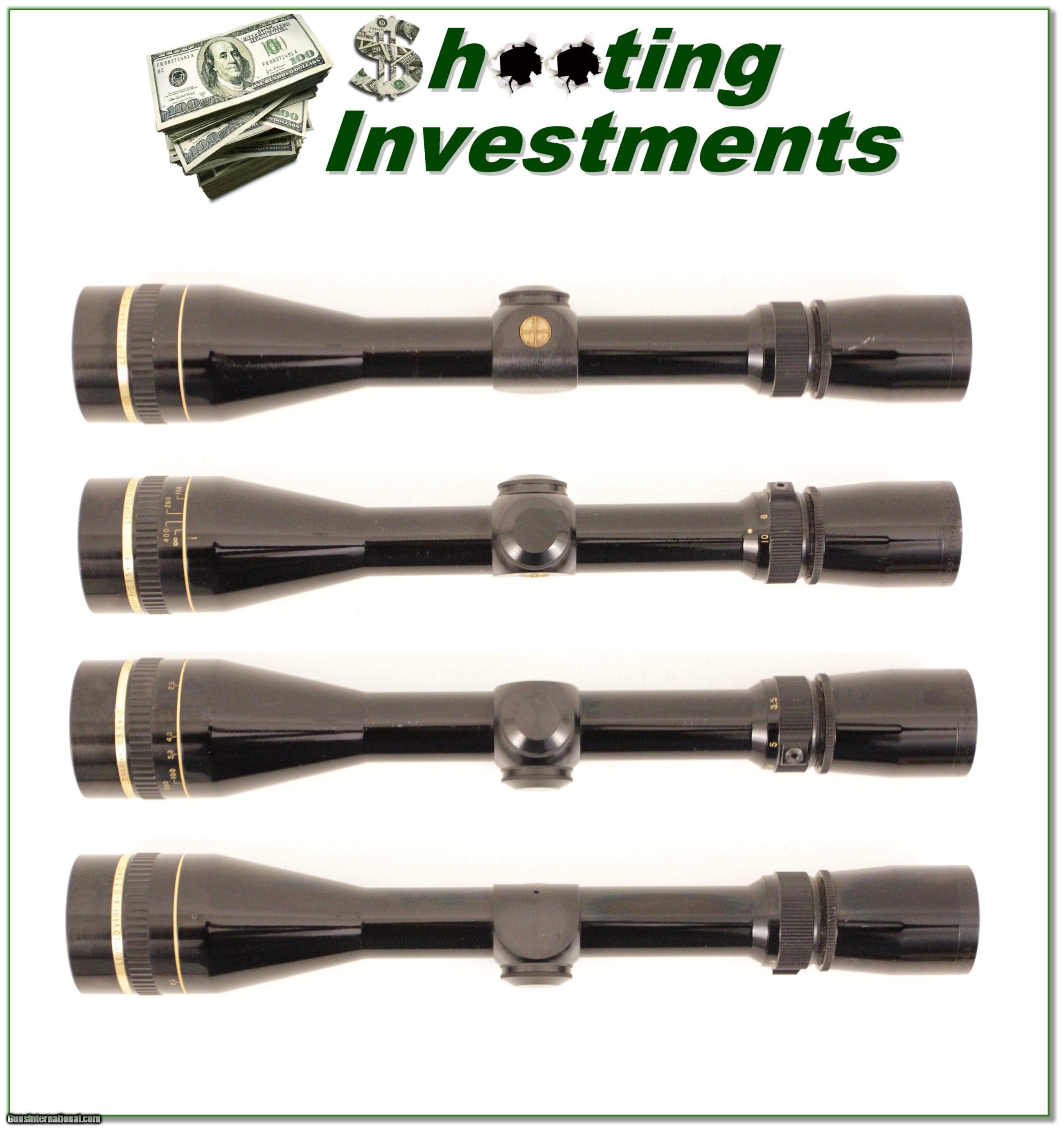 Description: This is an excellent condition 3.5-10X40mm Vari-X III scope with very hard to find gloss finish. It has AO and the optics are crystal clear with duplex crosshairs. This is the larger 50mm scope and is perfect for early morning or later after noon low-light hunting. There are only the slightest of ring scuffs that will be covered when mounted. And remember Leupold is warranted forever! Please email me with any questions or for larger photos. Shipping is $9.95 and please email me with any questions or larger pictures. (I now consign quality firearms only 10%! Let me know if you have any you would like to sell!) [16-1324s] Payment: Payment is by Money Order, Cashiers Check or Personal Check. I can now also accept MasterCard and Visa with a 3% convenience fee. PayPal can be used for some items but never firearms. Please let us know if you would like to pay via PayPal. Shipping: The shipping charge will be listed in each description. It is $35 for most guns. Some heavy guns or those insured for over $2000 will be higher. Shipments to Alaska and Hawaii are higher because air shipment is required. Most firearms are shipped within 5 days of receipt of payment. We prefer shipping at the beginning of the week to avoid firearms in transit over weekends. We package all shipments carefully and insure them for the full purchase price, rounded up to the next $100. In the unlikely event that damage occurs, it is important that you save all packaging material for the claims process. Optics are shipped Priority Mail and most other non-firearm shipments are shipped First Class. Returns: Our return policy is simple. If for any reason you are not pleased with your purchase, you may return your item for a refund. The only exception is ammunition, it cannot be returned. It is important to us that you are happy. Guns cannot be fired or dissembled before returning them and must be returned in the same condition as received. Notification of a return must occur with-in 3 days of receipt at your dealer. Shipping, convenience and dealer fees are not refundable and are the responsibility of the buyer. Lay-a-way: If needed, we offer a 60 day lay-a-way option on most firearms. It is 1/3 now, 1/3 in 30 days and 1/3 in 60 days. Lay-a-way firearm sales are final. Consigning your firearms with Shooting Investments: We will help you get top dollar for your firearms. While most local guns shops charge 20% or more, our fee is only 10% with a minimum of $50. At your local gun shop it might take months to sell. Selling on-line provides instant access to thousands of interested buyers. You won’t find any other on-line dealer willing to sell your firearms for only 10% or listing every gun on 4 separate s. Selling through an House typically costs the seller 15% and the buyer an addition 15% (so 30%) and you have to wait several months to sell and longer to receive funds. If properly priced, we will sell your firearms in a week or two. Send us an email or give us a call and we’ll explain how easy it is for you to get top dollar. Trading: We collect guns and usually just trade for guns we want to add to our collections. We often sell guns for others wanting to purchase one of ours. We find this the most fair to both of us. Our Commission is only 10% and we hold the gun you want until yours sells. Please contact us if you want to sell one of yours to buy one of ours. Help for California Buyers: We are happy to ship to California. It is the buyer’s responsibility to make sure any item you buy is legal in your state. We are also happy to help with your purchase of a firearm from someone other than us. If you see a gun you would like to buy but the seller can’t or won’t ship to California we can help. You buy the gun and have it shipped to us. We’ll then ship it to your California dealer. The cost for this service is only $30 + shipping. Let me know if we can help! SOLD |
