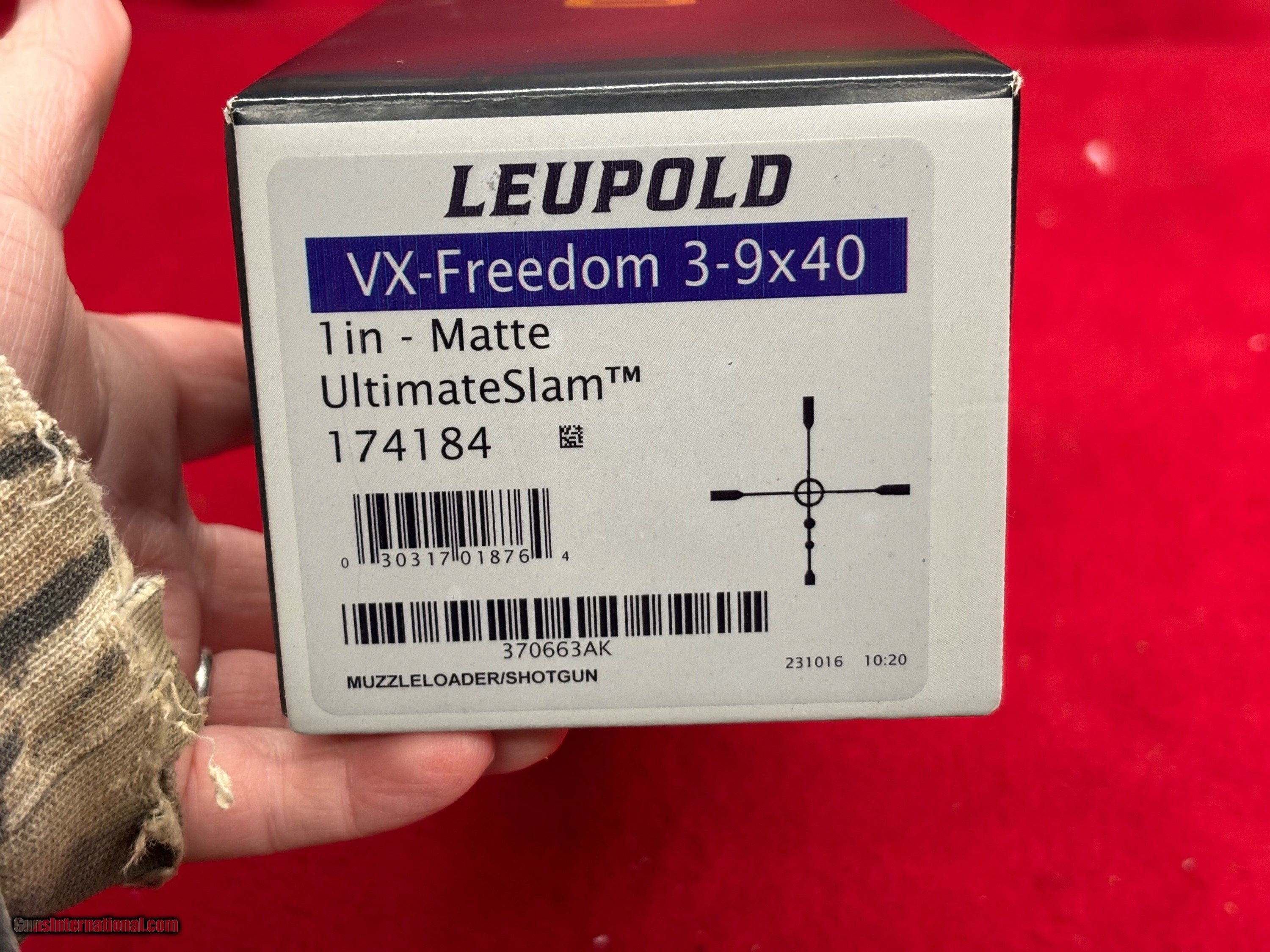 Description: Leupold VX-Freedom 3-9x40 Scope for Muzzle Loaders or Shotguns Open display in our shop........scope is new in box.......do NOT have the paperwork. Never put on a weapon.....BRAND NEW 1 inch Matte Finish.....for Muzzle Loaders or Shotguns..not caliber specific Reticle builds on the Leupold designed duplex reticle.....tailored specifically to muzzleloaders and shotguns uses a 100 yard zero...accurate aiming points out to 300 yards. Marks on the power selector help users tune the reticle for their specific load....intended to be used on highest magnification in rear or 2nd focal plane scope. $229.00 $16.00 to ship If you are WEST of the Mississippi shipping will be $10.00 extra Thank you for looking at our items. If it is listed on the site and not marked "Sale Pending" or "Sold ", we still have it in the shop. If you wish to buy, hit buy it now and call the shop to pay. We are open Monday thru Friday 10:00am-3:00pm EST ...........Ask for Bree....... (803) 874-1060. Please CALL the shop first if you are in California. You need to verify you can have this weapon, since we DO NOT accept returns from California. THERE IS A 3.5% CARD FEE. NO INTERNATIONAL SALES SOLD |