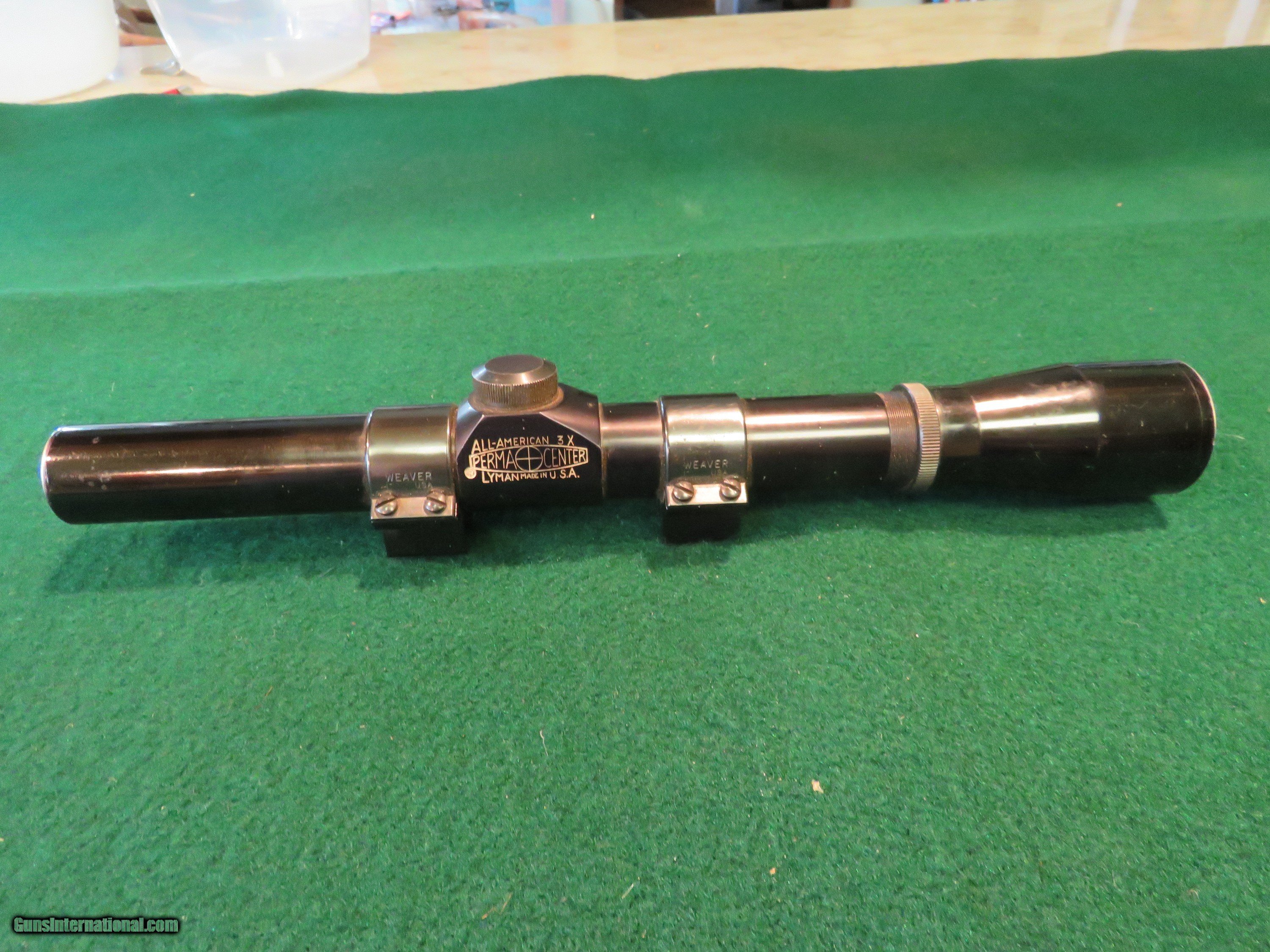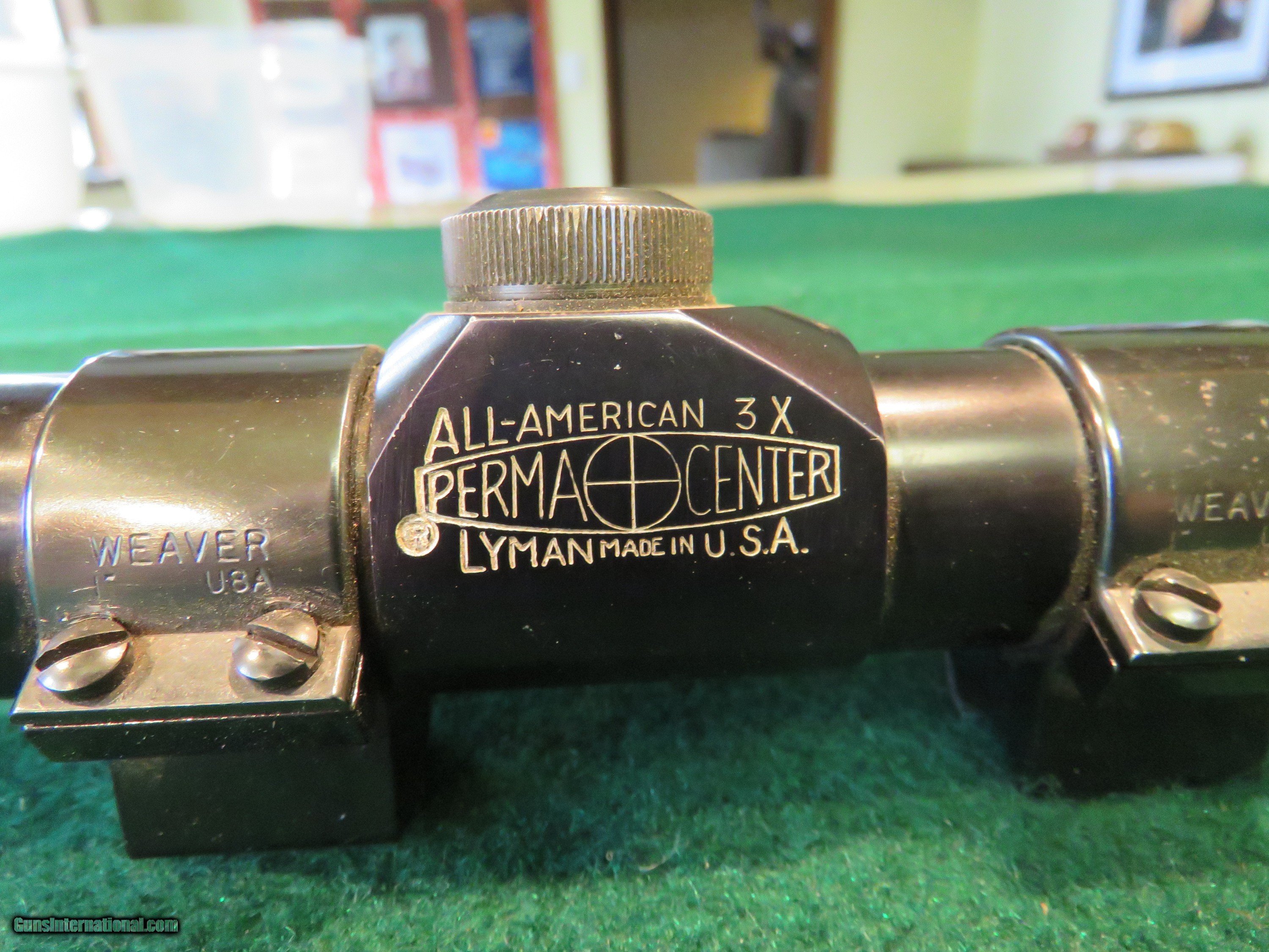 Description: Lyman All-American Perma Center 3x Scope, cross hair reticle with Weaver 22 Dovetail Rings. Some handling marks, but in overall excellent conditions. Glass is clear & Bright. $125.00 Shipping $10.00 SOLD |