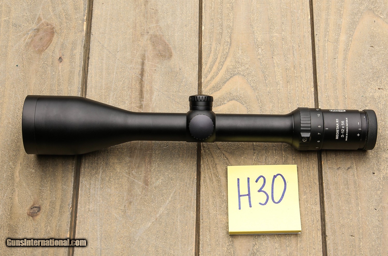 Meopta Meostar R1 3–12x56 scope with a 30mm tube and matte finish. Features the 4B reticle, ¼ MOA click adjustments, and a second focal plane design. Weight is 22 oz. Slight ring marks, excellent condition, great optics.