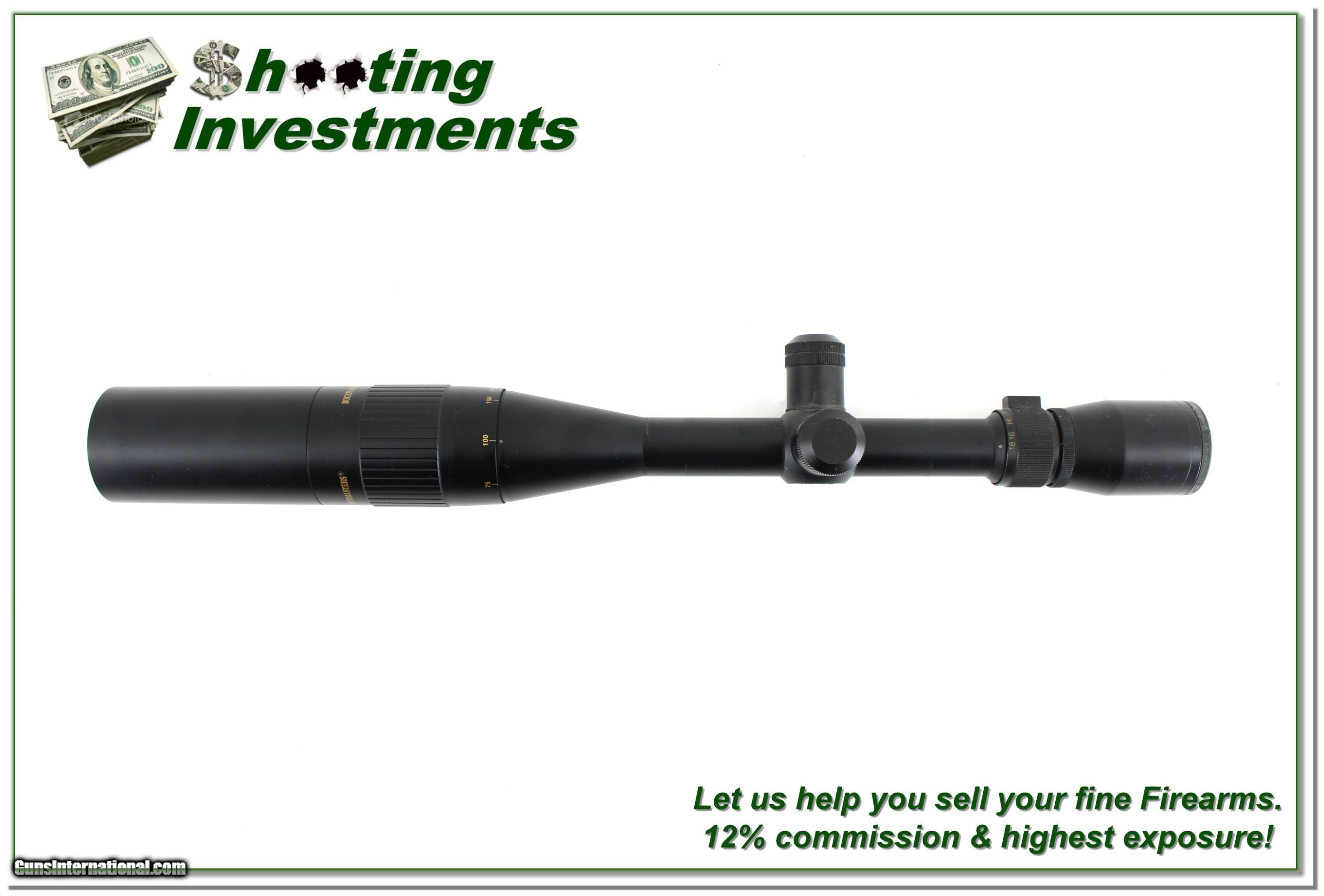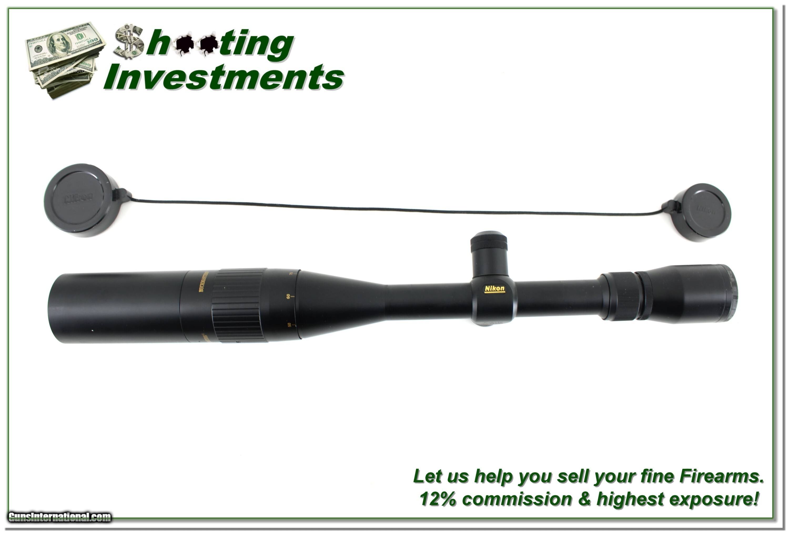 Description: This is an excellent condition Nikon rifle scope. It is a 6-18 power with target turrets, AO and matte finish. It has crystal clear optics with Duplex crosshair. I don’t find any marks and it comes with sunshield and covers as seen. Shipping is $14.95. Please email me with any questions or larger pictures. (Consign your quality firearms with Shooting Investments for only 12%! Let me know if you have any you would like to sell!) 26-0003s