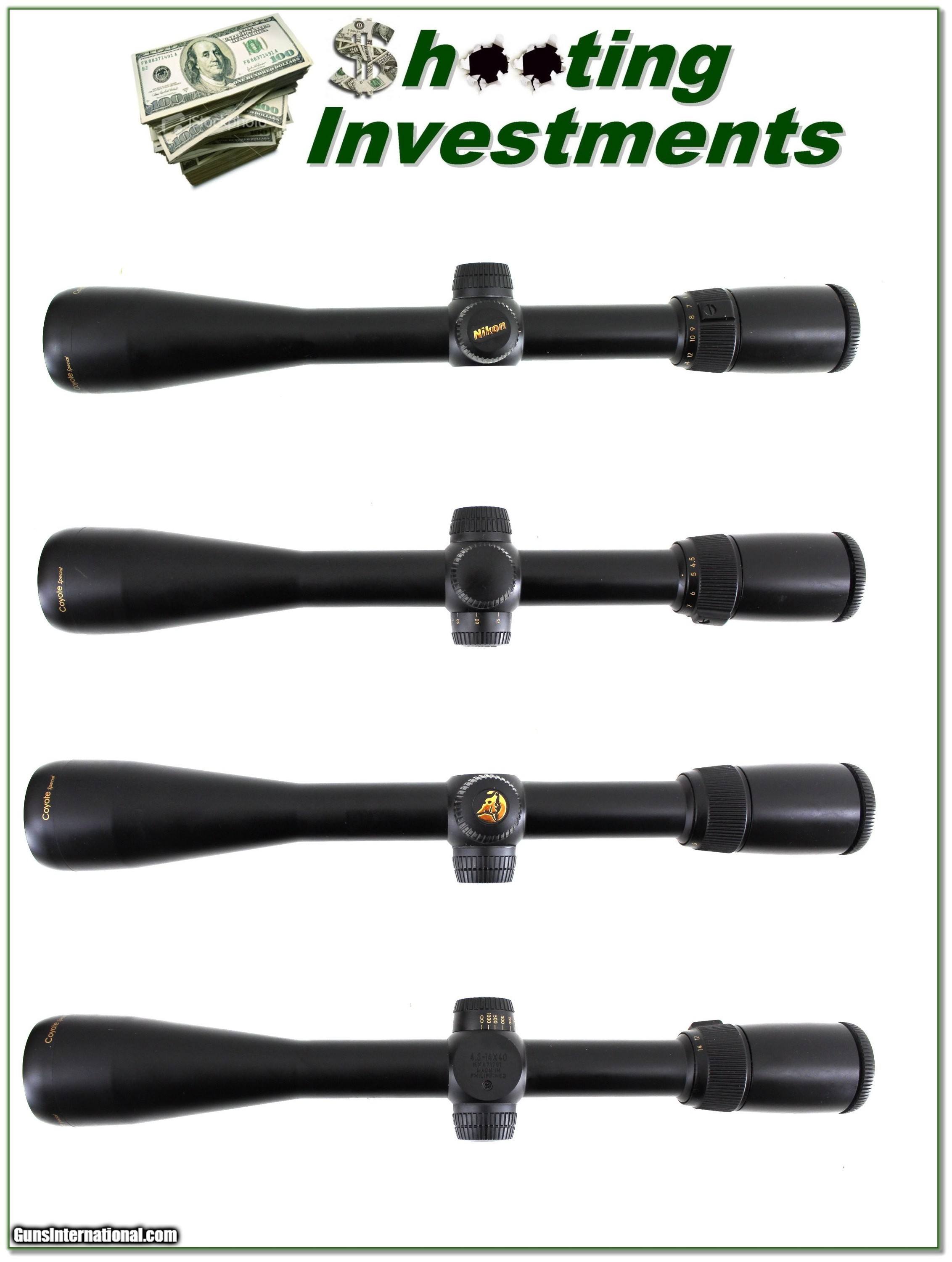 Description: This is a like new and no longer made Nikon 4.5-14 x 4mm. The new Nikon Coyote Special Rifle Scope is the perfect rifle scope for predator hunting. It features a new Predator BDC reticle designed specifically for predator hunting and comes standard with an ARD (anti reflective device) which eliminates glare. The multi-coated lenses provide up to 92% light transmission which will allow for hunting from dawn until dusk. Other features of the Coyote Special include 1/4 MOA adjustments, a quick focus eyepiece and generous eye relief. Shipping is $14.95. Please email me with any questions or larger pictures. (Consign your quality firearms with Shooting Investments for only 12%! Let me know if you have any you would like to sell!) 24-1028s Payment: Payment is by Money Order, Cashier’s Check or Personal Check. I can now also accept Credit Cards (MasterCard, Visa, Discover & American Express) with a 3% convenience fee. Shipping: The shipping charge will be listed in each description. It is $49 for most firearms. Some heavy guns or those insured for over $2000 will be higher. Shipments to Alaska and Hawaii are higher because air shipment is required. Most firearms are shipped on Tuesday and Thursday and usually in 5 days of receipt of payment. We package all shipments carefully and insure them. Optics are shipped Priority Mail and most other non-firearm shipments are shipped First Class. Returns: Our return policy is simple. If for any reason you are not pleased with your purchase, you may return your item for a full refund of purchase price. Ammunition cannot be returned. It is important to us that you are happy. Guns cannot be fired or dissembled before returning them and they must be returned in the same condition as received. Notification of a return must occur within 3 days of receipt at your dealer. Shipping, convenience and dealer fees are not refundable and are the responsibility of the buyer. Lay-a-way: If needed, we offer a 60 day lay-a-way option on most firearms. It is 1/3 now, 1/3 in 30 days and 1/3 in 60 days. Lay-a-way firearm sales are final and cannot be returned. If a lay-a-way is not completed the first payment cannot be refunded. Consigning your firearms with Shooting Investments: We will help you get top dollar for your firearms. While most local guns shops charge 20% or more, our fee is only 12% with a minimum of $75. At your local gun shop it might take months to sell. Selling on-line provides instant access to thousands of interested buyers. You won’t find any other on-line dealer willing to sell your firearms for only 12% or listing every gun on 3 separate s. Selling through an House typically costs the seller 15% and the buyer an addition 15% (so 30%) and you have to wait several months to sell and longer to receive funds. If properly priced, we will sell your firearms within a few weeks. Send us an email or give us a call and we’ll explain how easy it is for you to get top dollar. Trading: Trading for us is really just buying your gun to re-sell. If you have a gun you want to trade, please email a picture and we will let you know what we can give for it. You will always get more if we sell it for you on consignment. SOLD |