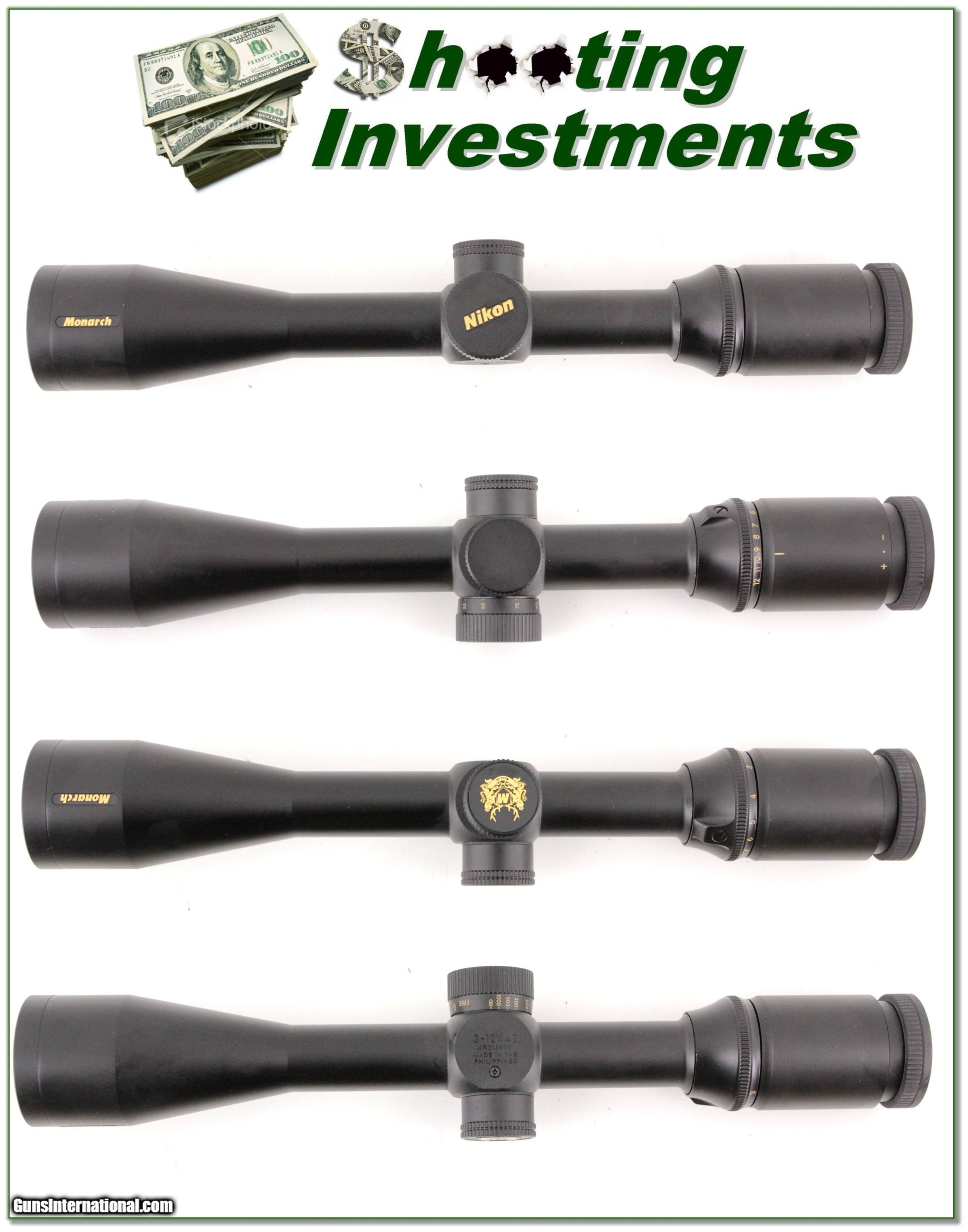 Description: This is a Nikon top of the line Monarch in 2-12 power with 42mm Objective and side AO. It looks new. It has crystal clear glass with Duplex crosshairs. The current discounted price for this scope is $425! Shipping is $11.95. Please email me with any questions or larger pictures. (Consign your quality firearms with Shooting Investments for only 12%! Let me know if you have any you would like to sell!) 19-0732s Payment: Payment is by Money Order, Cashiers Check or Personal Check. I can now also accept MasterCard and Visa with a 3% convenience fee. PayPal can be used for some items but never firearms. Please let us know if you would like to pay via PayPal. Shipping: The shipping charge will be listed in each description. It is $39 for most guns. Some heavy guns or those insured for over $2000 will be higher. Shipments to Alaska and Hawaii are higher because air shipment is required. Most firearms are shipped on Tuesday and Thursday and usually in 5 days of receipt of payment. We package all shipments carefully and insure them. Returns: Our return policy is simple. If for any reason you are not pleased with your purchase, you may return your item for a full refund of purchase price. Ammunition cannot be returned. It is important to us that you are happy. Guns cannot be fired or dissembled before returning them and they must be returned in the same condition as received. Notification of a return must occur with-in 3 days of receipt at your dealer. Shipping, convenience and dealer fees are not refundable and are the responsibility of the buyer. Lay-a-way: If needed, we offer a 60 day lay-a-way option on most firearms. It is 1/3 now, 1/3 in 30 days and 1/3 in 60 days. Lay-a-way firearm sales are final and if not completed the first payment cannot be returned. Consigning your firearms with Shooting Investments: We will help you get top dollar for your firearms. While most local guns shops charge 20% or more, our fee is only 12% with a minimum of $75. At your local gun shop it might take months to sell. Selling on-line provides instant access to thousands of interested buyers. You won’t find any other on-line dealer willing to sell your firearms for only 12% or listing every gun on 3 separate s. Selling through an House typically costs the seller 15% and the buyer an addition 15% (so 30%) and you have to wait several months to sell and longer to receive funds. If properly priced, we will sell your firearms in a few weeks. Send us an email or give us a call and we’ll explain how easy it is for you to get top dollar. Trading: Trading for use is really just buying your gun to re-sell. If you have a gun you want to trade, please email a picture and we will let you know what we can give or it. You will always get more if we sell it for you on consignment. Help for California Buyers: We are happy to ship to California. It is the buyer’s responsibility to make sure any item you buy is legal in your state. We are also happy to help with your purchase of a firearm from someone other than us. If you see a gun you would like to buy but the seller can’t or won’t ship to California they can ship to use and we’ll then ship it to your California dealer. The cost for this service is only $30 + shipping. Let us know if we can help! SOLD |