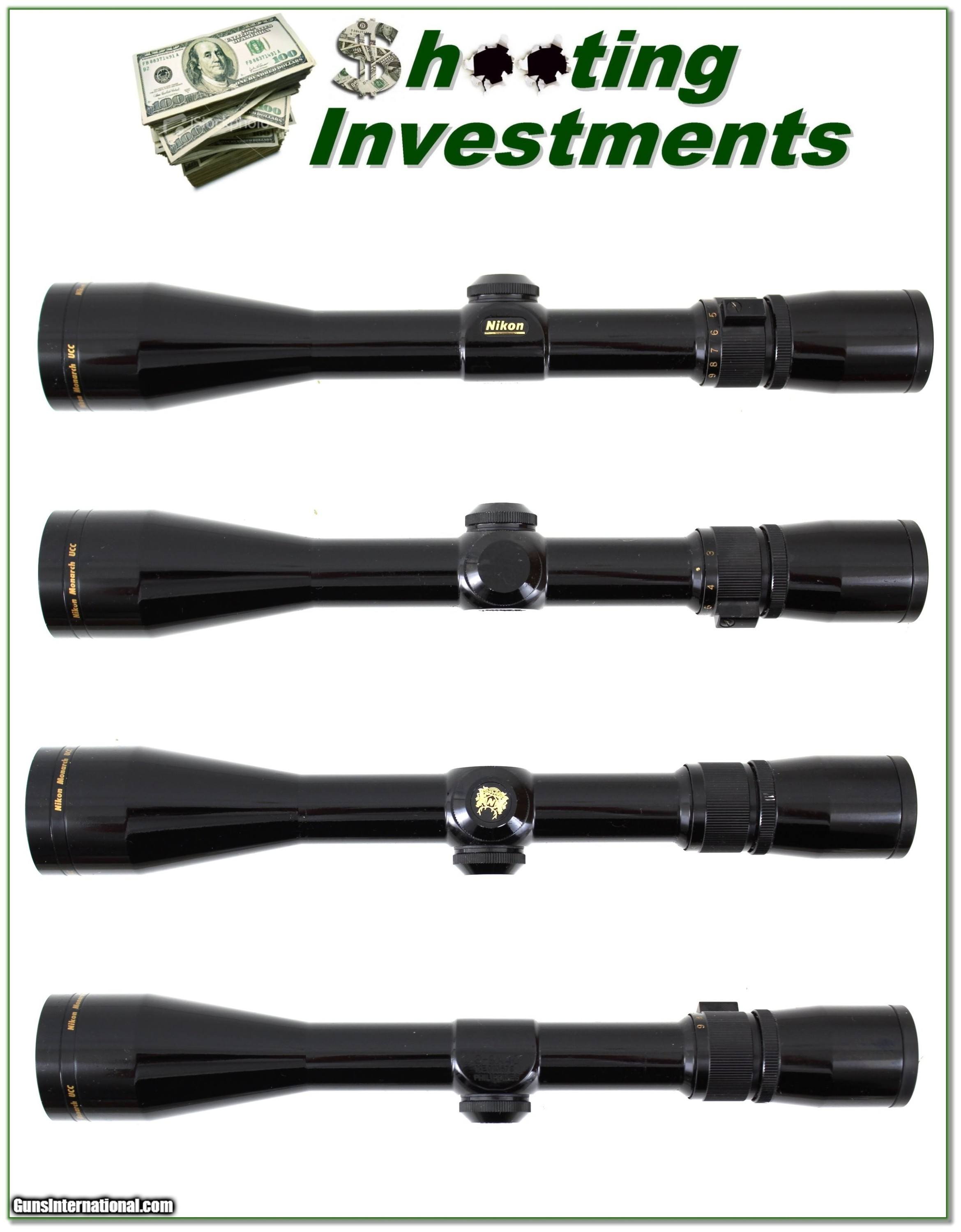 Description: This is a top-quality Nikon Monarch scope. It is a 3-9 power. It is no loner made GLOSS finish and has crystal clear optics with duplex crosshairs. It looks new with no marks. It will look nice on any rifle. Please email me with any questions or for larger photos. Shipping is $14.95 and please email me with any questions or larger pictures. (Consign your quality firearms with Shooting Investments for only 12%! Let me know if you have any you would like to sell!) 20-0558s Payment: Payment is by Money Order, Cashiers Check or Personal Check. I can now also accept Credit Cards (MasterCard, Visa, Discover & American Express) with a 3% convenience fee. PayPal can be used for some items but never for firearms. Shipping: The shipping charge will be listed in each description. It is $39 for most firearms. Some heavy guns or those insured for over $2000 will be higher. Shipments to Alaska and Hawaii are higher because air shipment is required. Most firearms are shipped on Tuesday and Thursday and usually in 5 days of receipt of payment. We package all shipments carefully and insure them. Optics are shipped Priority Mail and most other non-firearm shipments are shipped First Class. Returns: Our return policy is simple. If for any reason you are not pleased with your purchase, you may return your item for a full refund of purchase price. Ammunition cannot be returned. It is important to us that you are happy. Guns cannot be fired or dissembled before returning them and they must be returned in the same condition as received. Notification of a return must occur with-in 3 days of receipt at your dealer. Shipping, convenience and dealer fees are not refundable and are the responsibility of the buyer. Lay-a-way: If needed, we offer a 60 day lay-a-way option on most firearms. It is 1/3 now, 1/3 in 30 days and 1/3 in 60 days. Lay-a-way firearm sales are final and if not completed the first payment cannot be returned. Consigning your firearms with Shooting Investments: We will help you get top dollar for your firearms. While most local guns shops charge 20% or more, our fee is only 12% with a minimum of $75. At your local gun shop it might take months to sell. Selling on-line provides instant access to thousands of interested buyers. You won’t find any other on-line dealer willing to sell your firearms for only 12% or listing every gun on 3 separate s. Selling through an House typically costs the seller 15% and the buyer an addition 15% (so 30%) and you have to wait several months to sell and longer to receive funds. If properly priced, we will sell your firearms in a few weeks. Send us an email or give us a call and we’ll explain how easy it is for you to get top dollar. Trading: Trading for use is really just buying your gun to re-sell. If you have a gun you want to trade, please email a picture and we will let you know what we can give or it. You will always get more if we sell it for you on consignment. Help for California Buyers: We are happy to ship to California. It is the buyer’s responsibility to make sure any item you buy is legal in your state. We are also happy to help with your purchase of a firearm from someone other than us. If you see a gun you would like to buy but the seller can’t or won’t ship to California they can ship to use and we’ll then ship it to your California dealer. The cost for this service is only $30 + shipping. Let us know if we can help! SOLD |