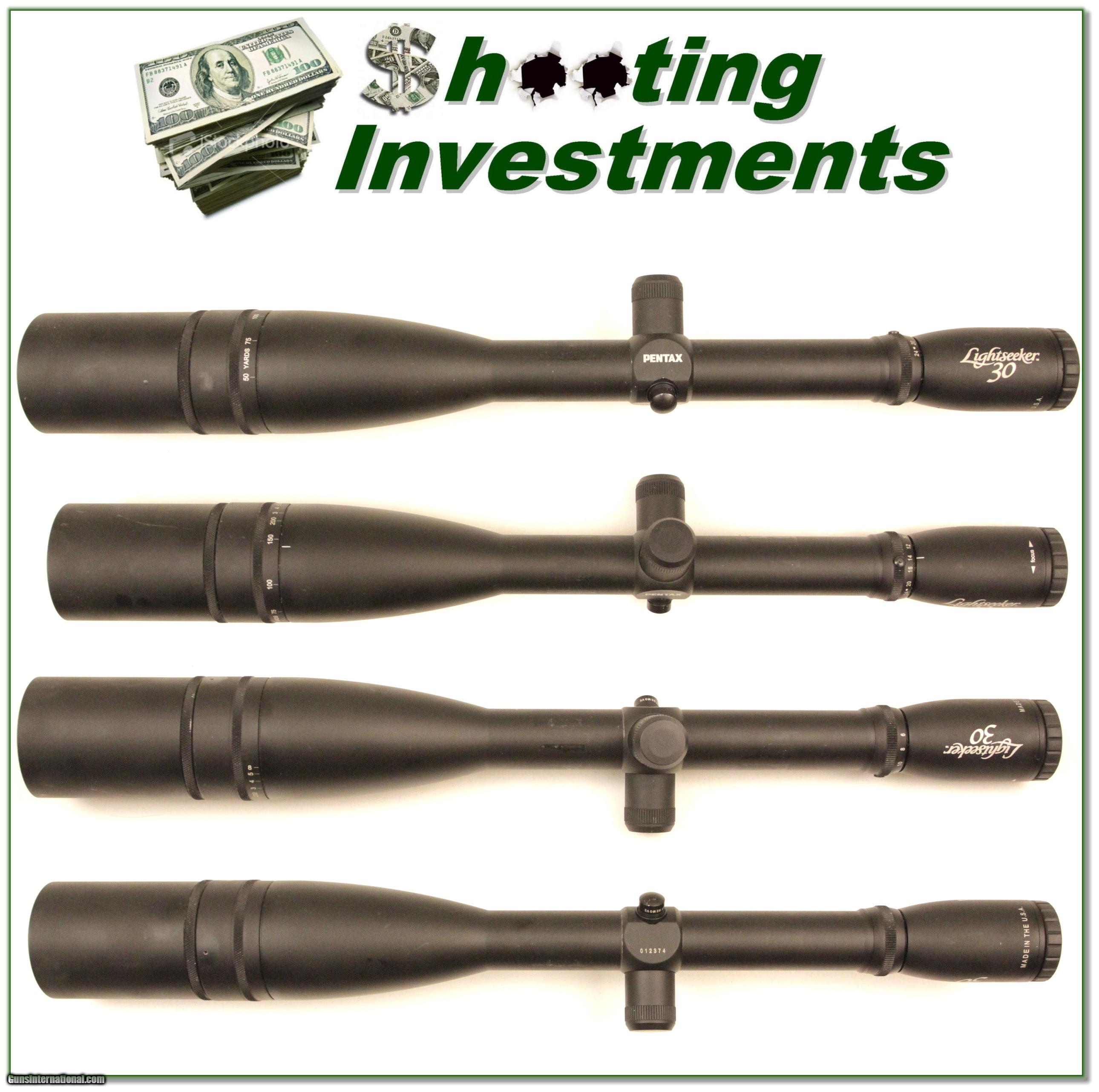 Description: This is a high end Pentax Lightseeker 30. These are 30mm scopes and this one is 624x50mm power. It has Mil-dot crosshairs, AO and comes with sunshield as shown. It is in excellent condition. These sold for about $700! It will make a very nice scope for a long-range gun! Please email me with any questions or for larger photos. Shipping with insurance is $9.95. (I now consign quality firearms only 10%! Let me know if you have any you would like to sell!) [16-0319s] Payment: Payment is by Money Order, Cashiers Check or Personal Check. I can now also accept MasterCard and Visa with a 3% convenience fee. PayPal can be used for some items but never firearms. Please let us know if you would like to pay via PayPal. Shipping: The shipping charge will be listed in each description. It is $35 for most guns. Some heavy guns or those insured for over $2000 will be higher. Shipments to Alaska and Hawaii are higher because air shipment is required. Most firearms are shipped within 5 days of receipt of payment. We prefer shipping at the beginning of the week to avoid firearms in transit over weekends. We package all shipments carefully and insure them for the full purchase price, rounded up to the next $100. In the unlikely event that damage occurs, it is important that you save all packaging material for the claims process. Optics are shipped Priority Mail and most other non-firearm shipments are shipped First Class. Returns: Our return policy is simple. If for any reason you are not pleased with your purchase, you may return your item for a refund. The only exception is ammunition, it cannot be returned. It is important to us that you are happy. Guns cannot be fired or dissembled before returning them and must be returned in the same condition as received. Notification of a return must occur with-in 3 days of receipt at your dealer. Shipping, convenience and dealer fees are not refundable and are the responsibility of the buyer. Lay-a-way: If needed, we offer a 60 day lay-a-way option on most firearms. It is 1/3 now, 1/3 in 30 days and 1/3 in 60 days. Lay-a-way firearm sales are final. Consigning your firearms with Shooting Investments: We will help you get top dollar for your firearms. While most local guns shops charge 20% or more, our fee is only 10% with a minimum of $50. At your local gun shop it might take months to sell. Selling on-line provides instant access to thousands of interested buyers. You won’t find any other on-line dealer willing to sell your firearms for only 10% or listing every gun on 4 separate s. Selling through an House typically costs the seller 15% and the buyer an addition 15% (so 30%) and you have to wait several months to sell and longer to receive funds. If properly priced, we will sell your firearms in a week or two. Send us an email or give us a call and we’ll explain how easy it is for you to get top dollar. Trading: We collect guns and usually just trade for guns we want to add to our collections. We often sell guns for others wanting to purchase one of ours. We find this the most fair to both of us. Our Commission is only 10% and we hold the gun you want until yours sells. Please contact us if you want to sell one of yours to buy one of ours. Help for California Buyers: We are happy to ship to California. It is the buyer’s responsibility to make sure any item you buy is legal in your state. We are also happy to help with your purchase of a firearm from someone other than us. If you see a gun you would like to buy but the seller can’t or won’t ship to California we can help. You buy the gun and have it shipped to us. We’ll then ship it to your California dealer. The cost for this service is only $30 + shipping. Let me know if we can help! SOLD |