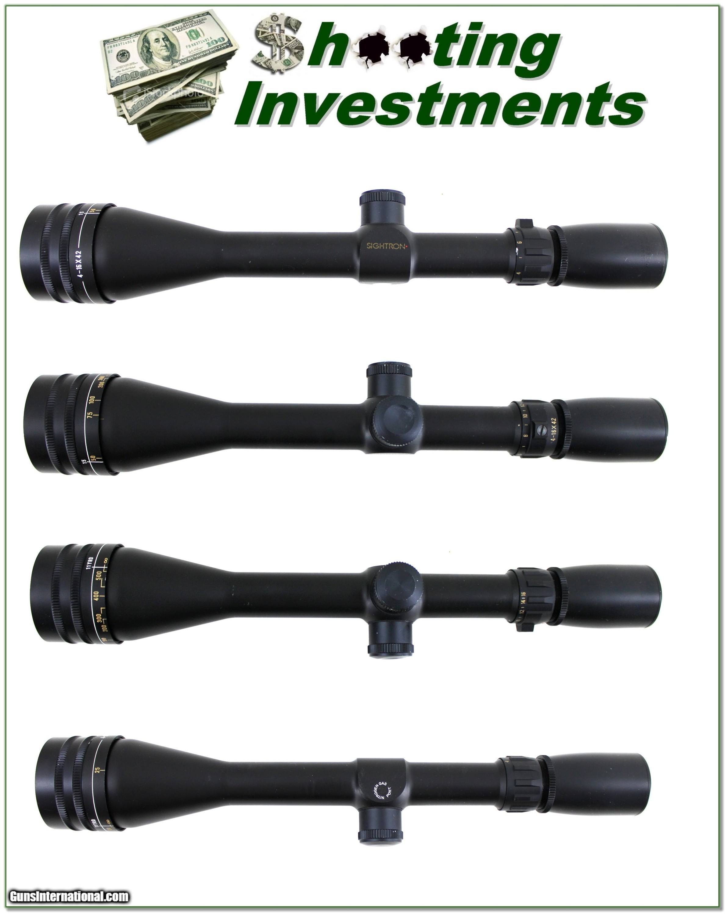 Description: This is a Sightron rifle scope in 4-16 power with 42mm Adjustable Objective. The glass is crystal clear. It has a matte finish with just a few marks. These had a list price of over $500 and are excellent optics! Shipping is $14.95 and please email me with any questions or larger pictures. (Consign your quality firearms with Shooting Investments for only 12%! Let me know if you have any you would like to sell!) 25-0506s Payment: Payment is by Money Order, Cashier’s Check or Personal Check. I can now also accept Credit Cards (MasterCard, Visa, Discover & American Express) with a 3% convenience fee. Shipping: The shipping charge will be listed in each description. It is $49 for most firearms. Some heavy guns or those insured for over $2000 will be higher. Shipments to Alaska and Hawaii are higher because air shipment is required. Most firearms are shipped on Tuesday and Thursday and usually in 5 days of receipt of payment. We package all shipments carefully and insure them. Optics are shipped Priority Mail and most other non-firearm shipments are shipped First Class. Returns: Our return policy is simple. If for any reason you are not pleased with your purchase, you may return your item for a full refund of purchase price. Ammunition cannot be returned. It is important to us that you are happy. Guns cannot be fired or dissembled before returning them and they must be returned in the same condition as received. Notification of a return must occur within 3 days of receipt at your dealer. Shipping, convenience and dealer fees are not refundable and are the responsibility of the buyer. Lay-a-way: If needed, we offer a 60 day lay-a-way option on most firearms. It is 1/3 now, 1/3 in 30 days and 1/3 in 60 days. Lay-a-way firearm sales are final and cannot be returned. If a lay-a-way is not completed the first payment cannot be refunded. Consigning your firearms with Shooting Investments: We will help you get top dollar for your firearms. While most local guns shops charge 20% or more, our fee is only 12% with a minimum of $100. At your local gun shop it might take months to sell. Selling on-line provides instant access to thousands of interested buyers. You won’t find any other on-line dealer willing to sell your firearms for only 12% or listing every gun on 3 separate s. Selling through an House typically costs the seller 15% and the buyer an addition 15% (so 30%) and you have to wait several months to sell and longer to receive funds. If properly priced, we will sell your firearms within a few weeks. Send us an email or give us a call and we’ll explain how easy it is for you to get top dollar. Trading: Trading for us is really just buying your gun to re-sell. If you have a gun you want to trade, please email a picture and we will let you know what we can give for it. You will always get more if we sell it for you on consignment. SOLD |