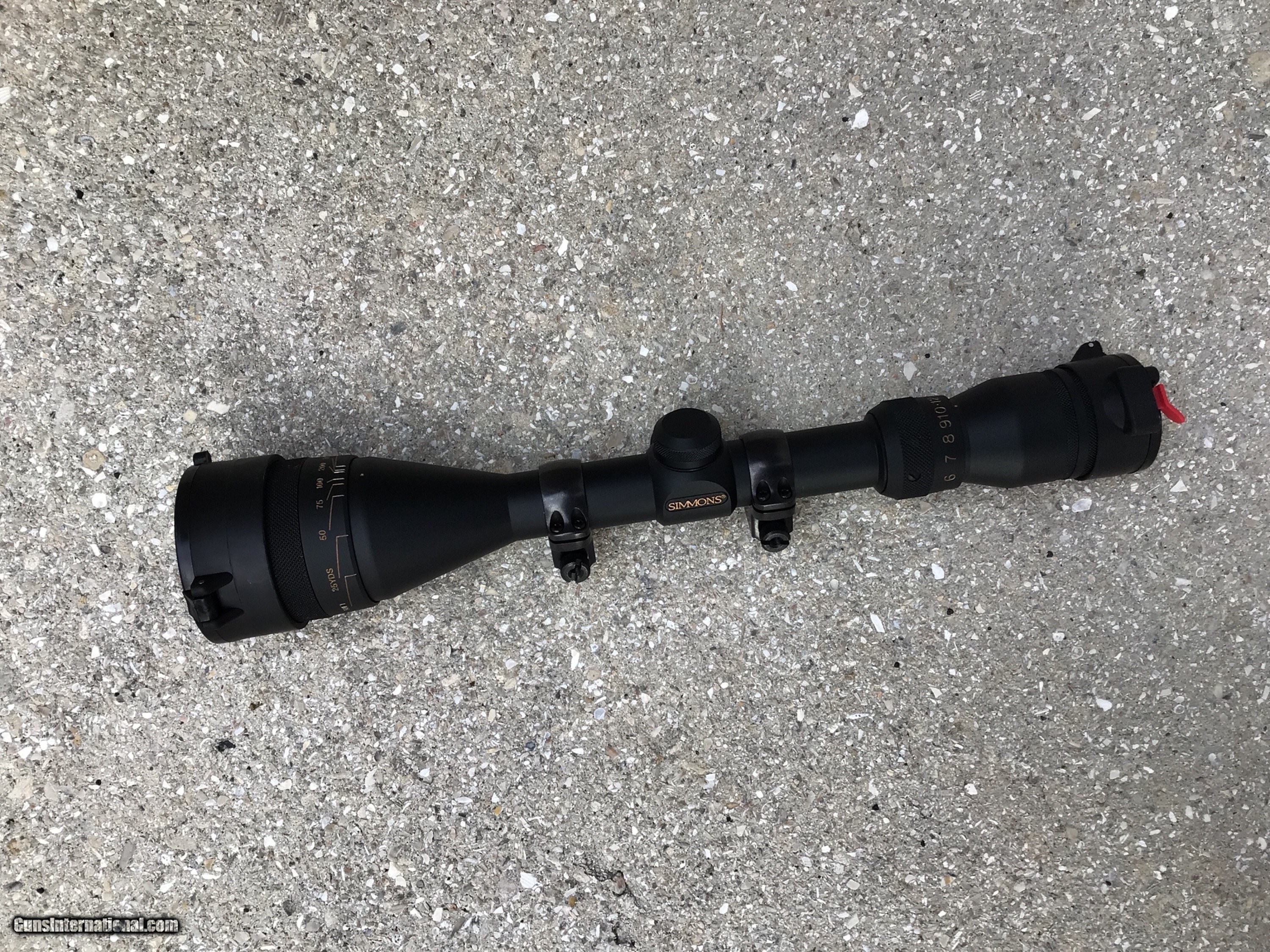SIMMONS 4X-12X-44 VARIABLE, WIDE ANGLE, OUTSIDE OBJECTIVE, DUPLEX CROSSHAIRS, COMES WITH RINGS & MOUNT & BUTLER CREEK FLIP UP LENS PROTECTORS
