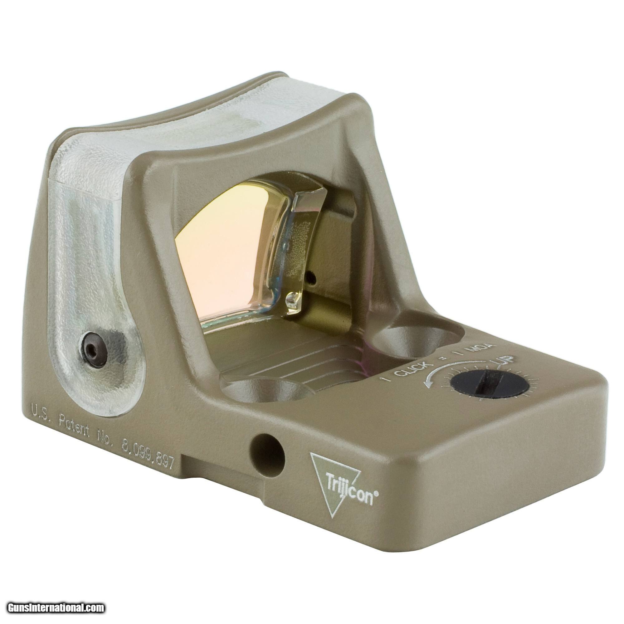 Description: Trijicon, RMR, Dual Illumination, 12.9 MOA Green Triangle, Flat Dark Earth MFG MDL #: RM08-C-700282 UPC: 719307611849 The Dual-Illuminated RMR uses fiber optics and tritium to illuminate the reticle. Fiber optics collect ambient light, automatically adjusting the reticle brightness. In situations with no (or low) light, the tritium illuminates the reticle. This version is popular with shooters who prefer a battery-free solution