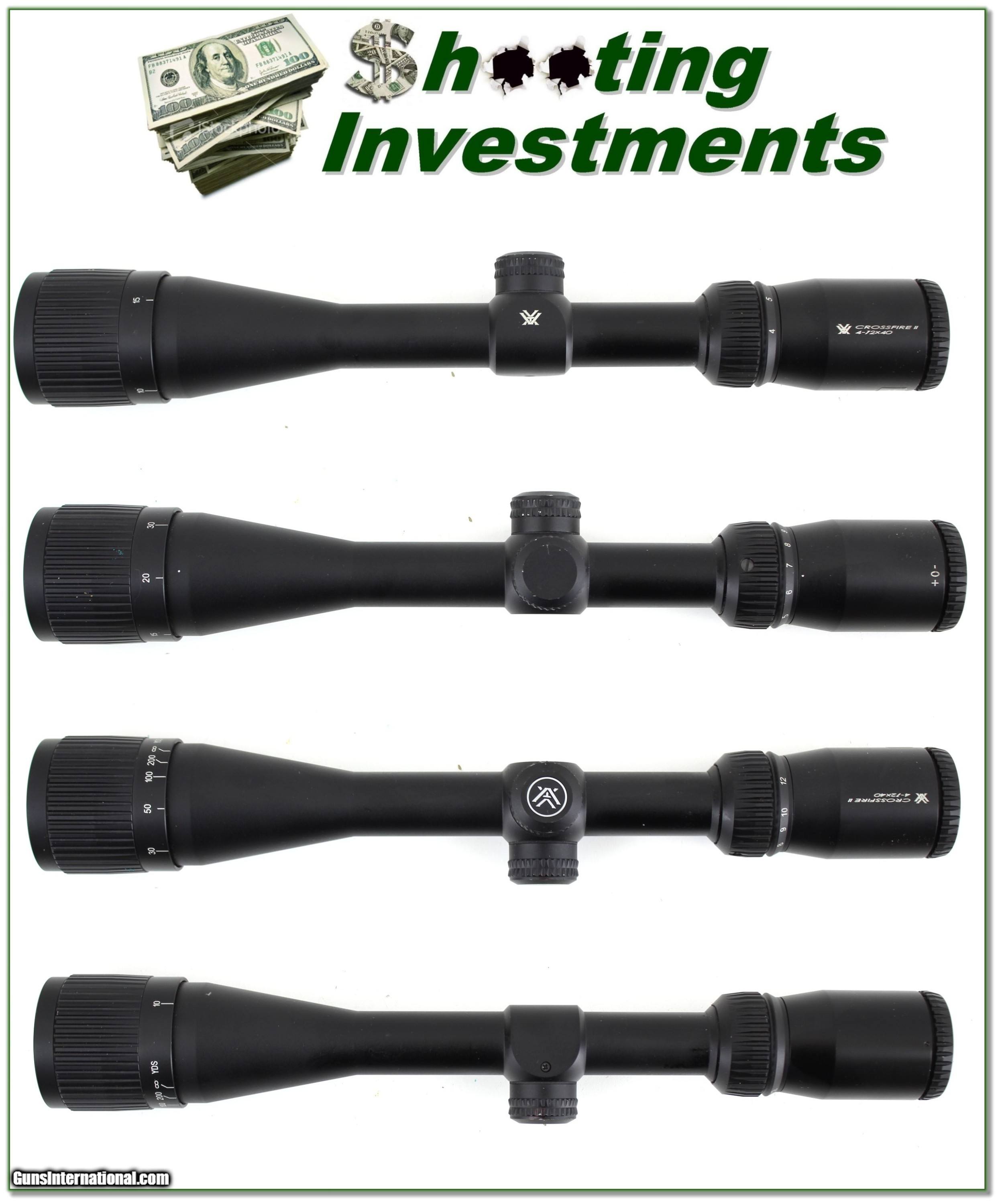 Description: This is a near new Vortex Crossfire II matt scope in 4-12 Power with 40mm AO. It has a Duplex cosshair and will make an excellent scope for any hunting or target rifle. Shipping is $14.95 and please email me with any questions or larger pictures. (Consign your quality firearms with Shooting Investments for only 12%! Let me know if you have any you would like to sell!) 20-1335s Payment: Payment is by Money Order, Cashier’s Check or Personal Check. I can now also accept Credit Cards (MasterCard, Visa, Discover & American Express) with a 3% convenience fee. Shipping: The shipping charge will be listed in each description. It is $39 for most firearms. Some heavy guns or those insured for over $2000 will be higher. Shipments to Alaska and Hawaii are higher because air shipment is required. Most firearms are shipped on Tuesday and Thursday and usually in 5 days of receipt of payment. We package all shipments carefully and insure them. Optics are shipped Priority Mail and most other non-firearm shipments are shipped First Class. Returns: Our return policy is simple. If for any reason you are not pleased with your purchase, you may return your item for a full refund of purchase price. Ammunition cannot be returned. It is important to us that you are happy. Guns cannot be fired or dissembled before returning them and they must be returned in the same condition as received. Notification of a return must occur with-in 3 days of receipt at your dealer. Shipping, convenience and dealer fees are not refundable and are the responsibility of the buyer. Lay-a-way: If needed, we offer a 60 day lay-a-way option on most firearms. It is 1/3 now, 1/3 in 30 days and 1/3 in 60 days. Lay-a-way firearm sales are final and if not completed the first payment cannot be returned. Consigning your firearms with Shooting Investments: We will help you get top dollar for your firearms. While most local guns shops charge 20% or more, our fee is only 12% with a minimum of $75. At your local gun shop it might take months to sell. Selling on-line provides instant access to thousands of interested buyers. You won’t find any other on-line dealer willing to sell your firearms for only 12% or listing every gun on 3 separate s. Selling through an House typically costs the seller 15% and the buyer an addition 15% (so 30%) and you have to wait several months to sell and longer to receive funds. If properly priced, we will sell your firearms in a few weeks. Send us an email or give us a call and we’ll explain how easy it is for you to get top dollar. Trading: Trading for use is really just buying your gun to re-sell. If you have a gun you want to trade, please email a picture and we will let you know what we can give or it. You will always get more if we sell it for you on consignment. Help for California Buyers: We are happy to ship to California. It is the buyer’s responsibility to make sure any item you buy is legal in your state. We are also happy to help with your purchase of a firearm from someone other than us. If you see a gun you would like to buy but the seller can’t or won’t ship to California they can ship to use and we’ll then ship it to your California dealer. The cost for this service is only $30 + shipping. Let us know if we can help! SOLD |