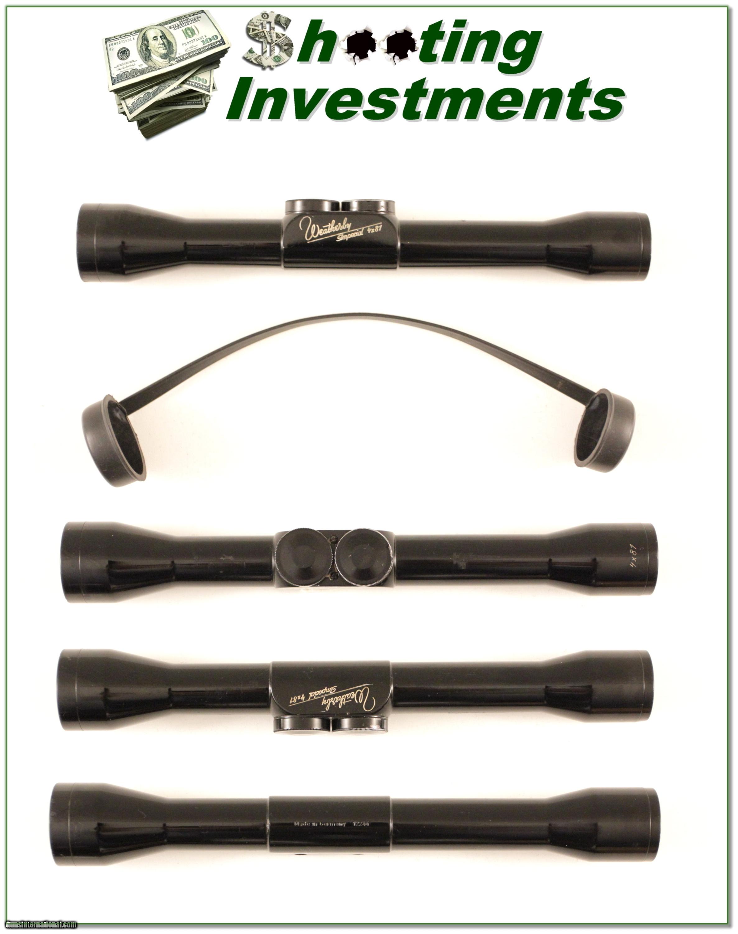 Description: Collectors, this is a German made Weatherby Imperial in the hard to find 4X Power with factory covers. The glass is scratch free and it has the rare target dot crosshairs. The knobs turn freely. It has only a couple erring scuffs. Shipping is $9.95 and please email me with any questions or larger pictures. (I now consign quality firearms only 10%! Let me know if you have any you would like to sell!) [16-0519s] Payment: Payment is by Money Order, Cashiers Check or Personal Check. I can now also accept MasterCard and Visa with a 3% convenience fee. PayPal can be used for some items but never firearms. Please let us know if you would like to pay via PayPal. Shipping: The shipping charge will be listed in each description. It is $35 for most guns. Some heavy guns or those insured for over $2000 will be higher. Shipments to Alaska and Hawaii are higher because air shipment is required. Most firearms are shipped within 5 days of receipt of payment. We prefer shipping at the beginning of the week to avoid firearms in transit over weekends. We package all shipments carefully and insure them for the full purchase price, rounded up to the next $100. In the unlikely event that damage occurs, it is important that you save all packaging material for the claims process. Optics are shipped Priority Mail and most other non-firearm shipments are shipped First Class. Returns: Our return policy is simple. If for any reason you are not pleased with your purchase, you may return your item for a refund. The only exception is ammunition, it cannot be returned. It is important to us that you are happy. Guns cannot be fired or dissembled before returning them and must be returned in the same condition as received. Notification of a return must occur with-in 3 days of receipt at your dealer. Shipping, convenience and dealer fees are not refundable and are the responsibility of the buyer. Lay-a-way: If needed, we offer a 60 day lay-a-way option on most firearms. It is 1/3 now, 1/3 in 30 days and 1/3 in 60 days. Lay-a-way firearm sales are final. Consigning your firearms with Shooting Investments: We will help you get top dollar for your firearms. While most local guns shops charge 20% or more, our fee is only 10% with a minimum of $50. At your local gun shop it might take months to sell. Selling on-line provides instant access to thousands of interested buyers. You won’t find any other on-line dealer willing to sell your firearms for only 10% or listing every gun on 4 separate s. Selling through an House typically costs the seller 15% and the buyer an addition 15% (so 30%) and you have to wait several months to sell and longer to receive funds. If properly priced, we will sell your firearms in a week or two. Send us an email or give us a call and we’ll explain how easy it is for you to get top dollar. Trading: We collect guns and usually just trade for guns we want to add to our collections. We often sell guns for others wanting to purchase one of ours. We find this the most fair to both of us. Our Commission is only 10% and we hold the gun you want until yours sells. Please contact us if you want to sell one of yours to buy one of ours. Help for California Buyers: We are happy to ship to California. It is the buyer’s responsibility to make sure any item you buy is legal in your state. We are also happy to help with your purchase of a firearm from someone other than us. If you see a gun you would like to buy but the seller can’t or won’t ship to California we can help. You buy the gun and have it shipped to us. We’ll then ship it to your California dealer. The cost for this service is only $30 + shipping. Let me know if we can help! SOLD |