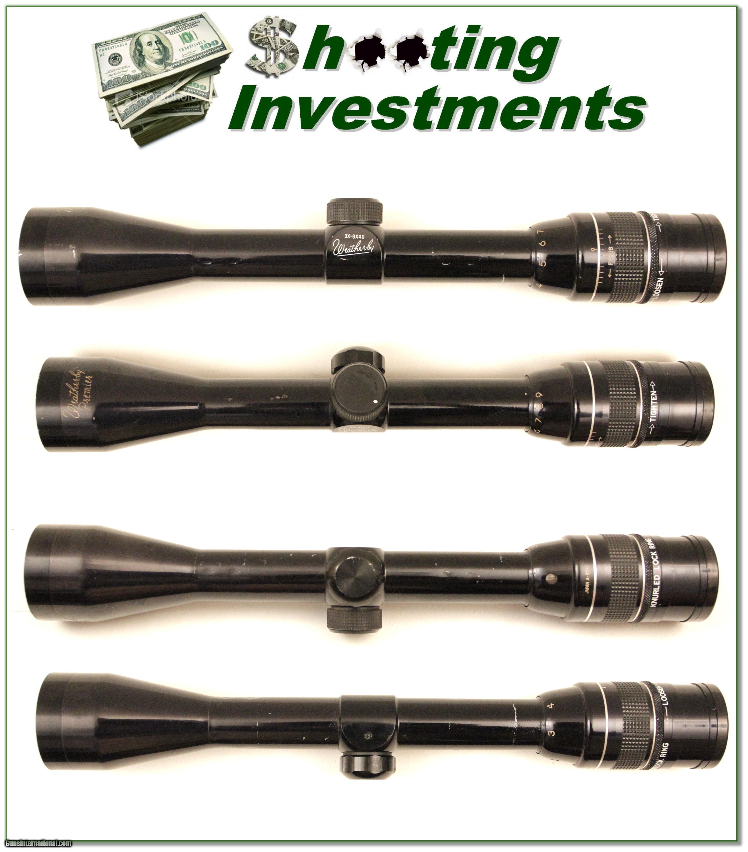 Description: This is a high quality Weatherby Premier 3-9X scope. These are gloss finish and make a nice choice for Mark V Deluxe guns. It is in very good condition with some marks that mostly will be cover when mounted. This one has a TV view with duplex crosshairs and crystal clear optics. It will look nice on your Weatherby. Please email me with any questions or for larger photos. Shipping is $9.95 and please email me with any questions or larger pictures. (I now consign quality firearms only 10%! Let me know if you have any you would like to sell!) [16-0486s] Payment: Payment is by Money Order, Cashiers Check or Personal Check. I can now also accept MasterCard and Visa with a 3% convenience fee. PayPal can be used for some items but never firearms. Please let us know if you would like to pay via PayPal. Shipping: The shipping charge will be listed in each description. It is $35 for most guns. Some heavy guns or those insured for over $2000 will be higher. Shipments to Alaska and Hawaii are higher because air shipment is required. Most firearms are shipped within 5 days of receipt of payment. We prefer shipping at the beginning of the week to avoid firearms in transit over weekends. We package all shipments carefully and insure them for the full purchase price, rounded up to the next $100. In the unlikely event that damage occurs, it is important that you save all packaging material for the claims process. Optics are shipped Priority Mail and most other non-firearm shipments are shipped First Class. Returns: Our return policy is simple. If for any reason you are not pleased with your purchase, you may return your item for a refund. The only exception is ammunition, it cannot be returned. It is important to us that you are happy. Guns cannot be fired or dissembled before returning them and must be returned in the same condition as received. Notification of a return must occur with-in 3 days of receipt at your dealer. Shipping, convenience and dealer fees are not refundable and are the responsibility of the buyer. Lay-a-way: If needed, we offer a 60 day lay-a-way option on most firearms. It is 1/3 now, 1/3 in 30 days and 1/3 in 60 days. Lay-a-way firearm sales are final. Consigning your firearms with Shooting Investments: We will help you get top dollar for your firearms. While most local guns shops charge 20% or more, our fee is only 10% with a minimum of $50. At your local gun shop it might take months to sell. Selling on-line provides instant access to thousands of interested buyers. You won’t find any other on-line dealer willing to sell your firearms for only 10% or listing every gun on 4 separate s. Selling through an House typically costs the seller 15% and the buyer an addition 15% (so 30%) and you have to wait several months to sell and longer to receive funds. If properly priced, we will sell your firearms in a week or two. Send us an email or give us a call and we’ll explain how easy it is for you to get top dollar. Trading: We collect guns and usually just trade for guns we want to add to our collections. We often sell guns for others wanting to purchase one of ours. We find this the most fair to both of us. Our Commission is only 10% and we hold the gun you want until yours sells. Please contact us if you want to sell one of yours to buy one of ours. Help for California Buyers: We are happy to ship to California. It is the buyer’s responsibility to make sure any item you buy is legal in your state. We are also happy to help with your purchase of a firearm from someone other than us. If you see a gun you would like to buy but the seller can’t or won’t ship to California we can help. You buy the gun and have it shipped to us. We’ll then ship it to your California dealer. The cost for this service is only $30 + shipping. Let me know if we can help! SOLD |