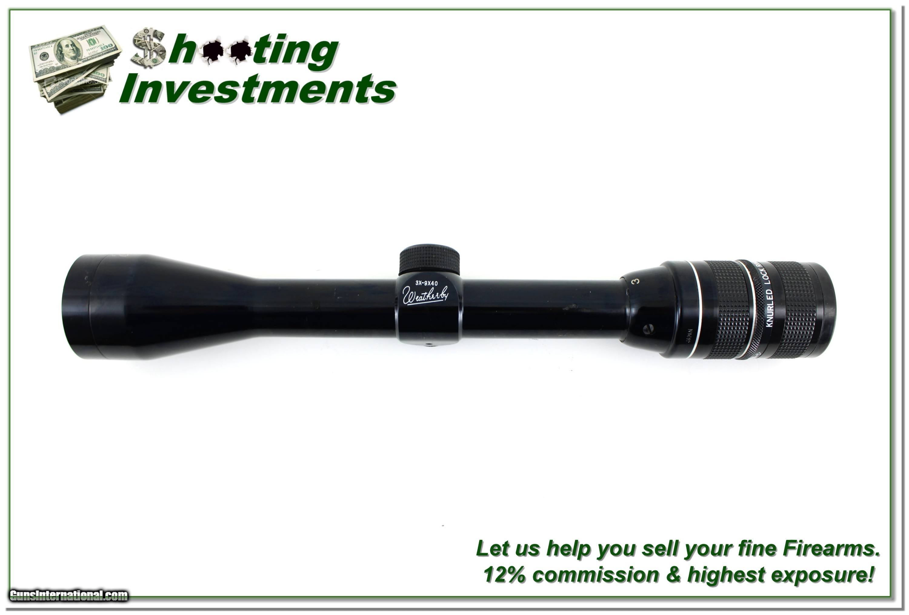Description: Weatherby Premier 3-9x40mm Widefield Rifle Scope with Duplex Reticle and Gloss finish. This scope is in great condition but has a few touched up marks from previous use. Features clear optics, smooth zoom, and a bright, wide field of view. Classic design with high-quality Japanese craftsmanship. Ideal for hunters and collectors looking for reliable performance and vintage style. Shipping is $14.95 and please email me with any questions or larger pictures. (Consign your quality firearms with Shooting Investments for only 12%! Let me know if you have any you would like to sell!) 25-0639s Payment: Payment is by Money Order, Cashier’s Check or Personal Check. I can now also accept Credit Cards (MasterCard, Visa, Discover & American Express) with a 3% convenience fee. Shipping: The shipping charge will be listed in each description. It is $49 for most firearms. Some heavy guns or those insured for over $2000 will be higher. Shipments to Alaska and Hawaii are higher because air shipment is required. Most firearms are shipped on Tuesday and Thursday and usually in 5 days of receipt of payment. We package all shipments carefully and insure them. Optics are shipped Priority Mail and most other non-firearm shipments are shipped First Class. Returns: Our return policy is simple. If for any reason you are not pleased with your purchase, you may return your item for a full refund of purchase price. Ammunition cannot be returned. It is important to us that you are happy. Guns cannot be fired or dissembled before returning them and they must be returned in the same condition as received. Notification of a return must occur within 3 days of receipt at your dealer. Shipping, convenience and dealer fees are not refundable and are the responsibility of the buyer. Lay-a-way: If needed, we offer a 60 day lay-a-way option on most firearms. It is 1/3 now, 1/3 in 30 days and 1/3 in 60 days. Lay-a-way firearm sales are final and cannot be returned. If a lay-a-way is not completed the first payment cannot be refunded. Consigning your firearms with Shooting Investments: We will help you get top dollar for your firearms. While most local guns shops charge 20% or more, our fee is only 12% with a minimum of $100. At your local gun shop it might take months to sell. Selling on-line provides instant access to thousands of interested buyers. You won’t find any other on-line dealer willing to sell your firearms for only 12% or listing every gun on 3 separate s. Selling through an House typically costs the seller 15% and the buyer an addition 15% (so 30%) and you have to wait several months to sell and longer to receive funds. If properly priced, we will sell your firearms within a few weeks. Send us an email or give us a call and we’ll explain how easy it is for you to get top dollar. Trading: Trading for us is really just buying your gun to re-sell. If you have a gun you want to trade, please email a picture and we will let you know what we can give for it. You will always get more if we sell it for you on consignment. SOLD |