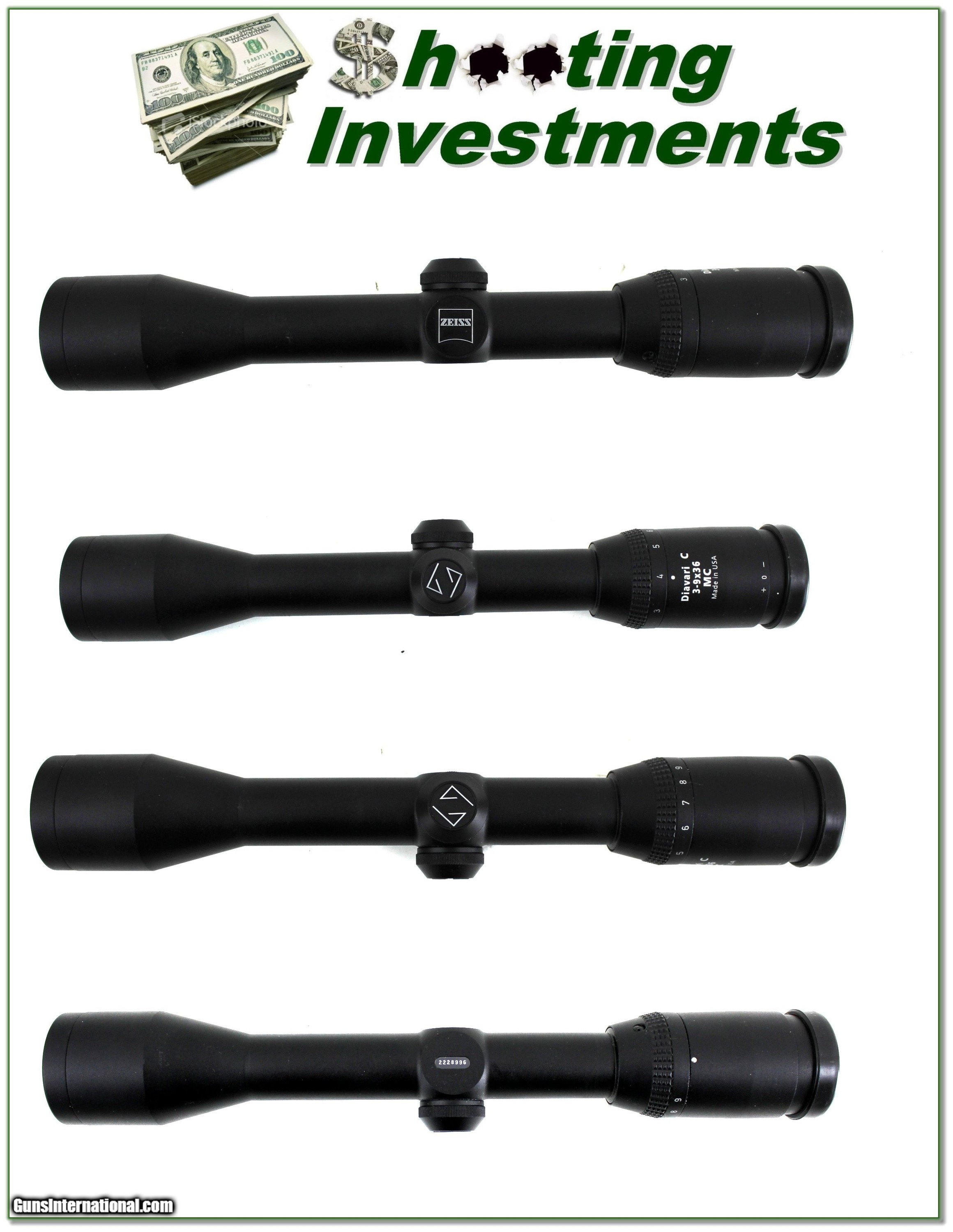 Description: This is a top-quality Zeiss Diavari C in 3-9x36. It looks new! The glass is SUPER clear as you would expect with a Duplex Crosshair. It will make a high-end scope for any gun! Shipping is $14.95 and please email me with any questions or larger pictures. (Consign your quality firearms with Shooting Investments for only 12%! Let me know if you have any you would like to sell!) 24-0847s Payment: Payment is by Money Order, Cashier’s Check or Personal Check. I can now also accept Credit Cards (MasterCard, Visa, Discover & American Express) with a 3% convenience fee. Shipping: The shipping charge will be listed in each description. It is $49 for most firearms. Some heavy guns or those insured for over $2000 will be higher. Shipments to Alaska and Hawaii are higher because air shipment is required. Most firearms are shipped on Tuesday and Thursday and usually in 5 days of receipt of payment. We package all shipments carefully and insure them. Optics are shipped Priority Mail and most other non-firearm shipments are shipped First Class. Returns: Our return policy is simple. If for any reason you are not pleased with your purchase, you may return your item for a full refund of purchase price. Ammunition cannot be returned. It is important to us that you are happy. Guns cannot be fired or dissembled before returning them and they must be returned in the same condition as received. Notification of a return must occur within 3 days of receipt at your dealer. Shipping, convenience and dealer fees are not refundable and are the responsibility of the buyer. Lay-a-way: If needed, we offer a 60 day lay-a-way option on most firearms. It is 1/3 now, 1/3 in 30 days and 1/3 in 60 days. Lay-a-way firearm sales are final and cannot be returned. If a lay-a-way is not completed the first payment cannot be refunded. Consigning your firearms with Shooting Investments: We will help you get top dollar for your firearms. While most local guns shops charge 20% or more, our fee is only 12% with a minimum of $75. At your local gun shop it might take months to sell. Selling on-line provides instant access to thousands of interested buyers. You won’t find any other on-line dealer willing to sell your firearms for only 12% or listing every gun on 3 separate s. Selling through an House typically costs the seller 15% and the buyer an addition 15% (so 30%) and you have to wait several months to sell and longer to receive funds. If properly priced, we will sell your firearms within a few weeks. Send us an email or give us a call and we’ll explain how easy it is for you to get top dollar. Trading: Trading for us is really just buying your gun to re-sell. If you have a gun you want to trade, please email a picture and we will let you know what we can give for it. You will always get more if we sell it for you on consignment. SOLD |