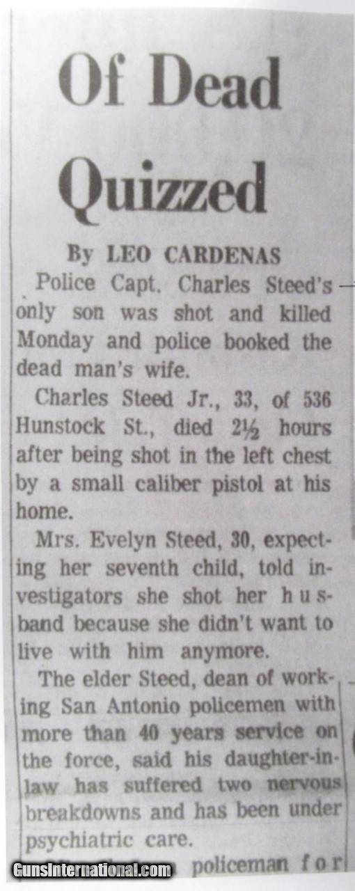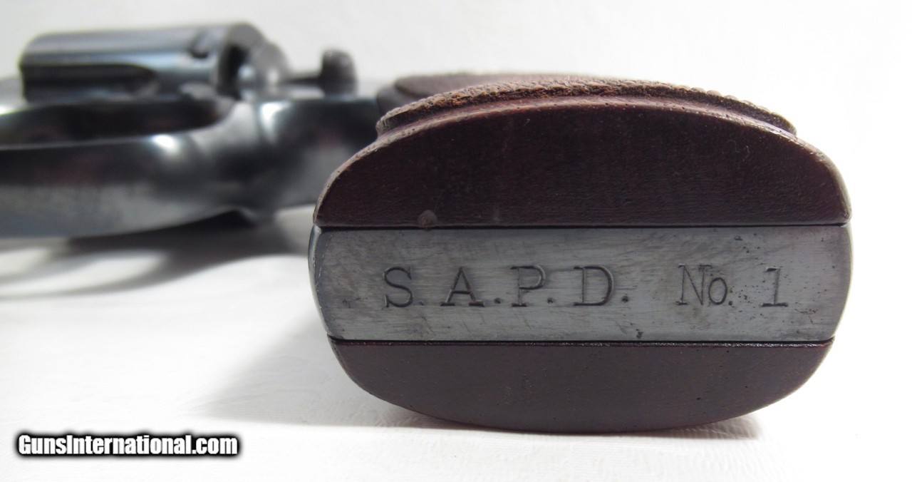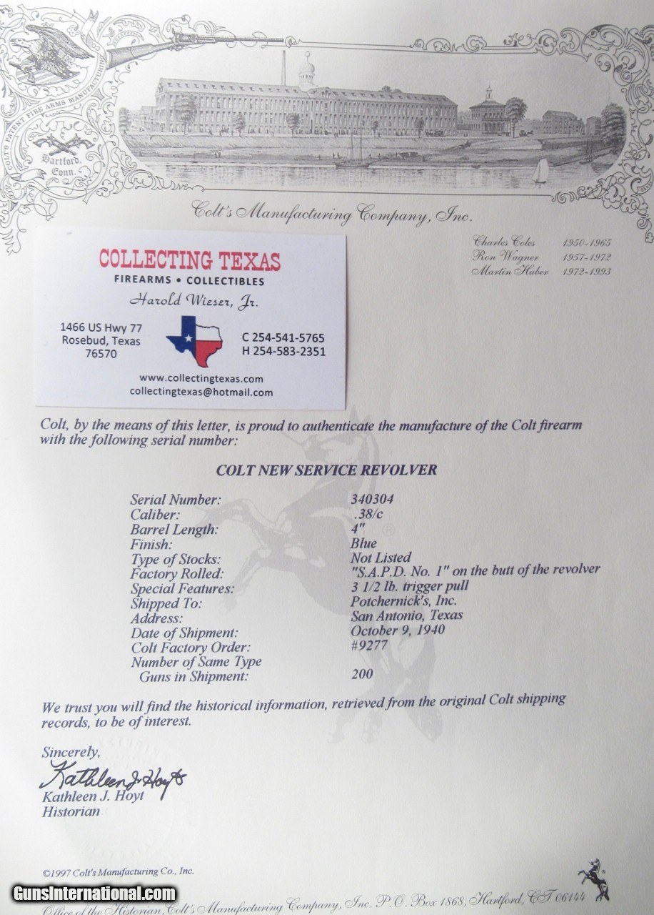 Description: Colt New Service Revolver; Serial No. 340304; .38 Special Caliber; 4” Barrel; Blue Finish; Factory Engraved on Butt of Gun “S.A.P.D. No.1”; 1 of a 200 Gun Shipment Issued to the San Antonio, Texas Police Dept. in October, 1940; Formerly in the Bill Gibson Collection (Retired San Antonio Police Chief); First Issued to Sgt. Edward Ignacious, afterwards Issued to Capt. Charles Steed; See All Photos for Condition; No Texts. Call or Email Only; PERSONAL PROPERTY of Harold Wieser; Price: $4,975 + $45 S&H Via FedEx Express; Price includes insured shipping; return policy: three days inspection from the date the item is received; full refund of shipping both ways ONLY IF THE ITEM IS MISREPRESENTED. SOLD |