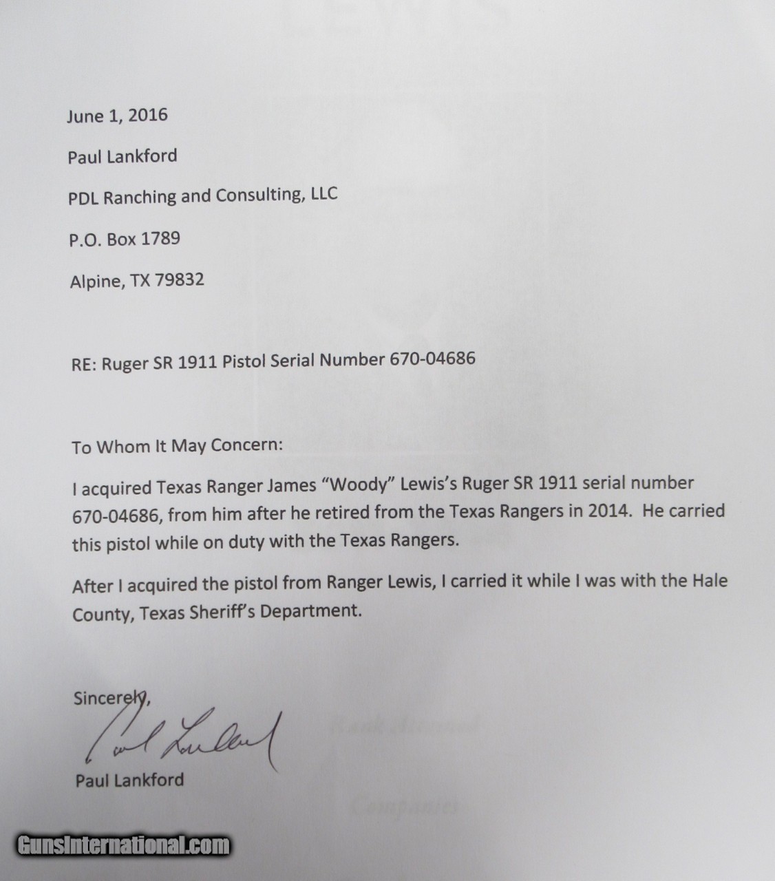 Description: Ruger SR1911 Semi-Auto 45; Serial No. 670-04686; Owned by Retired Texas Ranger James “Woody” Lewis whom Served with the Texas Rangers from 2011-2014; Excellent Condition; See Attached Documents; See All Photos for Condition; No Texts; Call (254)541-5765 or Email Only; PERSONAL PROPERTY of Harold Wieser; Price: $1,775 + $45 S&H Via USPS PRIORITY MAIL; Payment Address: Harold Wieser - 1466 U.S. Hwy 77 - Rosebud, TX 76570; SEND PAYMENTS VIA USPS PRIORITY MAIL; BEWARE of SCAMS!!! – DO NOT SEND MONEY or CORRESPONDENTS ELECTRONICALLY UNLESS YOU HAVE SPOKEN to HAROLD WIESER FIRST! 254-541-5765 SOLD |