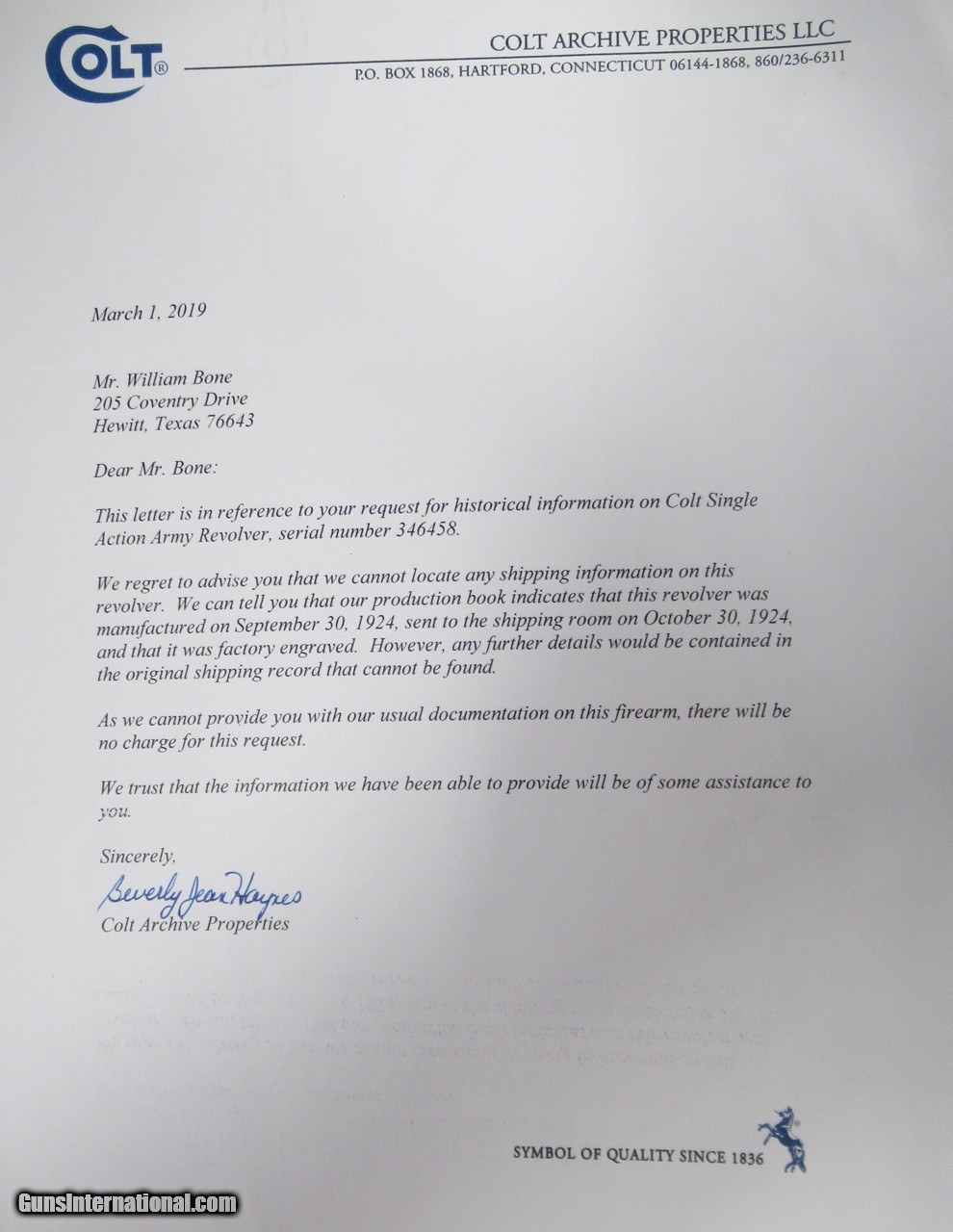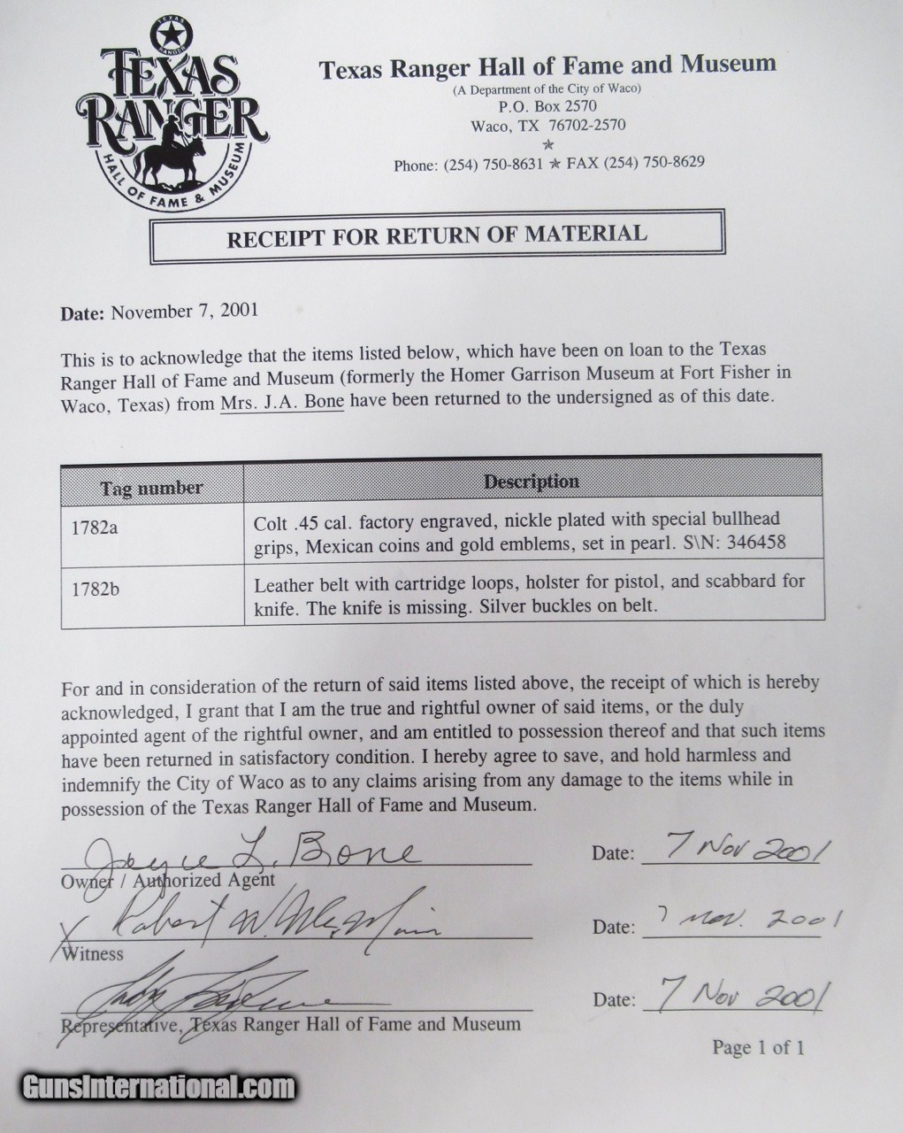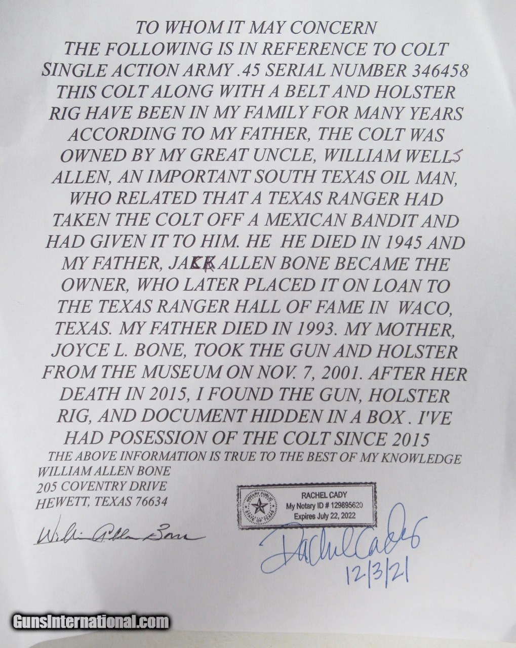 Description: Colt Single Action Army Revolver; Serial No. 346458; .45 Caliber with 5 ½” Barrel; Factory Engraved with Pearl Grips Adorned with Gold; Really Nice Holster Rig Included; Colt was in Texas Ranger Hall of Fame and Museum in Waco, Texas until Joyce Bone Retrieved it; Look at Photos for Condition and Documents for History; Family Still Owns Original Ranch Near Gatesville, Texas (Est. 1856); See All Photos for Condition; No Texts; Call (254)541-5765 or Email Only; PERSONAL PROPERTY of Harold Wieser; Price: Upon Request; Payment Address: Harold Wieser - 1466 U.S. Hwy 77 - Rosebud, TX 76570; SEND PAYMENTS VIA USPS PRIORITY MAIL; BEWARE of SCAMS!!! – DO NOT SEND MONEY or CORRESPONDENTS ELECTRONICALLY UNLESS YOU HAVE SPOKEN to HAROLD WIESER FIRST! 254-541-5765 SOLD |