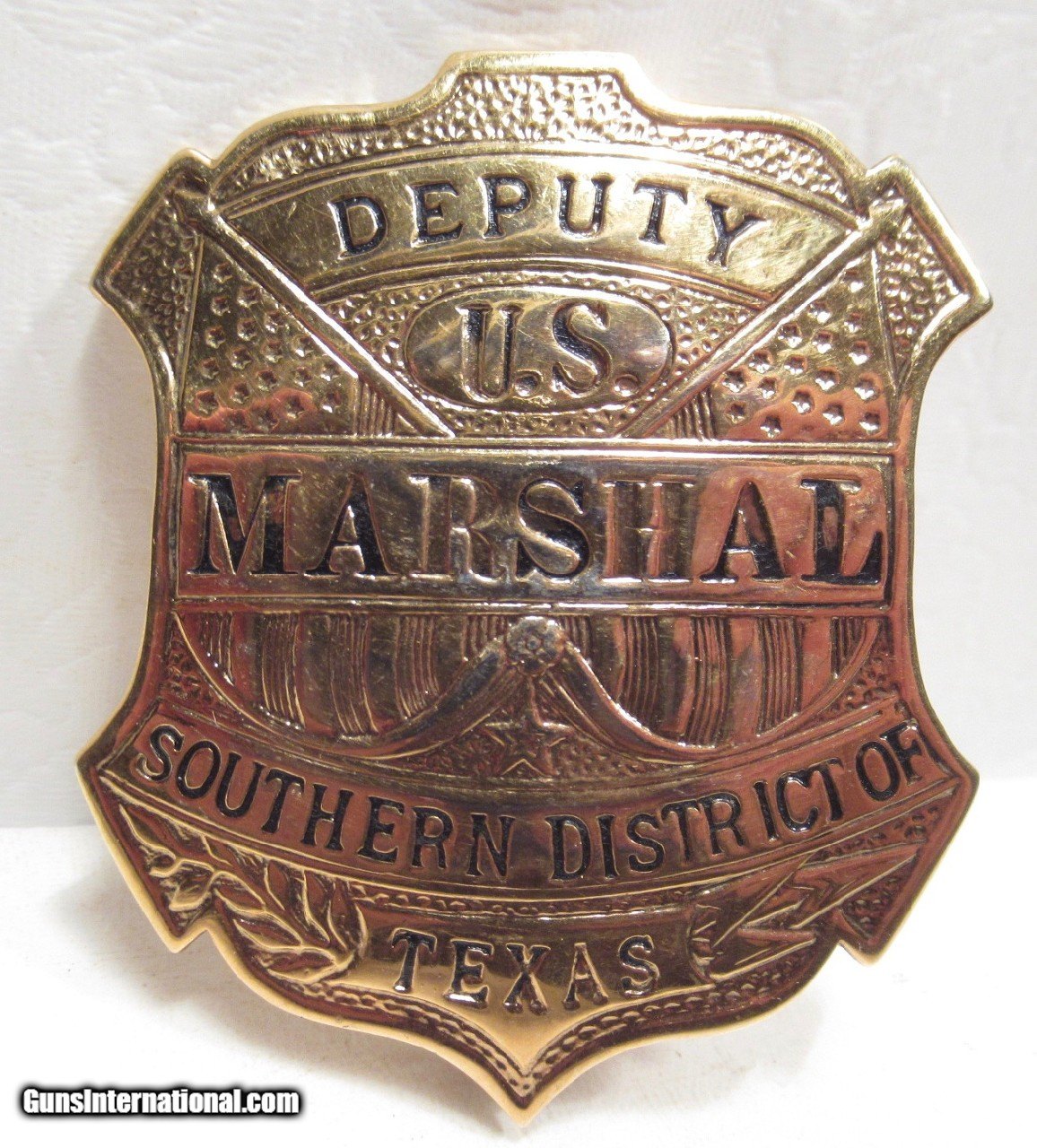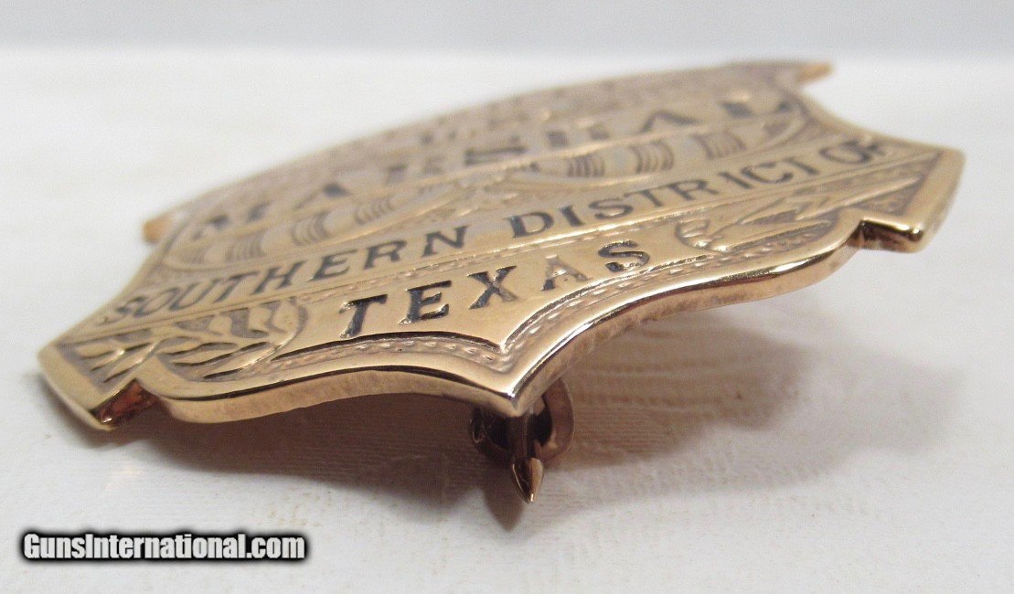GOLD PLATED DEPUTY U.S. MARSHALL – SOUTHERN DISTRICT OF TEXAS SHIELD BADGE from COLLECTING TEXAS – from the MIKE HESKETT COLLECTION