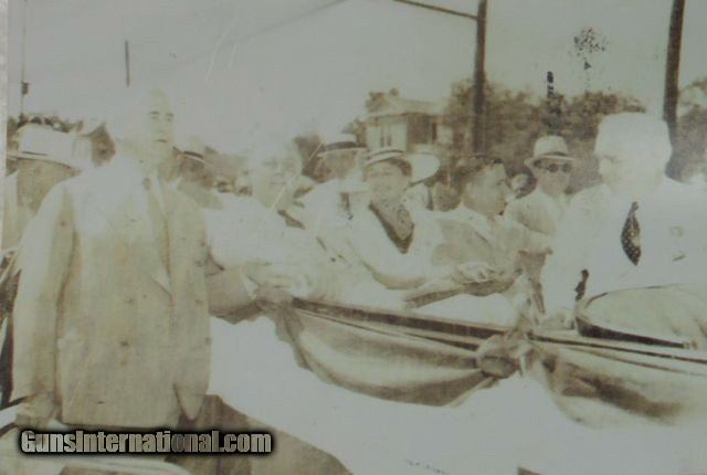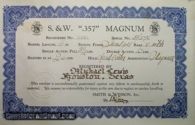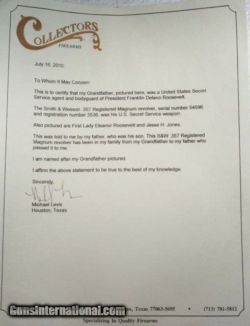 Description: Smith & Wesson Registered 357 Magnum; Serial No. 54596; Registration #3536; 4” Barrel; Shipped to Peden Iron and Steel Co., Houston, Texas for Michael Lewis, Secret Service Agent, who was the Body Guard for F.D.R.; Many Documents from Peden Iron and Smith & Wesson, and photo included; gun is at least 98% Original Condition; LIQUIDATING PERSONAL COLLECTION; Price: $20,000 Shipped; Price includes insured shipping; return policy: three days inspection from the date the items received; full refund of shipping both ways ONLY IF THE ITEM IS MISREPRESENTED. (Scroll to view 20 photos of this item) SOLD |