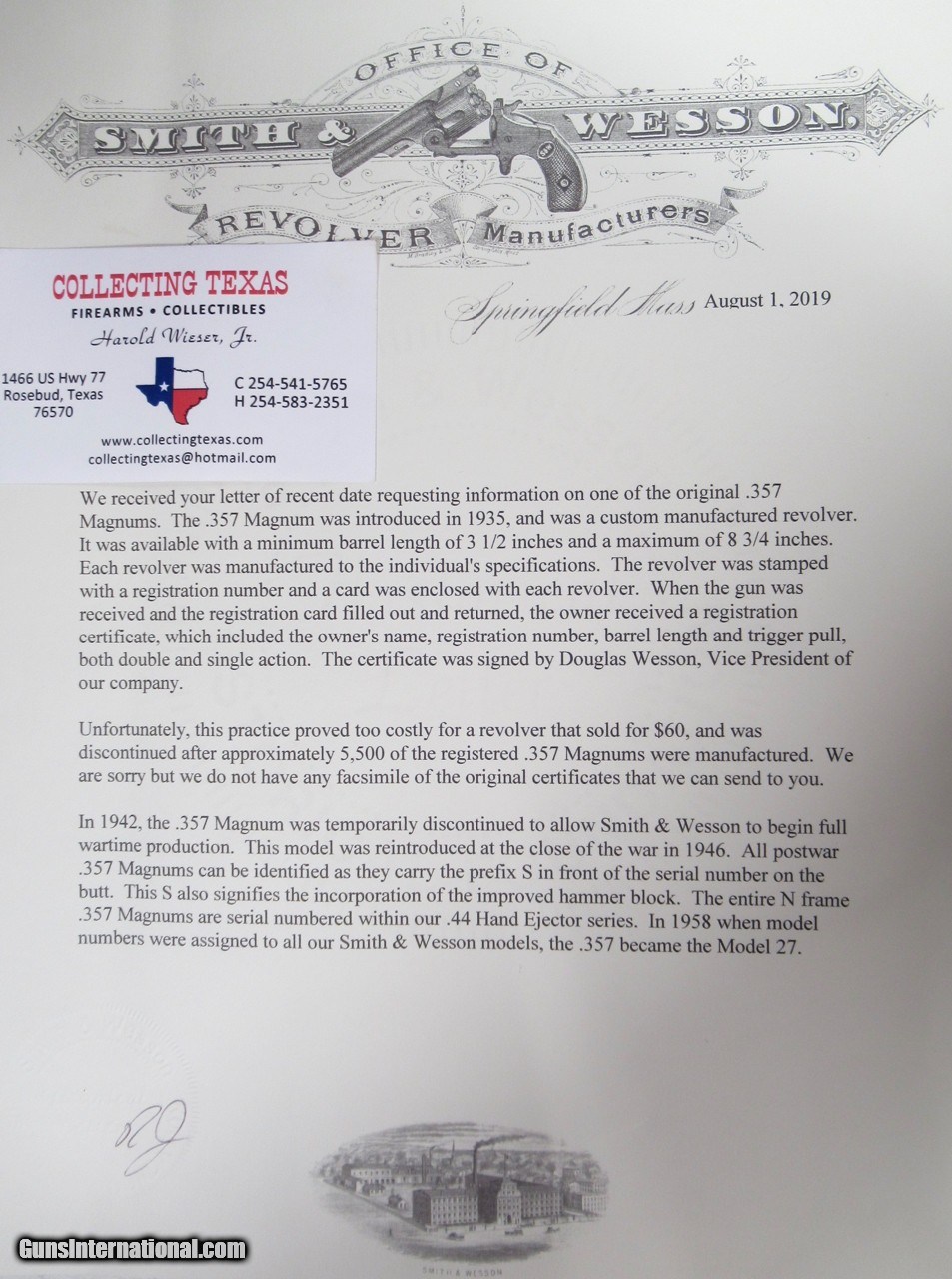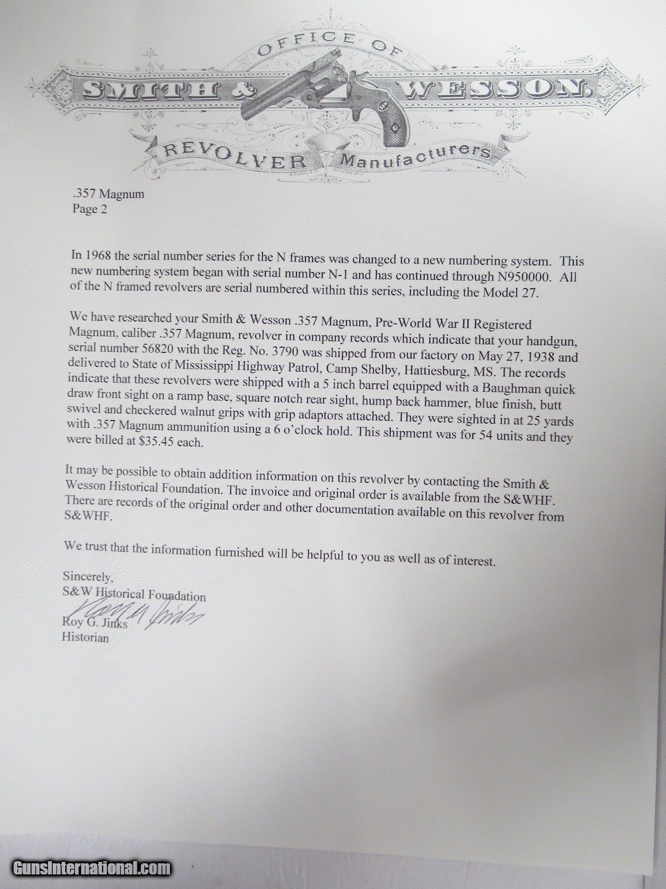 Description: Smith & Wesson 357 Registered Magnum Revolver; Serial No. 56820; With the Following Features Per Jinks Letter: SOLD |