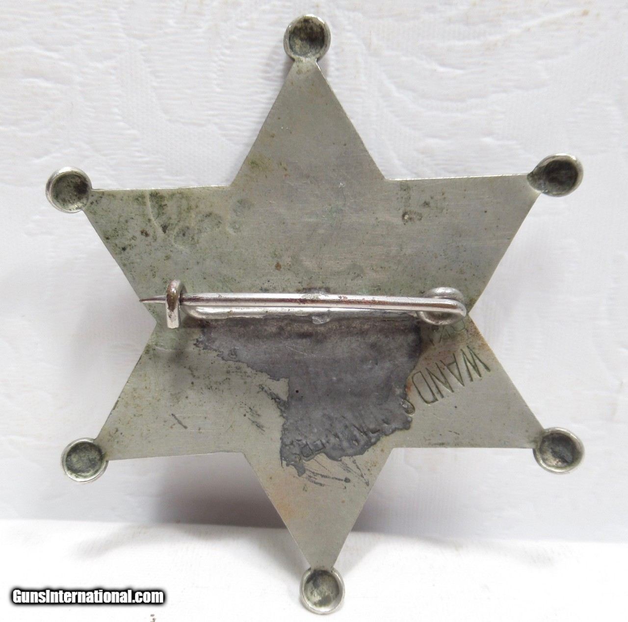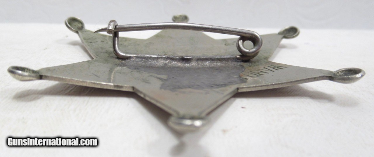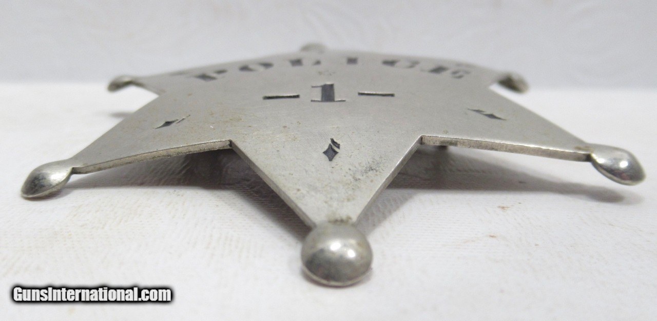 Description: 6-Point Ball Star Stock Police Badge Marked ‘Police 1”; Measures 2-5/8” Across Points; Pin Replaced and Covers Portion of Back Hallmark; Very Neat, Possibly Pre-1900’s Police Badge from the George Jackson Collection; See All Photos for Condition; No Texts; Call (254)541-5765 or Email Only; PERSONAL PROPERTY of Harold Wieser; Price: $475 + $45 S&H Via USPS PRIORITY MAIL; Payment Address: Harold Wieser - 1466 U.S. Hwy 77 - Rosebud, TX 76570; SEND PAYMENTS VIA USPS PRIORITY MAIL; BEWARE of SCAMS!!! – DO NOT SEND MONEY or CORRESPONDENTS ELECTRONICALLY UNLESS YOU HAVE SPOKEN to HAROLD WIESER FIRST! 254-541-5765 SOLD |