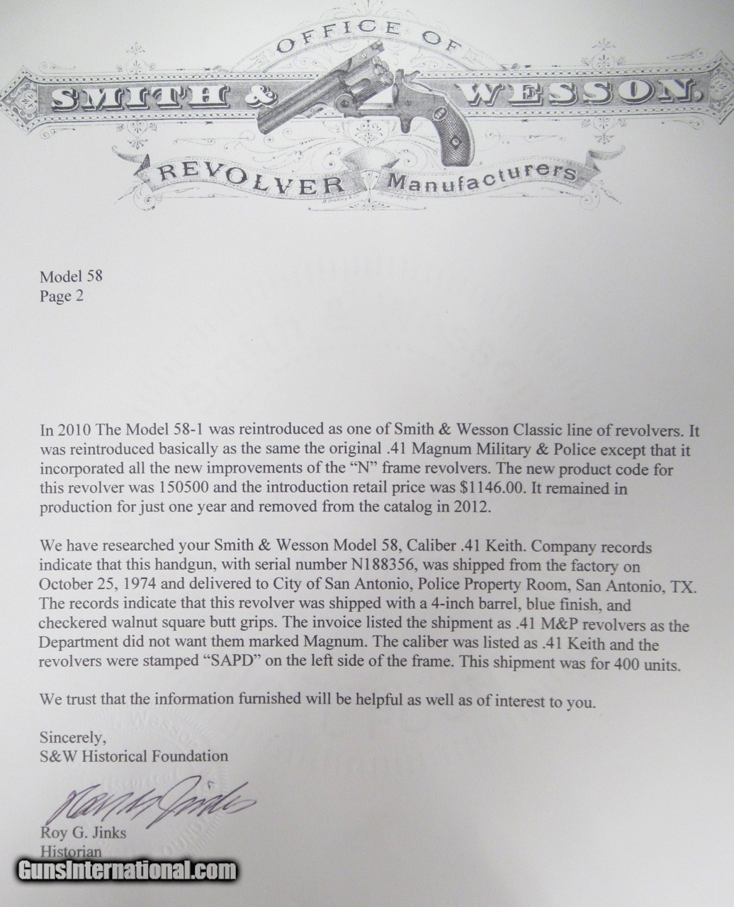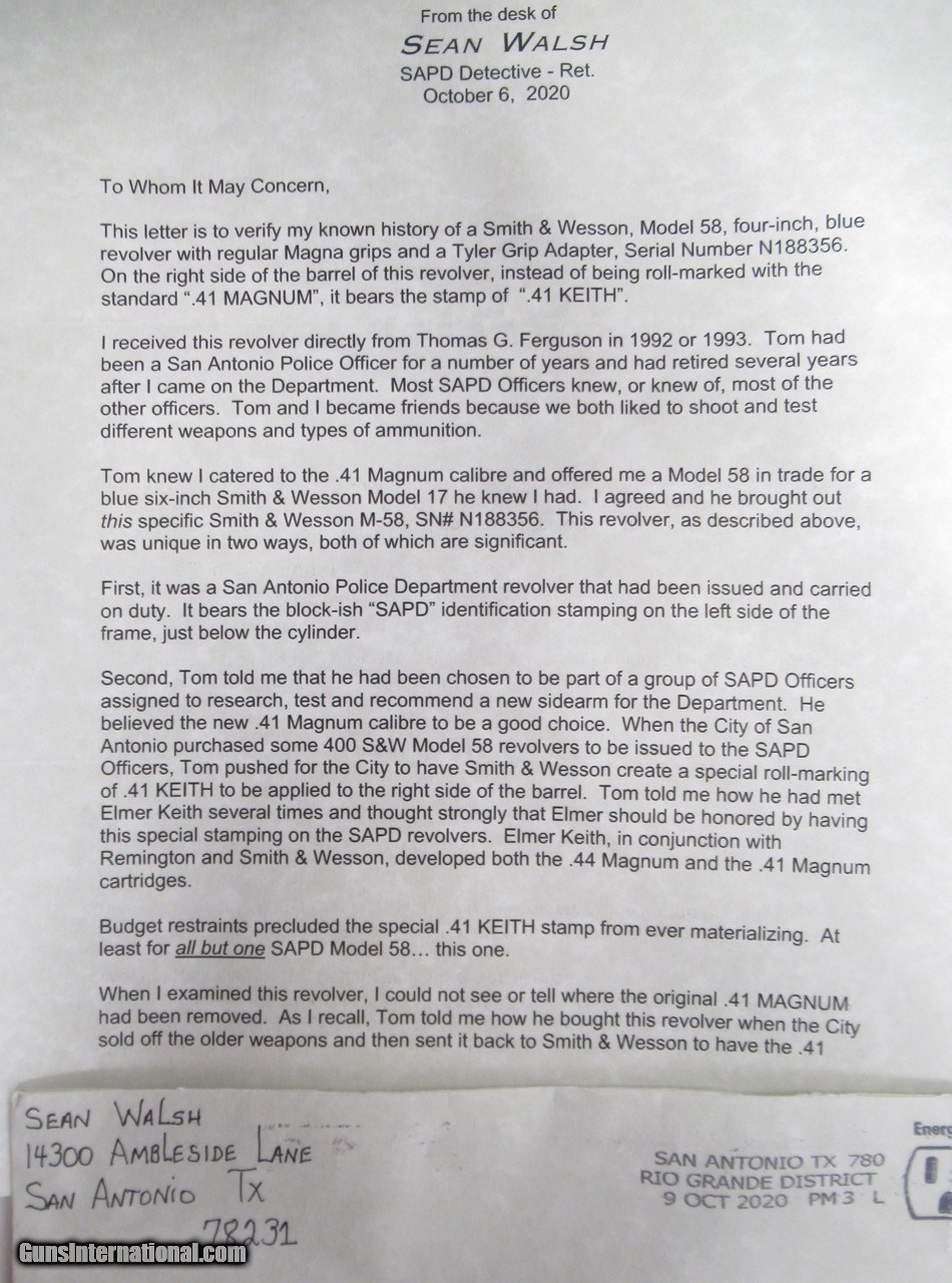 Description: Smith & Wesson Model 58; Serial No. N188356; 4” Blue in .41 Keith Caliber; Only One Ever Made; This Revolver is From the Collection of Retired San Antonio, TX Police Detective Sean Walsh; Factory S&W Letter Describes Revolver; Shipped to City of San Antonio as a “.41 Keith” Caliber and Stamped “SAPD” on Left Side of Frame; Great S.A.P.D. and Elmer Keith History; See All Photos for Condition; No Texts. Call or Email Only; PERSONAL PROPERTY of Harold Wieser; Price: $14,975 + $45 S&H Via FedEx Express; PLEASE DO NOT SEND PAYMENT THROUGH U.S. POSTAL SERVICE; Price includes insured shipping; return policy: three days inspection from the date the item is received; full refund of shipping both ways ONLY IF THE ITEM IS MISREPRESENTED. SOLD |