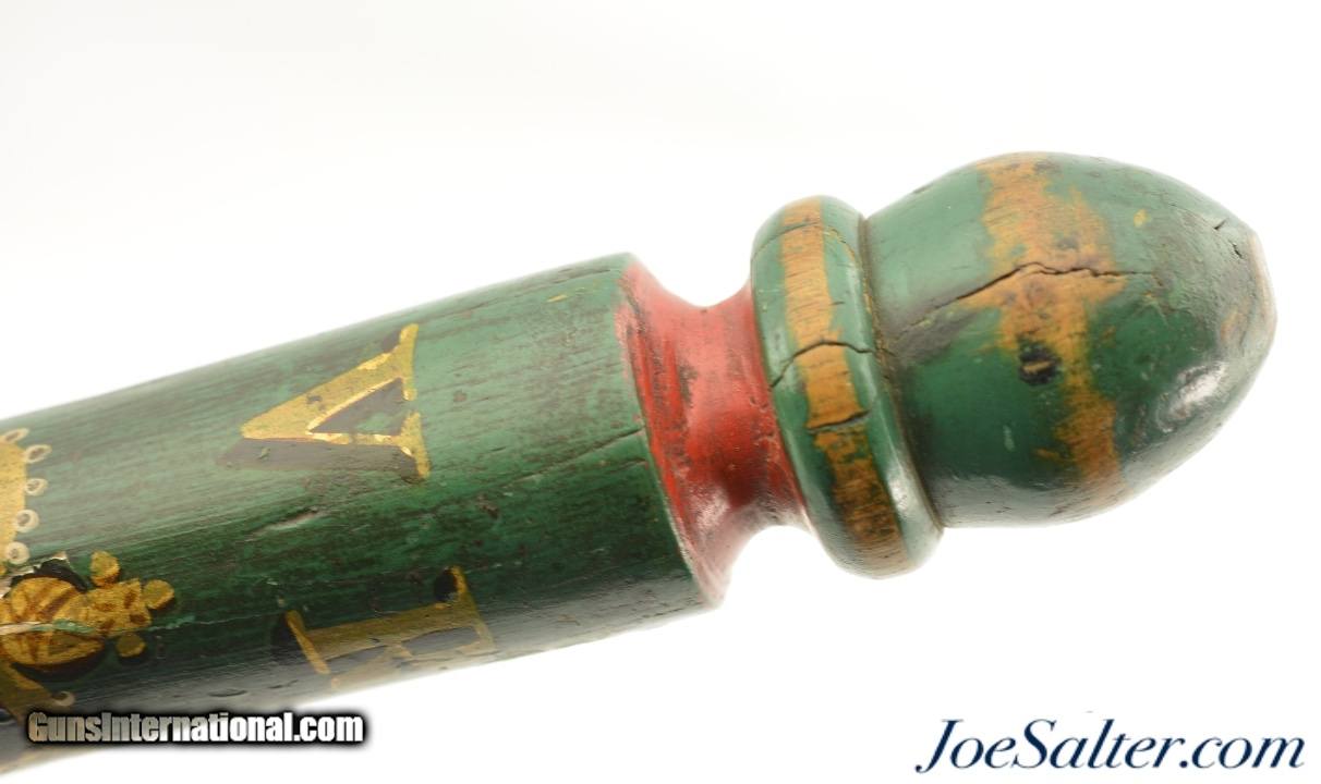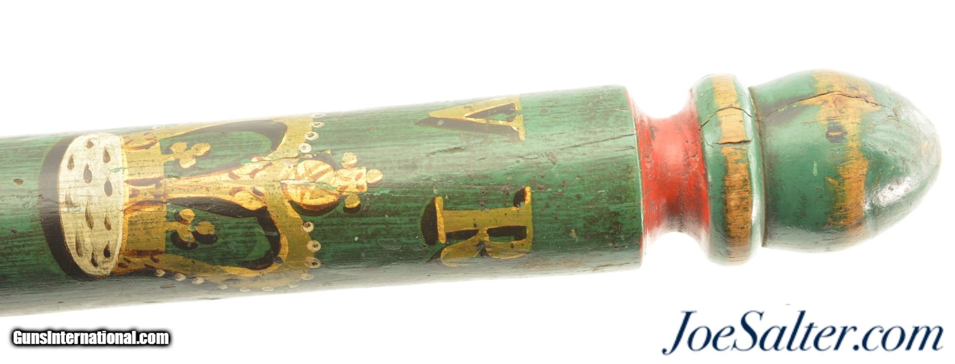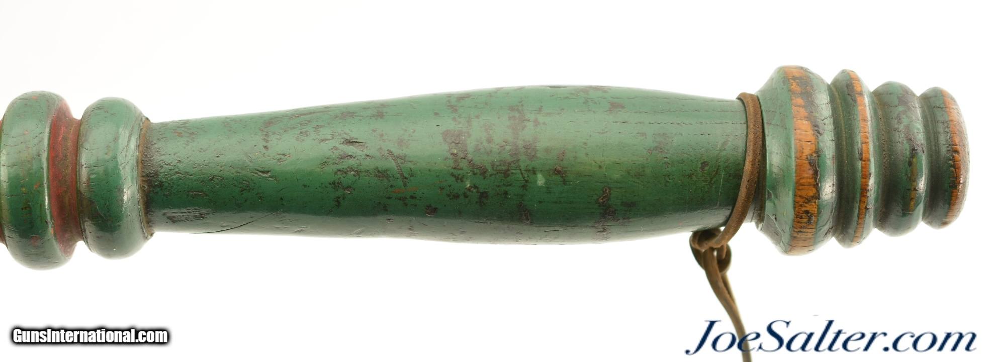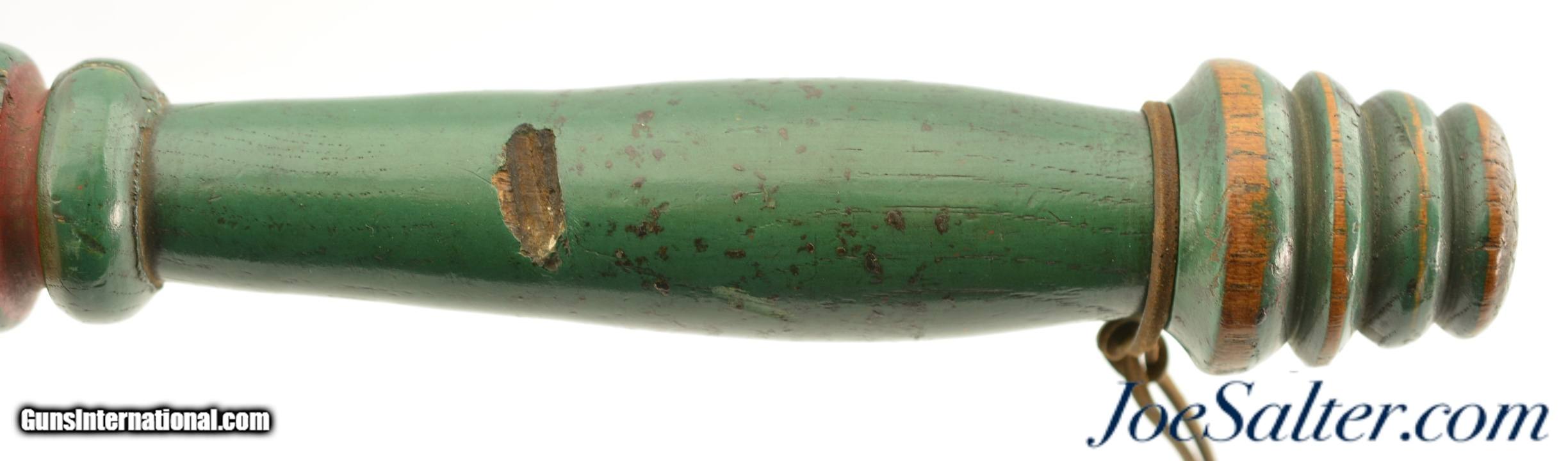 Description: This is an amazing condition and rare Victorian Era wooden Game Warden Truncheon painted in bright vivid colors, fantastic detail with a stag on the back and the crown with VF AF in gold gilt paint. The nearly 21" body is mostly green with red stripes and in excellent condition please see photos for fine detail. SOLD |