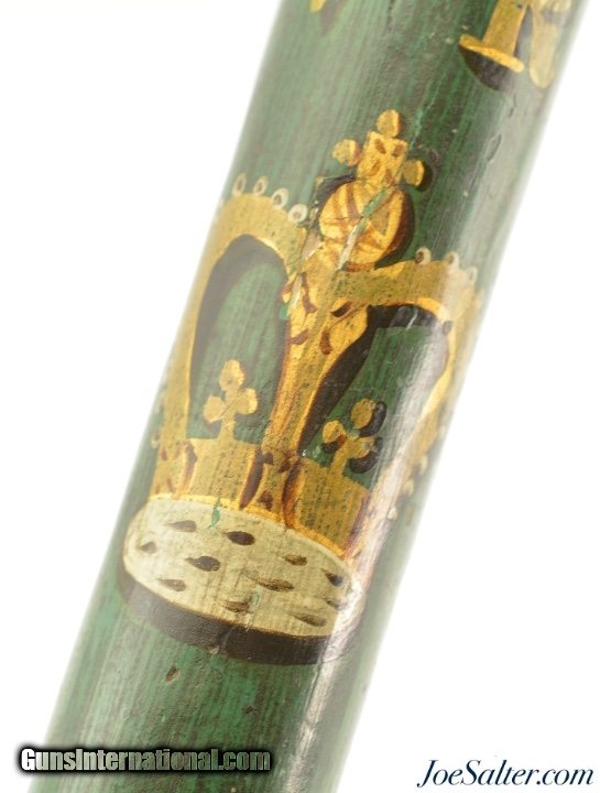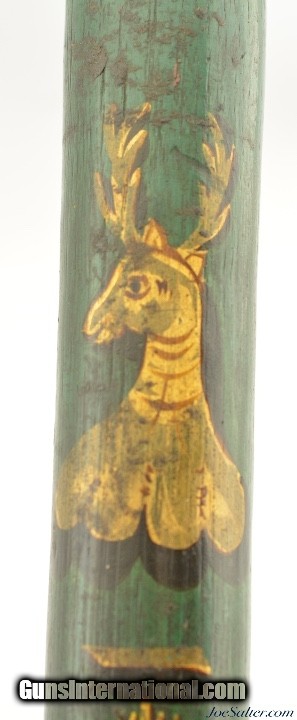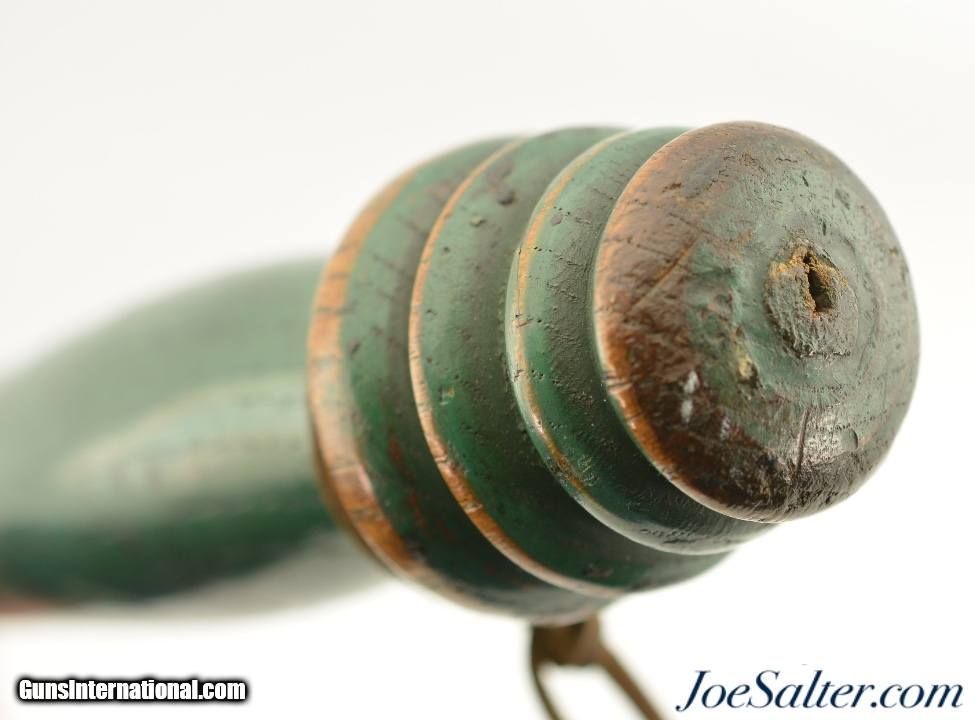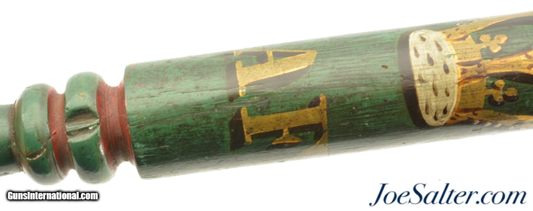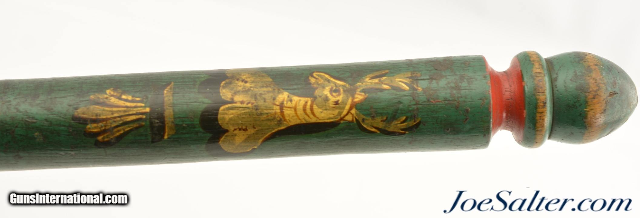 Description: This is an amazing condition and rare Victorian Era wooden Game Warden Truncheon painted in bright vivid colors, fantastic detail with a stag on the back and the crown with VF AF in gold gilt paint. The nearly 21" body is mostly green with red stripes and in excellent condition please see photos for fine detail. SOLD |