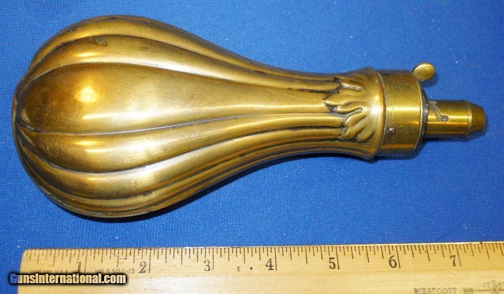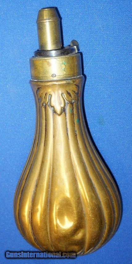 Description: ORIGINAL MID 19th CENTURY POWDER FLASK APPEARS TO BE # 269 IN RILINGS BOOK BY J. COLLINS. VERY GOOD WORKING ORDER GOOD SEAMS, FEW DENTS, AS PICTURED. ABOUT 7 1/2" x 3 1/4" $10.00 S&H SEE OTHERS COMBINE SHIPPING. SOLD |