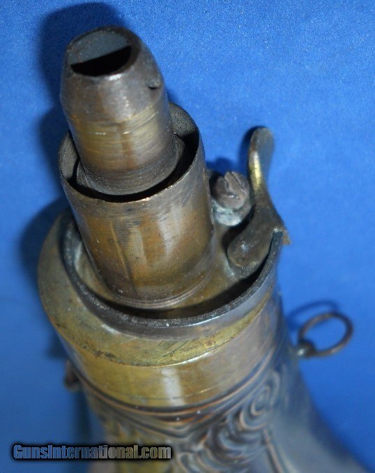 Description: ANTIQUE 1860s ERA POWDER FLASK SIMILAR TO # 379 IN RAY RILING'S BOOK. 8 3/4" OVERALL, UNCLEANED SURFACES, TIGHT SEAMS, COUPLE MINOR IMPRESSIONS, FINE WORKING ORDER WITH UNUSUAL CHARGER, AS PICTURED. $ 9.00 S&H SEE MY OTHERS COMBINE SHIPPING. SOLD |