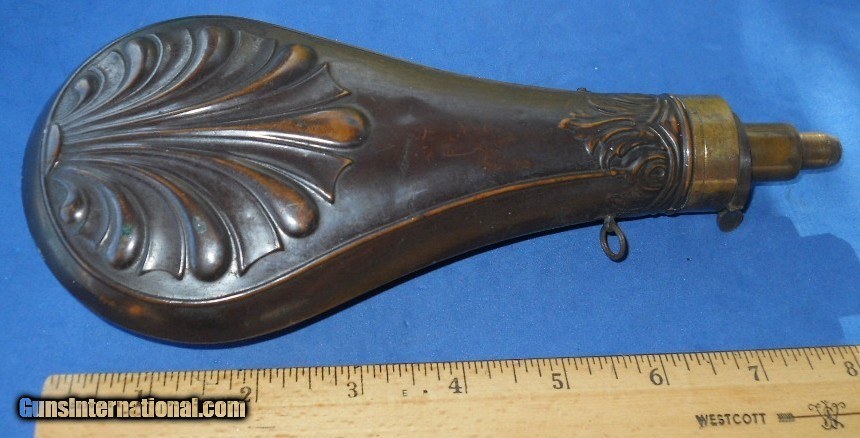 A. Antique 1860s SHELL & BUSH POWDER FLASK # 379 RILING BOOK