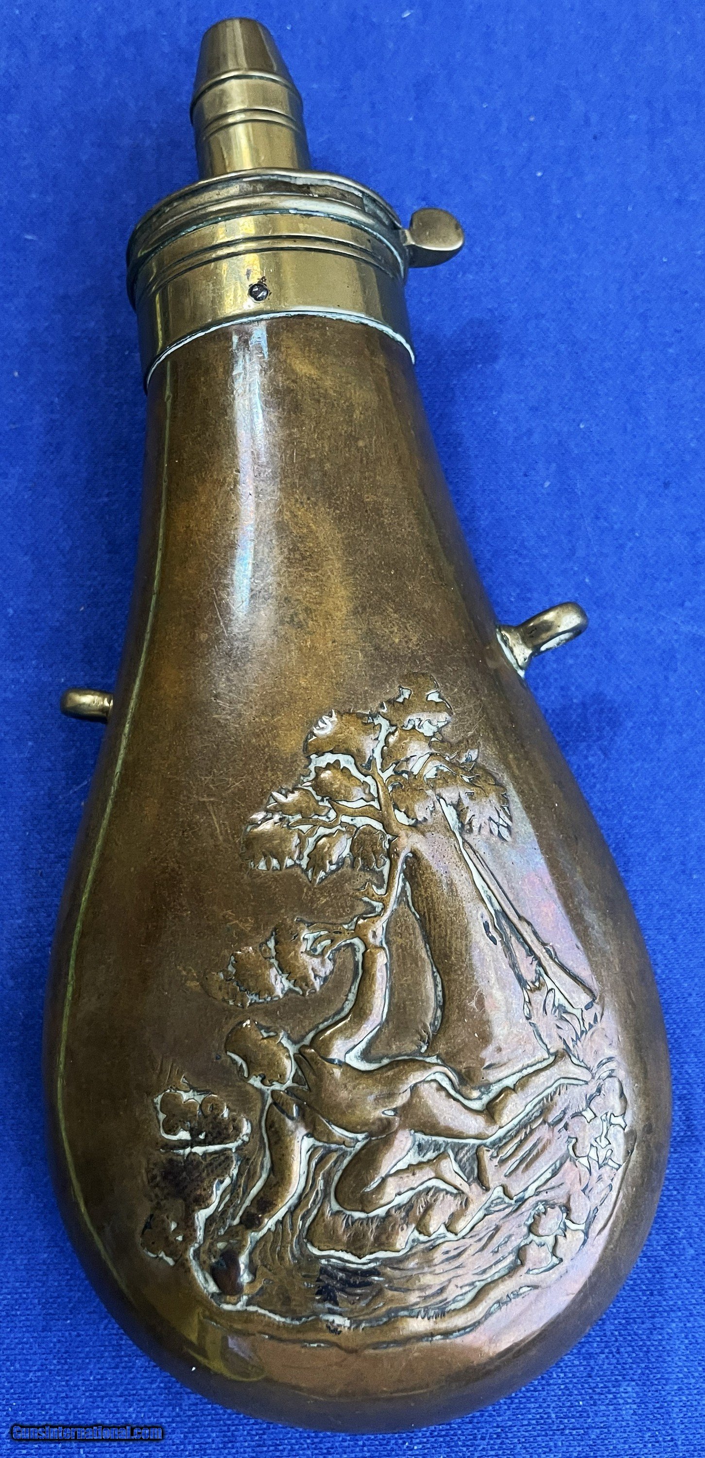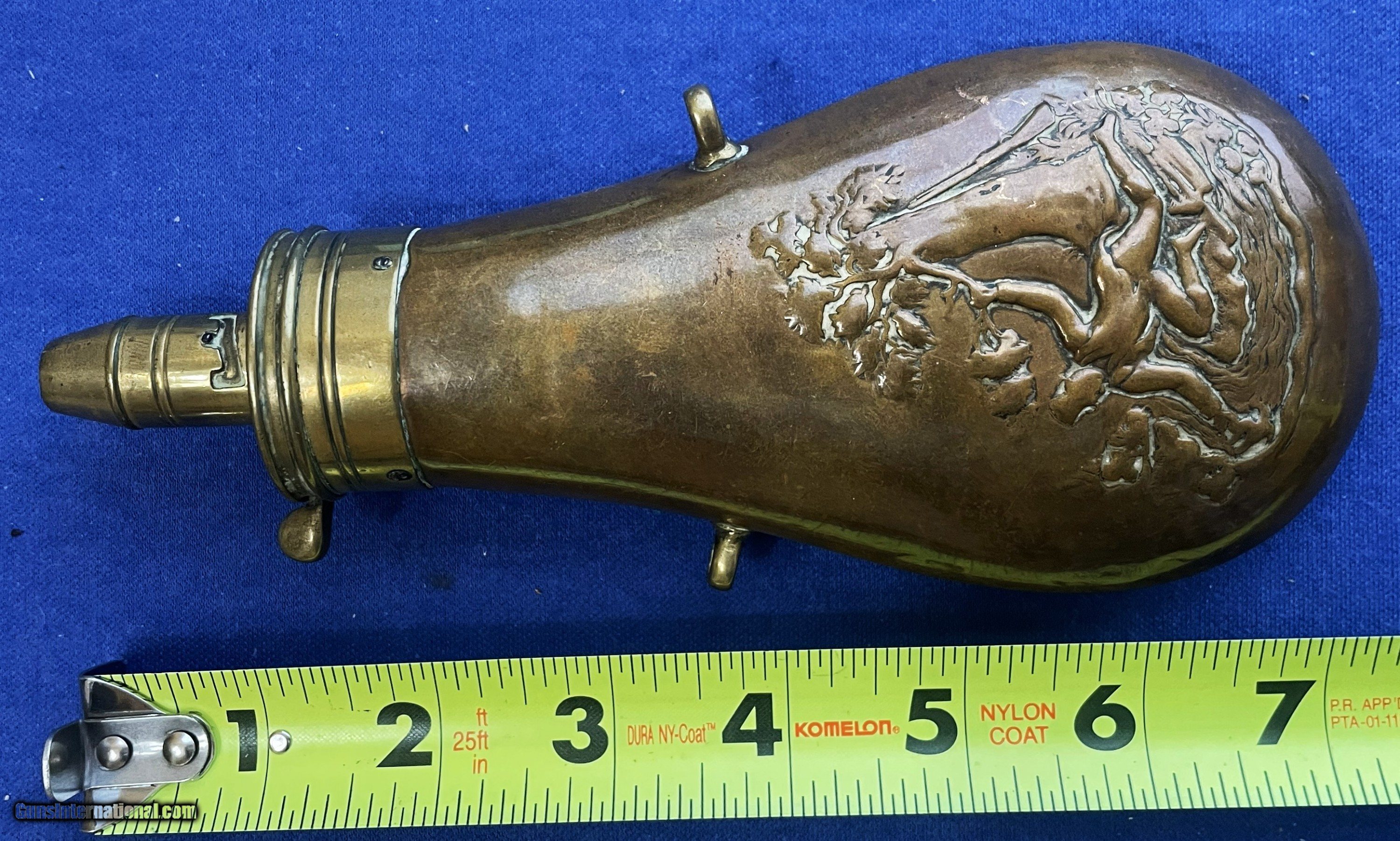Antique 1860s ERA POWDER FLASK FALLEN HUNTER & TREE DESIGN 7 1/2