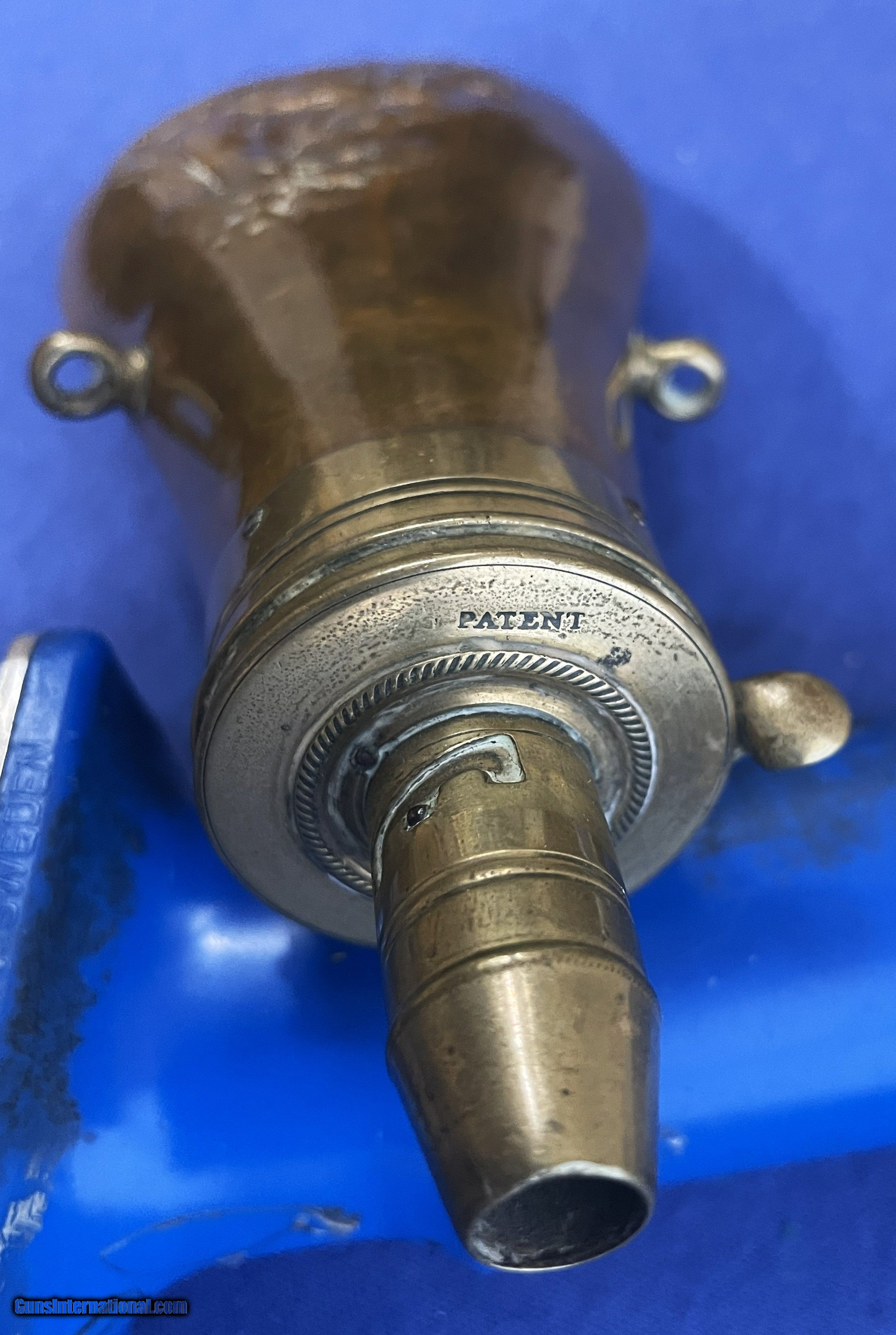 Description: ORIGINAL VERY UNCOMMON DESIGN SHOWING A FALLING HUNTER GRASPING TREE BRANCH WITH RIFLE LEANING ON THE TREE. DESIGN REPEATS ON BOTH SIDES, TIGHT SEAMS, NICE OLD PATINA, TOP MARKED "PATENT" SPOUT UNSCREWS TO FILL. A HIGH QUALITY COPPER & BRASS FLASK, AS PICTURED & FOUND IN A NEW ENGLAND COLLECTION. $15.00 S&H SEE OTHERS AND COMBINE SHIPPING. Price: $150.00 Buy Now Contact Seller |