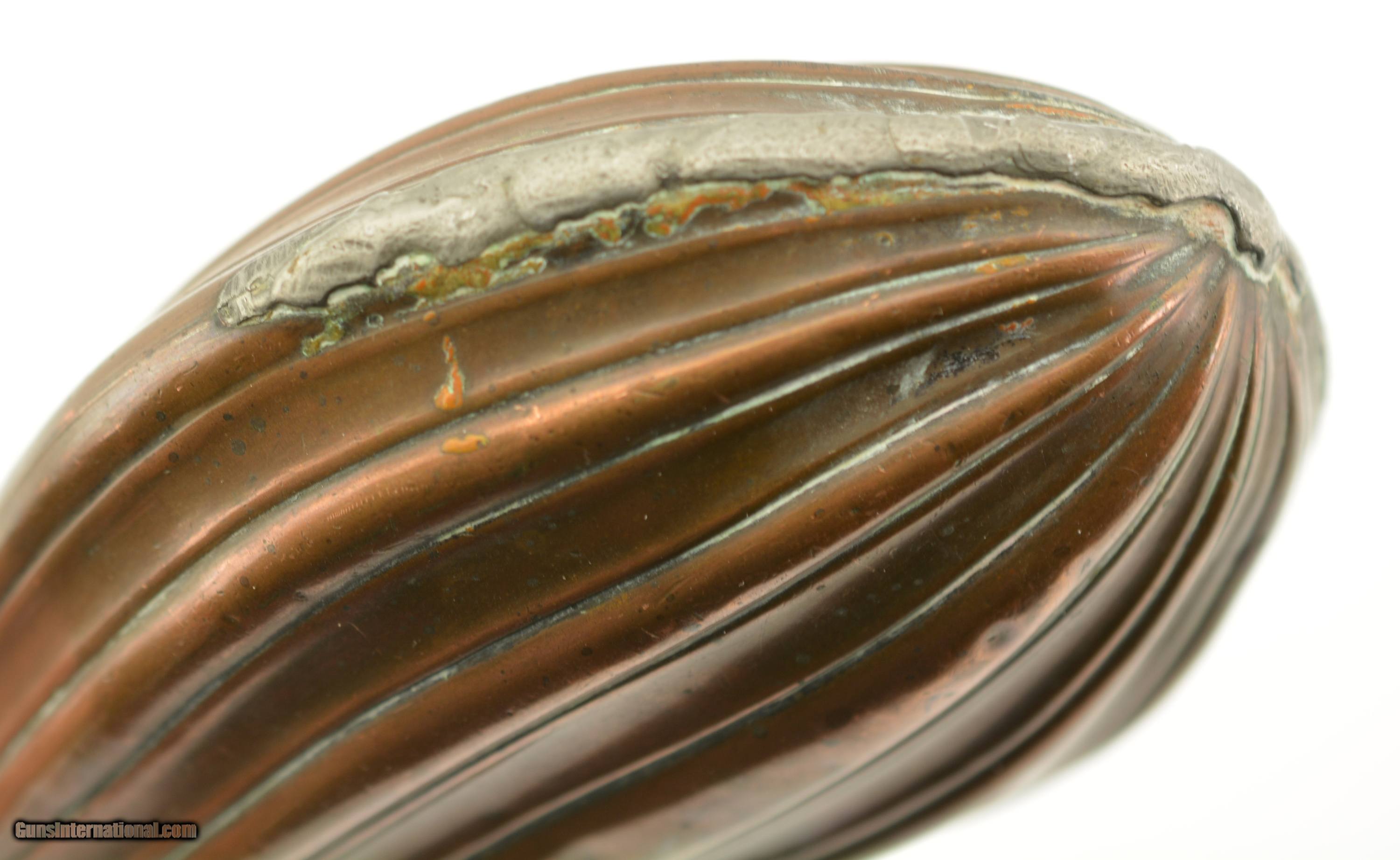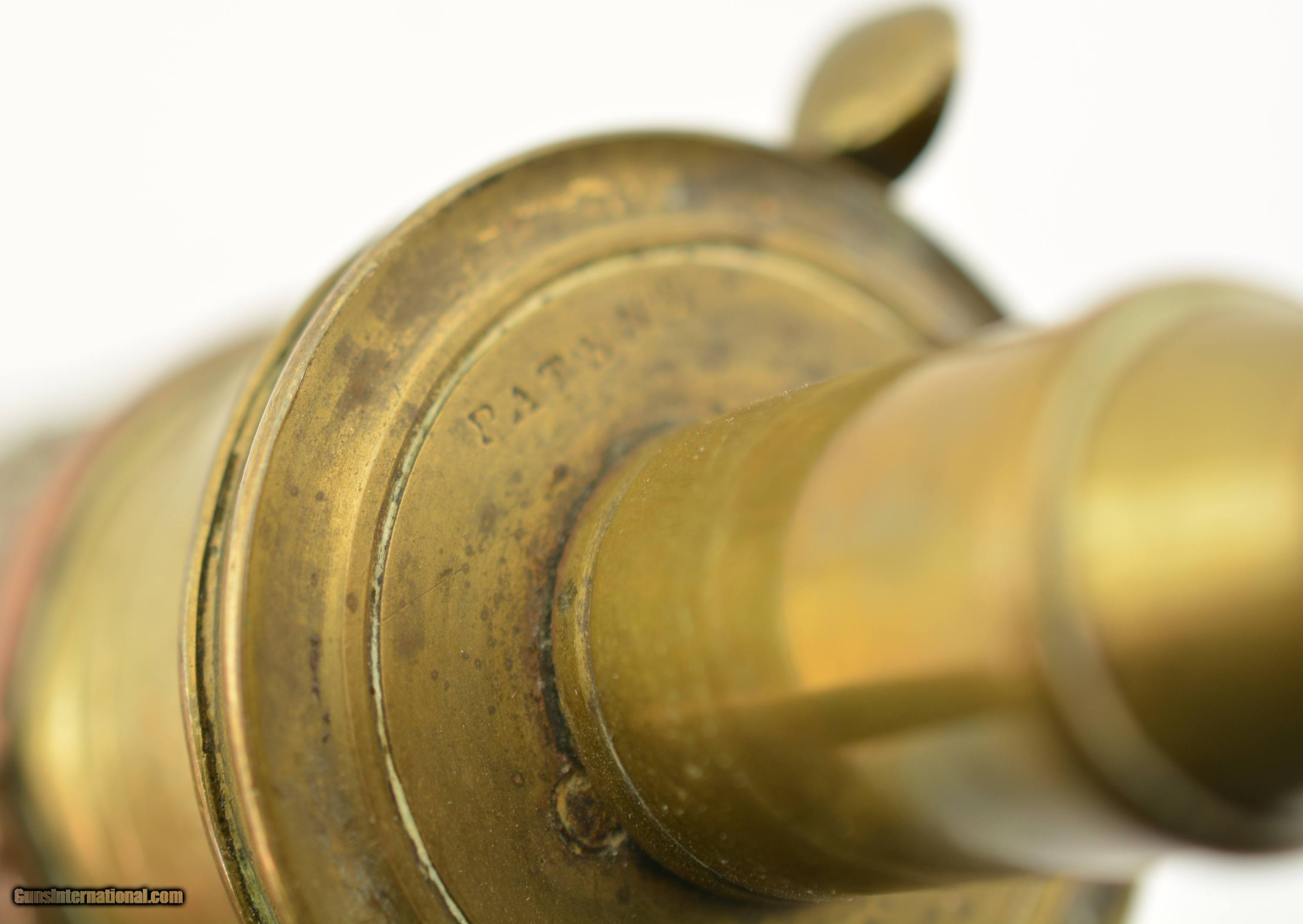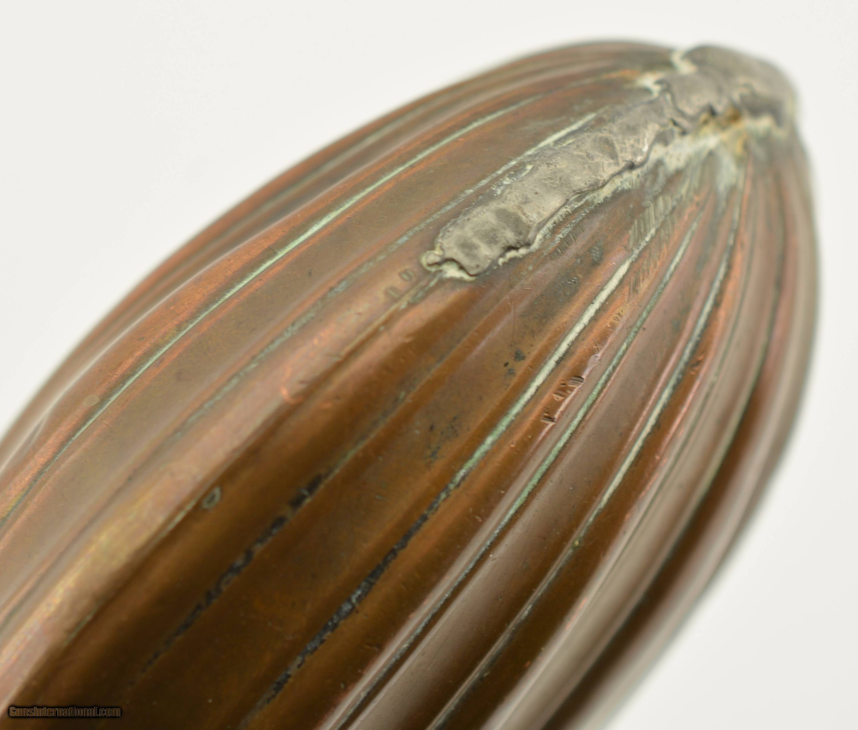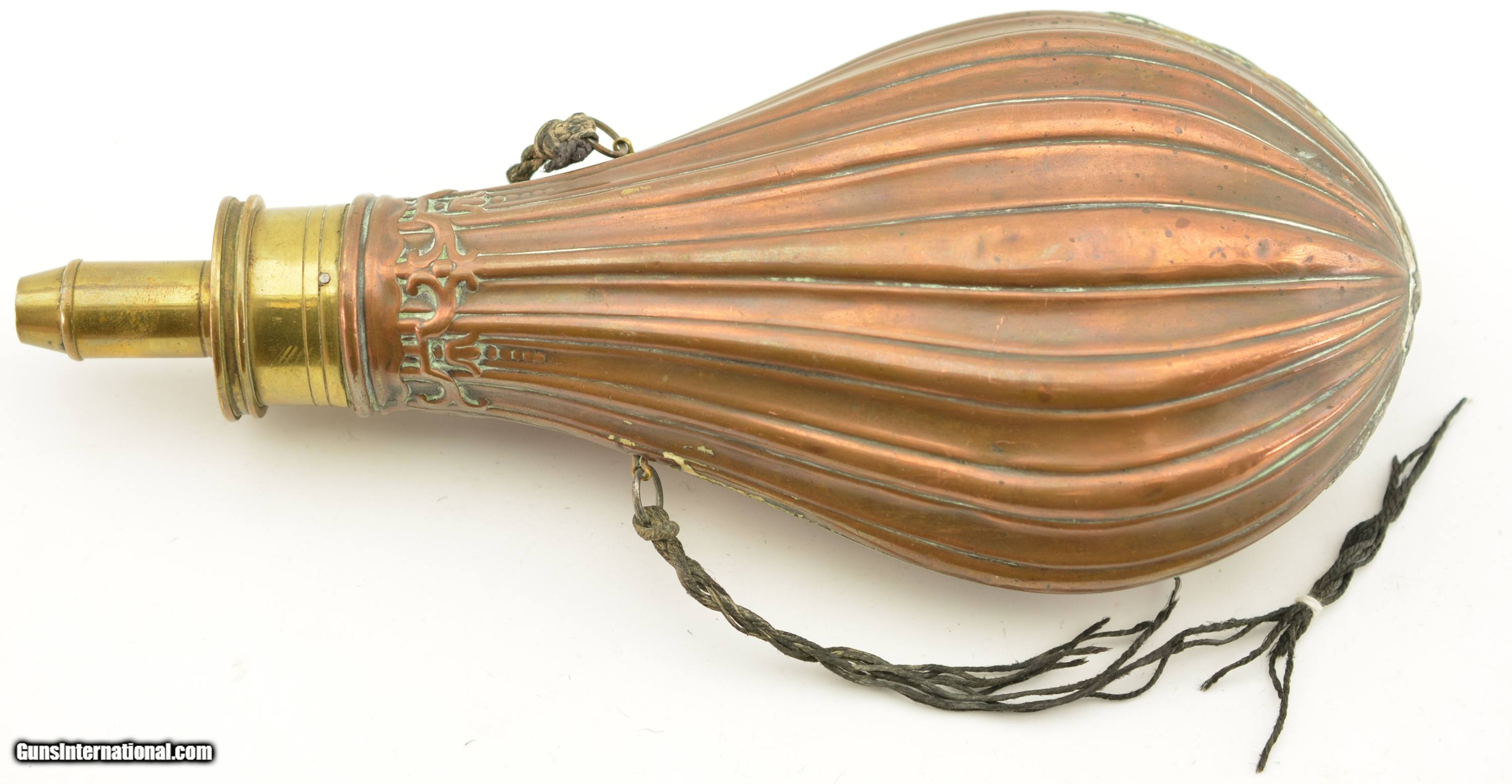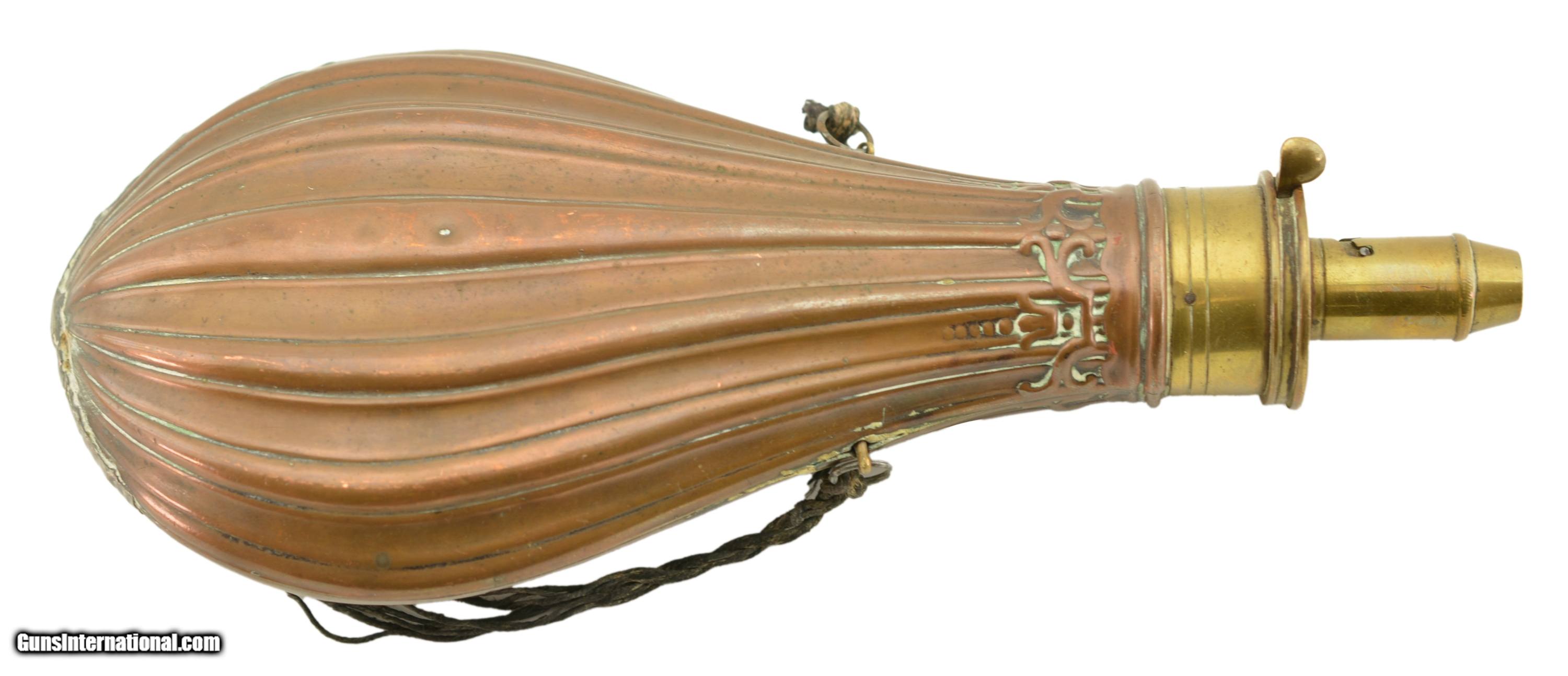 Description: This is a fine Fluted pattern, copper, middle to late eighteen hundreds flask. This flask is manufactured by Capewell (Riling #288 page 284) and has a Patent top with a deep patina, has a slight seam separation on bottom that has been soldered, with signs of many years of use with small dings. The charger and spring work fine. Will add to any collection. 9" X 4". SOLD |