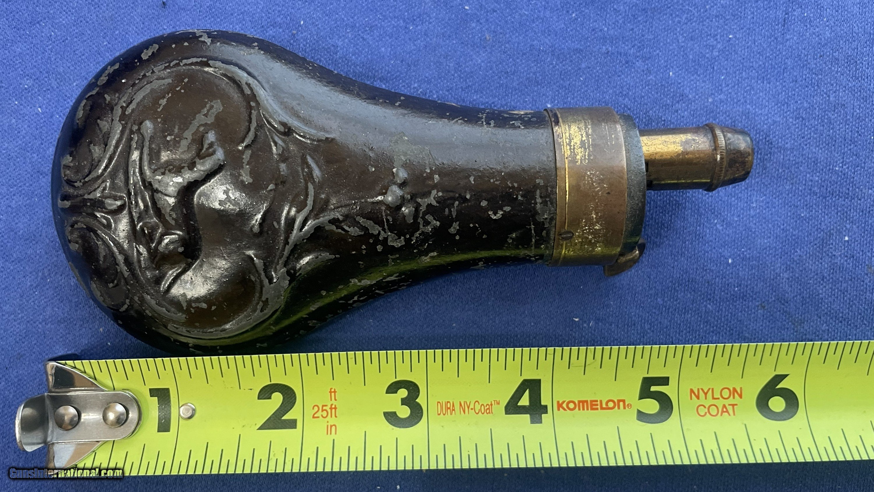 Description: UNCOMMON ANTIQUE BRASS & ZINC POWDER FLASK. RESTING HOUND DOG IN PANEL MOTIF REPEATS ON BOTH SIDES. THIS FLASK STILL HAS MOST OF THE ORIGINAL LAQUER FINISH, TIGHT SEAMS AND WORKS AS IT SHOULD WITH SCREW-OFF SPOUT FOR FILLING, AS PICTURED & FOUND IN A NEW ENGLAND COLLECTION. $15.00 S&H ANYWHERE IN THE U.S. SEE OTHERS AND COMBINE SHIPPING. Price: $95.00 Buy Now Contact Seller |