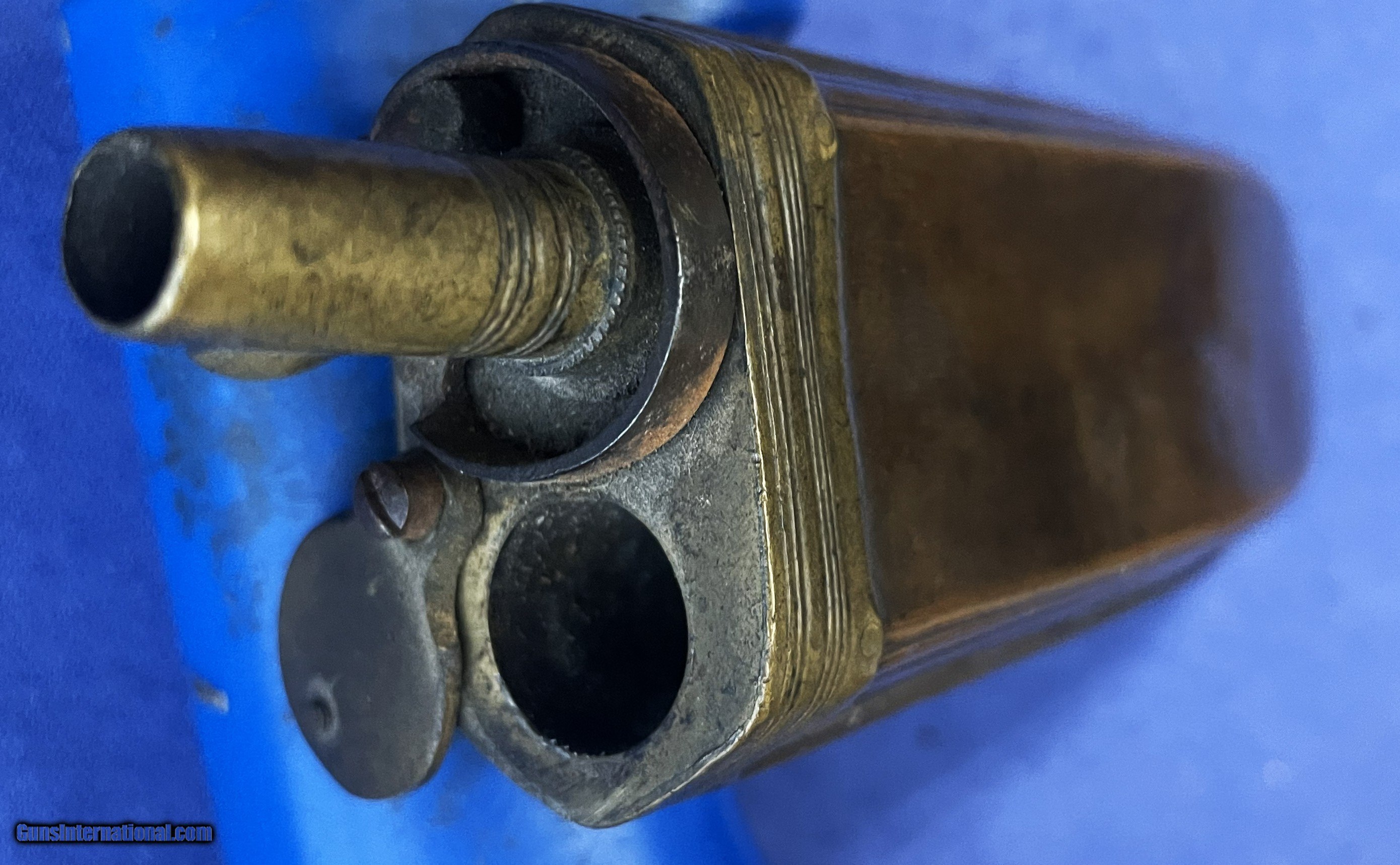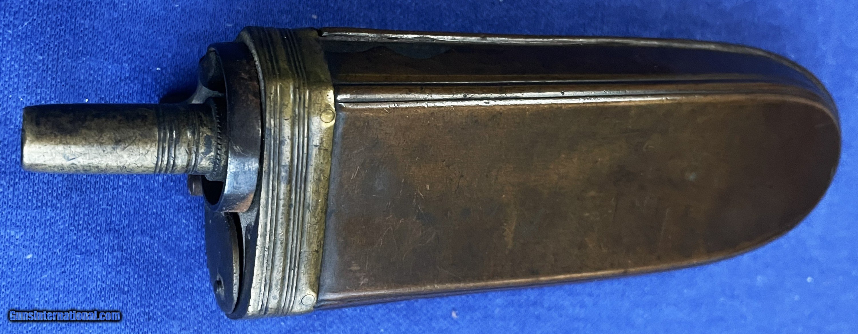 Description: UNUSUAL COPPER & BRASS PISTOL FLASK WITH PERCUSSION CAP COMPARTMENT. COPPER BODY, BRASS TOP. TYPE OFTEN SEEN IN CASED SETS. FULLY FUNCTIONAL, SPOUT UNSCREWS TO FILL. VERY GOOD ORIGINAL CONDITION, TIGHT SEAMS, AS PICTURED & FOUND IN A NEW ENGLAND COLLECTION. $15.00 S&H SEE OTHERS, COMBINE SHIPPING. Price: $150.00 Buy Now Contact Seller |