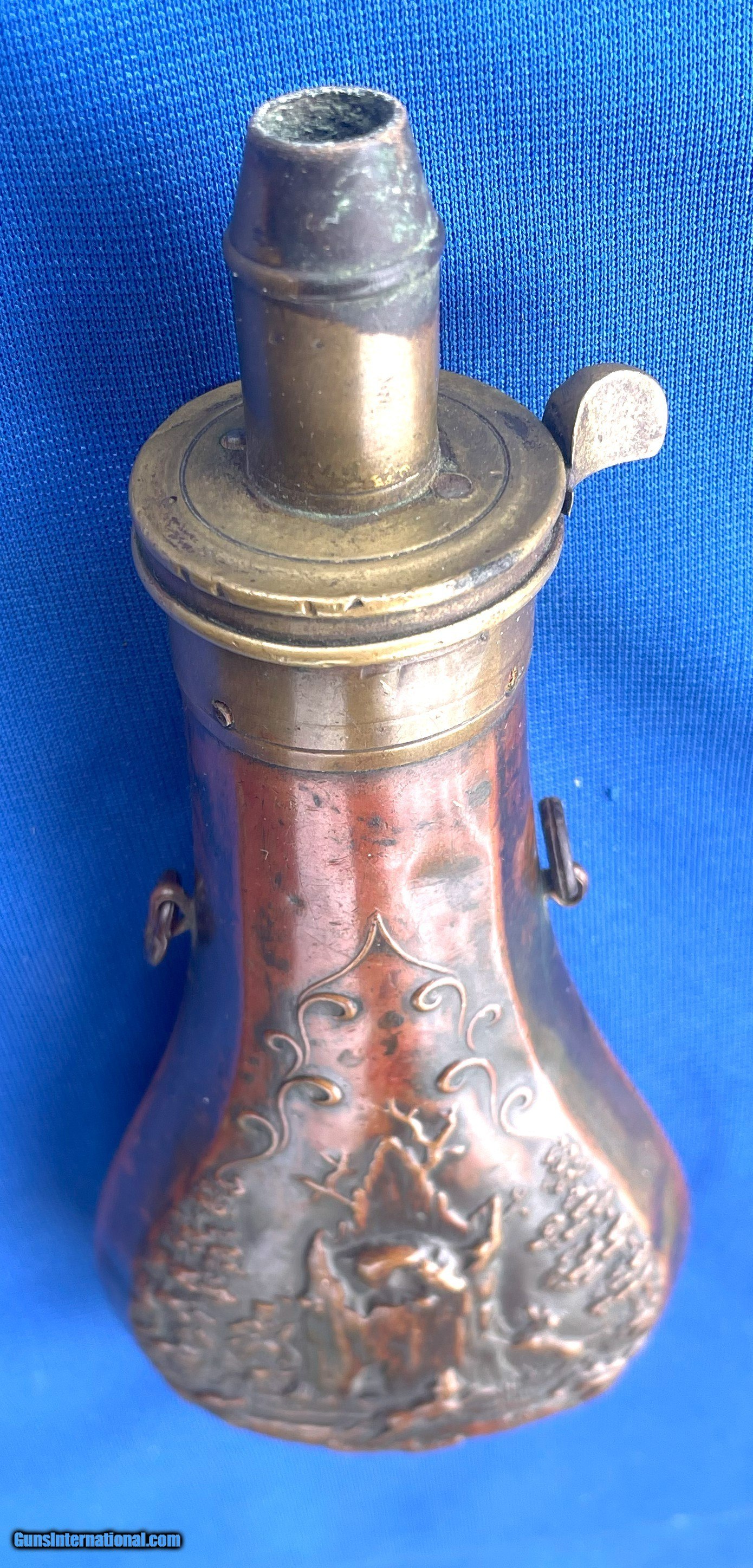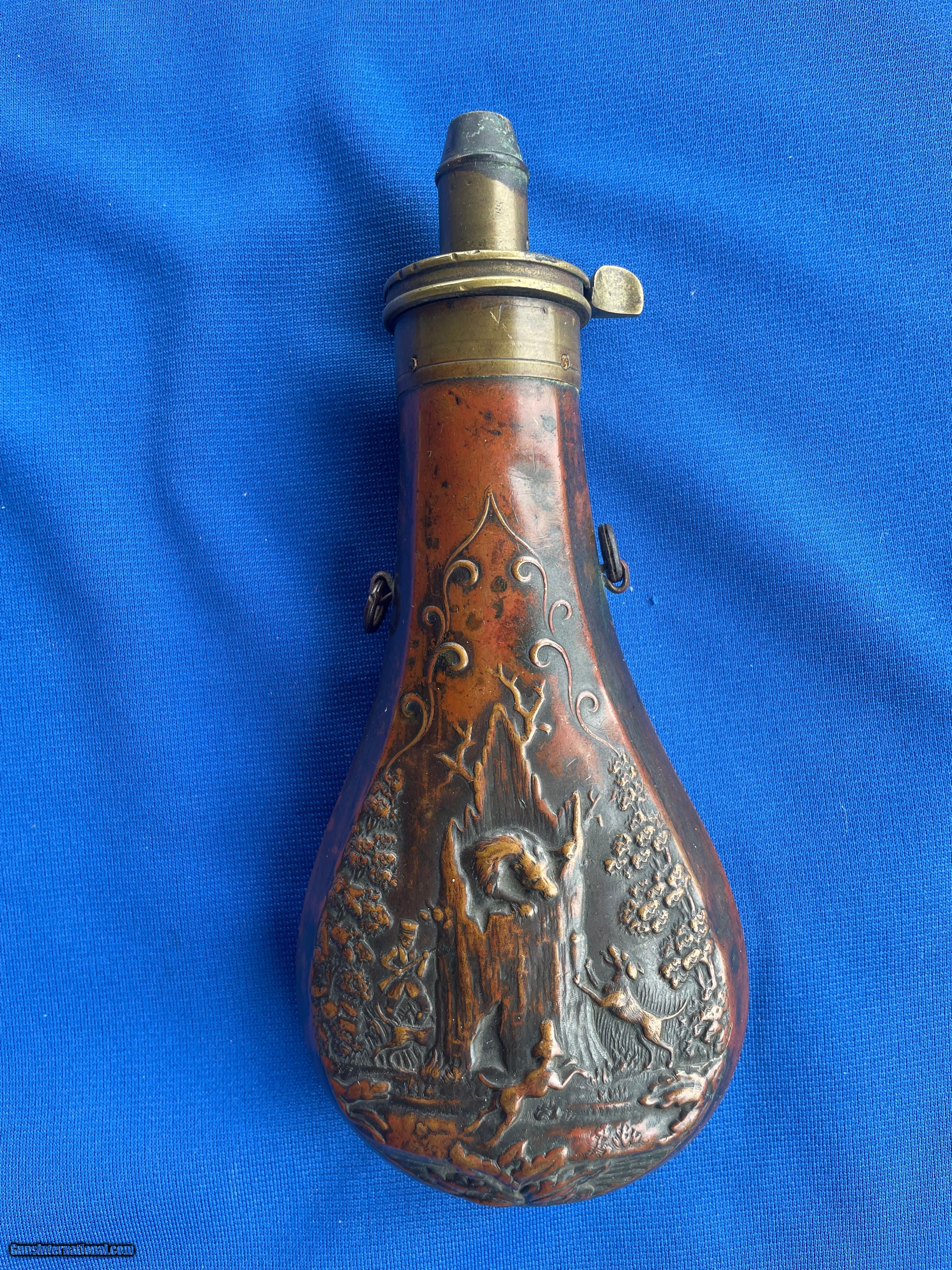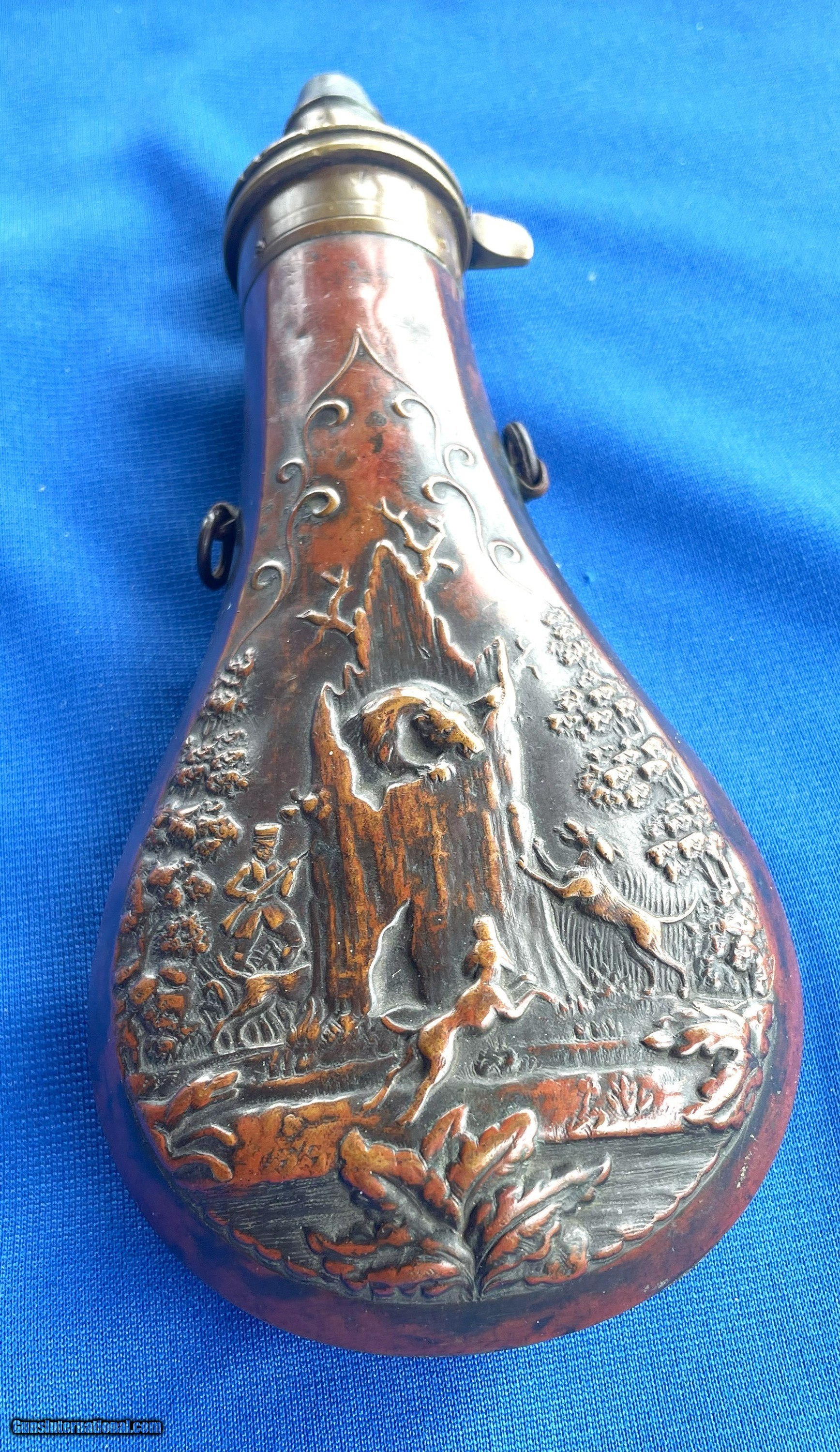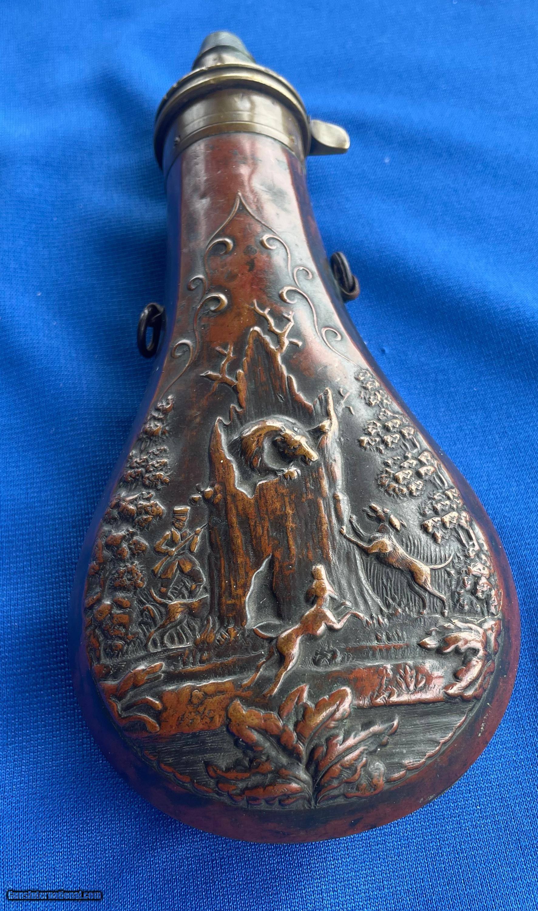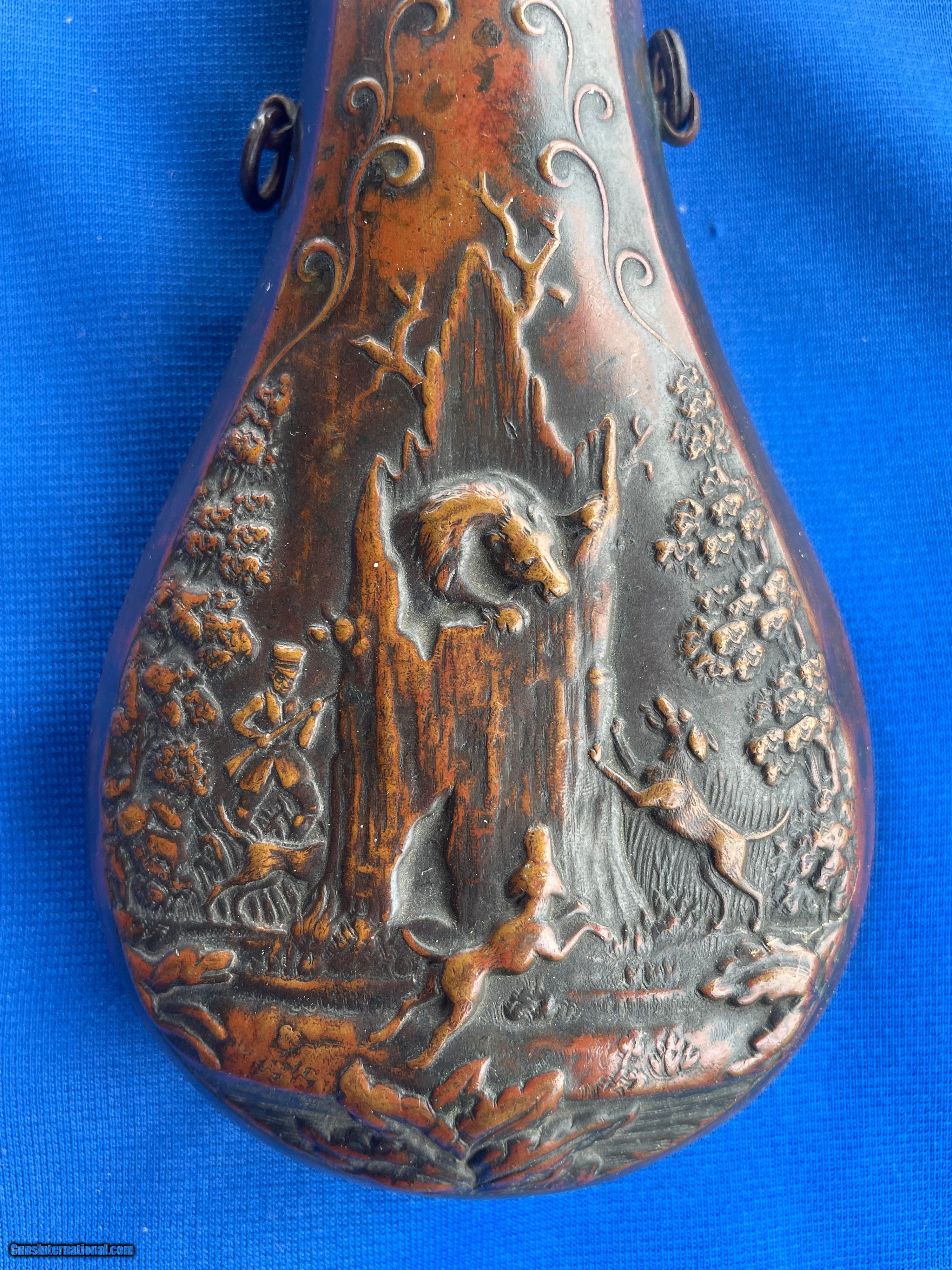 Antique CIVIL WAR ERA POWDER FLASK HUNTER, DOGS & BEAR IN A TREE