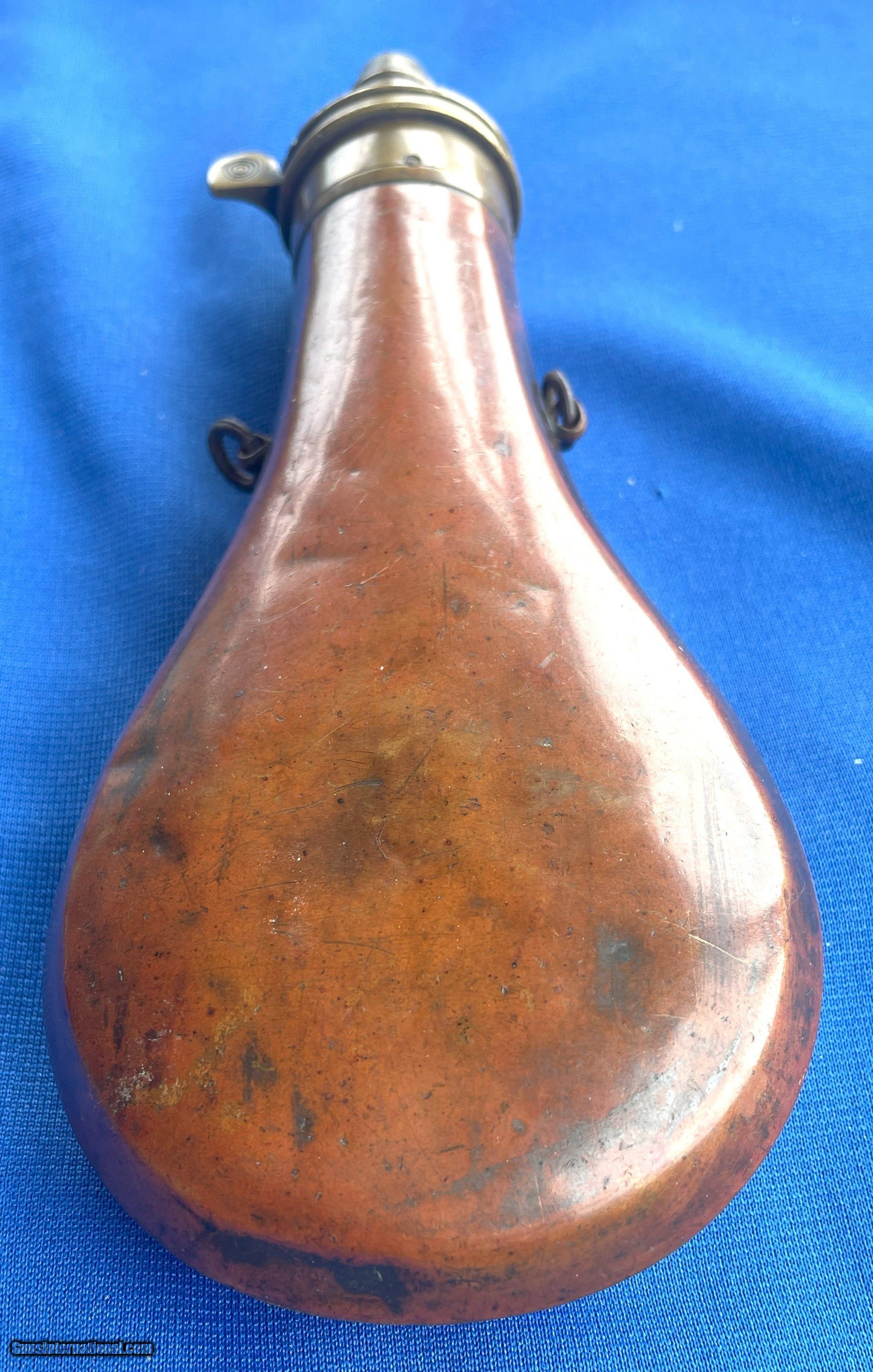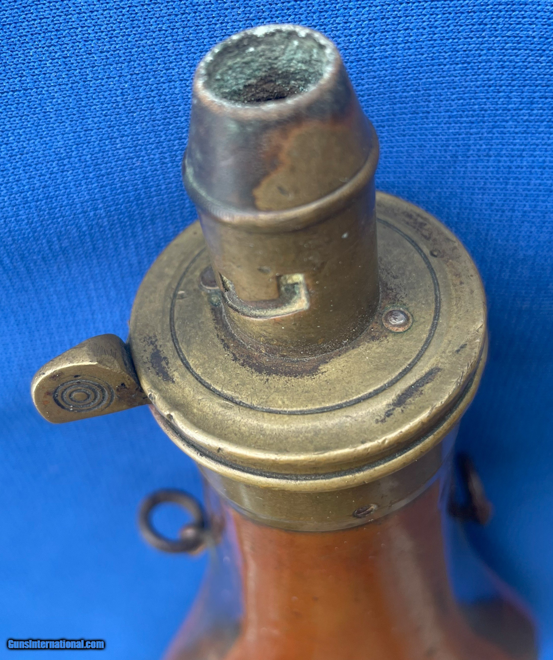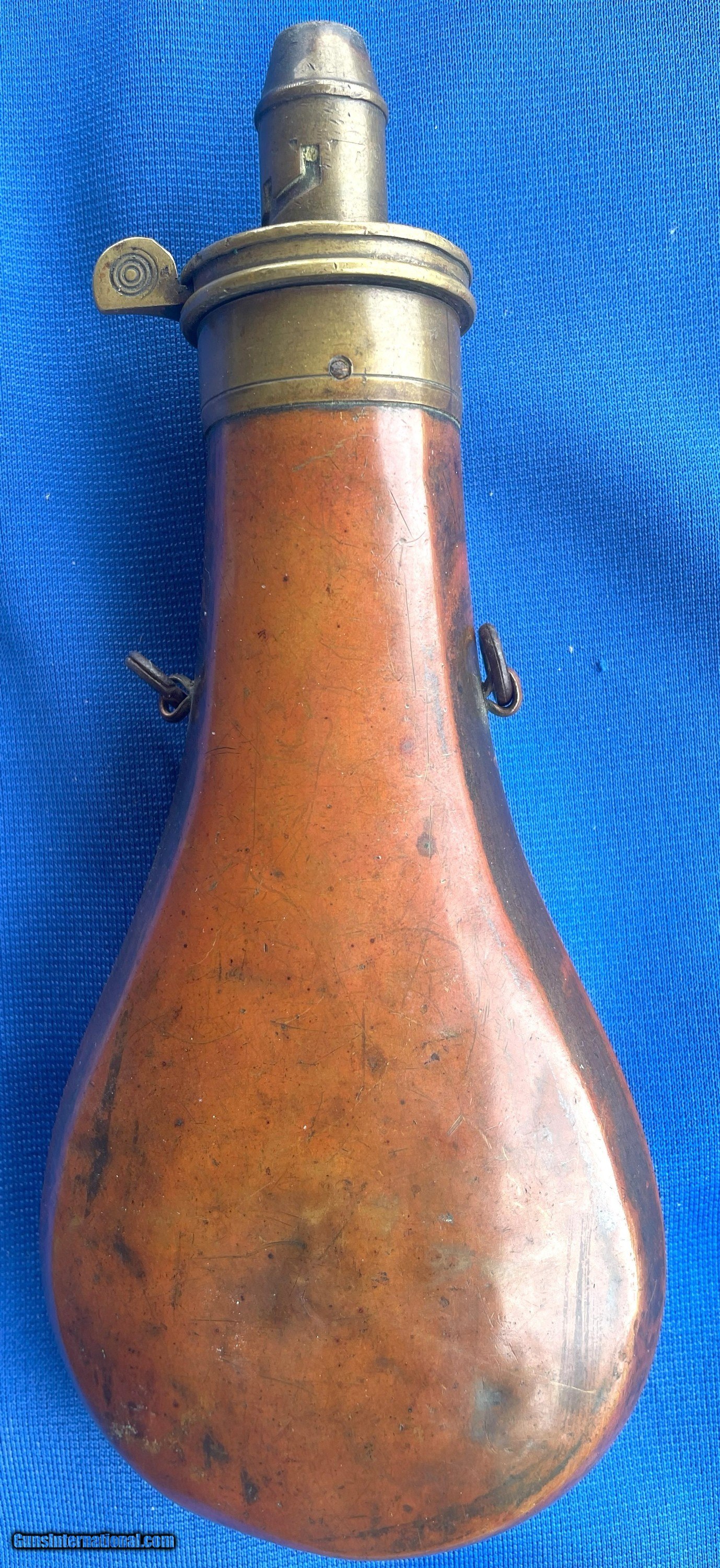 Description: ORIGINAL SCARCE COPPER & BRASS POWDER FLASK UNUSUAL PATTERN, NICE MELLOW UNCLEANED PATINA SURFACES, GOOD SPRING, TIGHT SEAMS WITH MINOR LIGHT IMPRESSIONS, AS PICTURED & FOUND, ABOUT 8" x 3 1/4" x 1 1/4". TAKE A LOOK AT MY OTHER LISTINGS IF YOU HAVE TIME. $15.00 S&H INSURED DIRECT TO YOU ANYWHERE IN THE U.S. SOLD |