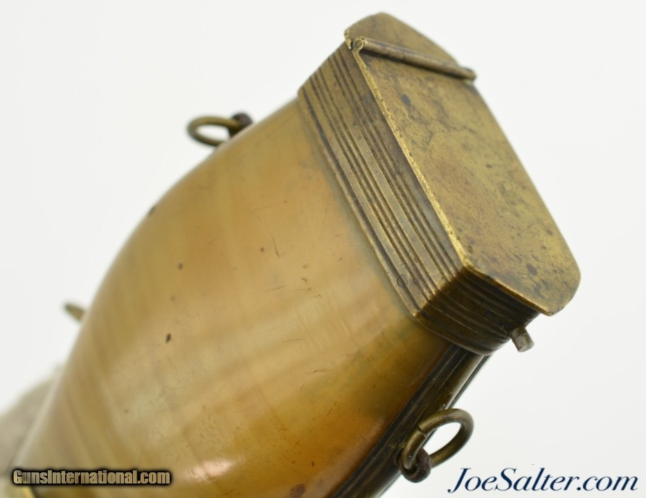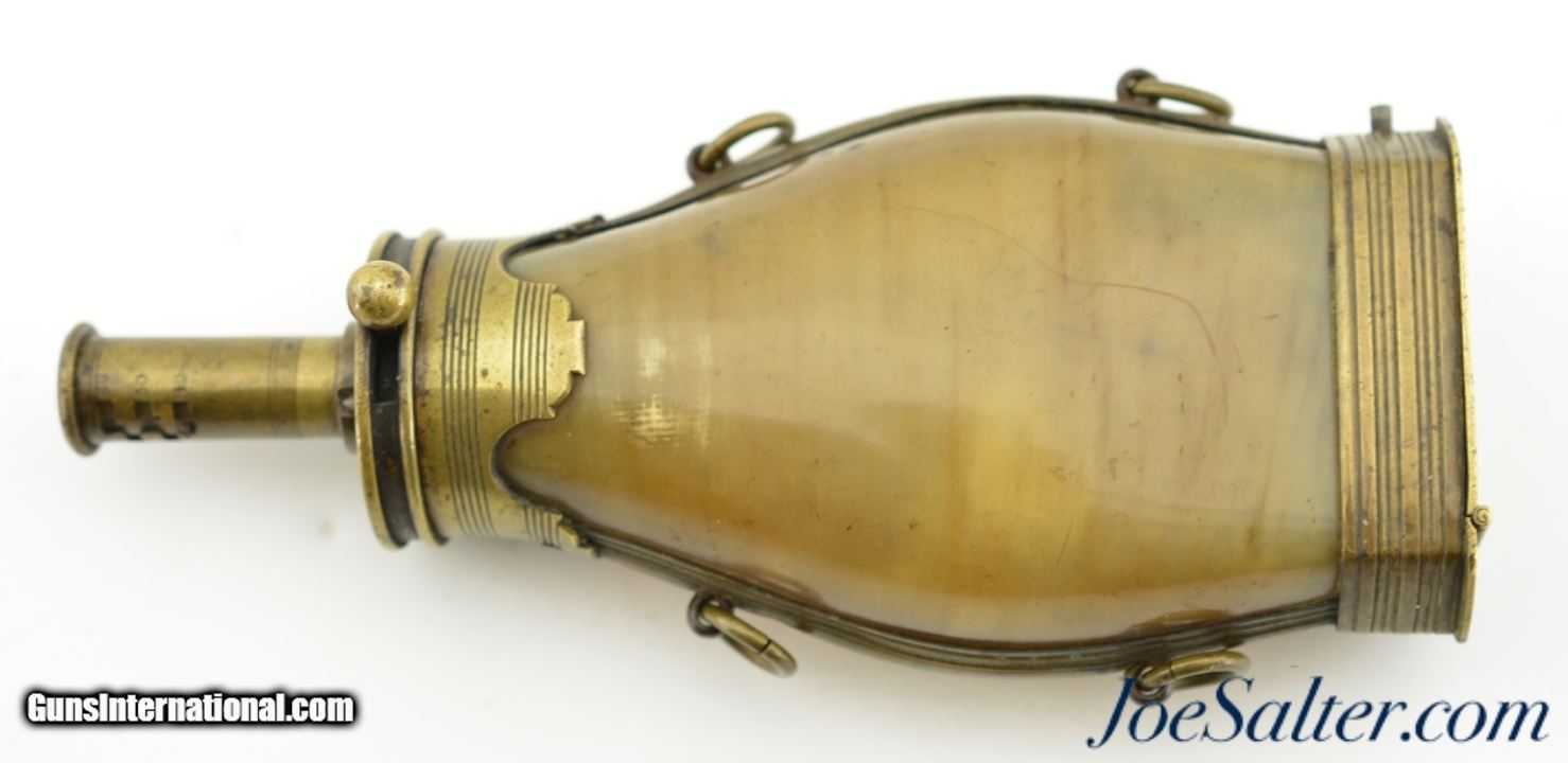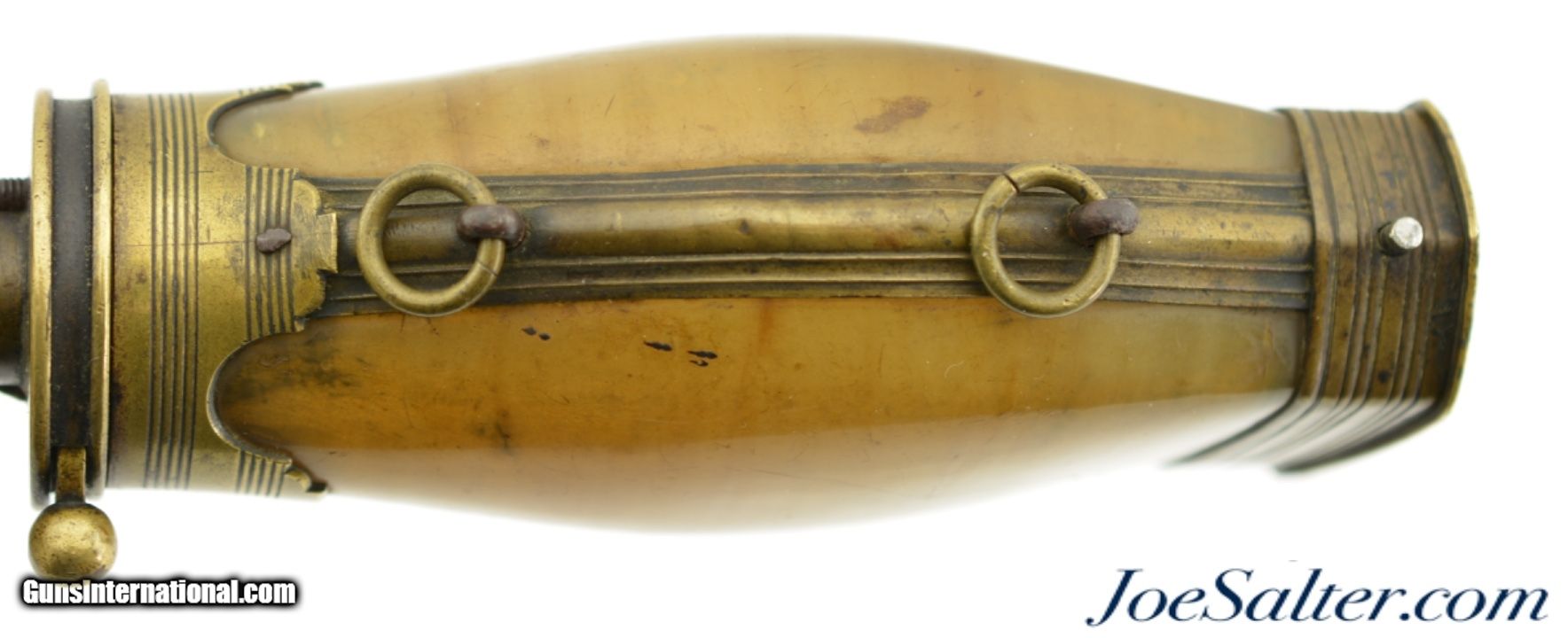 Description: This is a very well-made, "perfume bottle" shaped flask with translucent horn body and brass spout and fittings. The horn walls are in excellent condition with no cracks or breaks, and the brass has a mellow ochre patina throughout. The flask has an adjustable spout, reinforcing brass straps along the sides with cord rings, and a small patch or bullet compartment on the bottom with push-stud clasp. This is a handsome little pistol-sized flask, and is in fine condition. It would make a great display piece or decorative accent. SOLD |