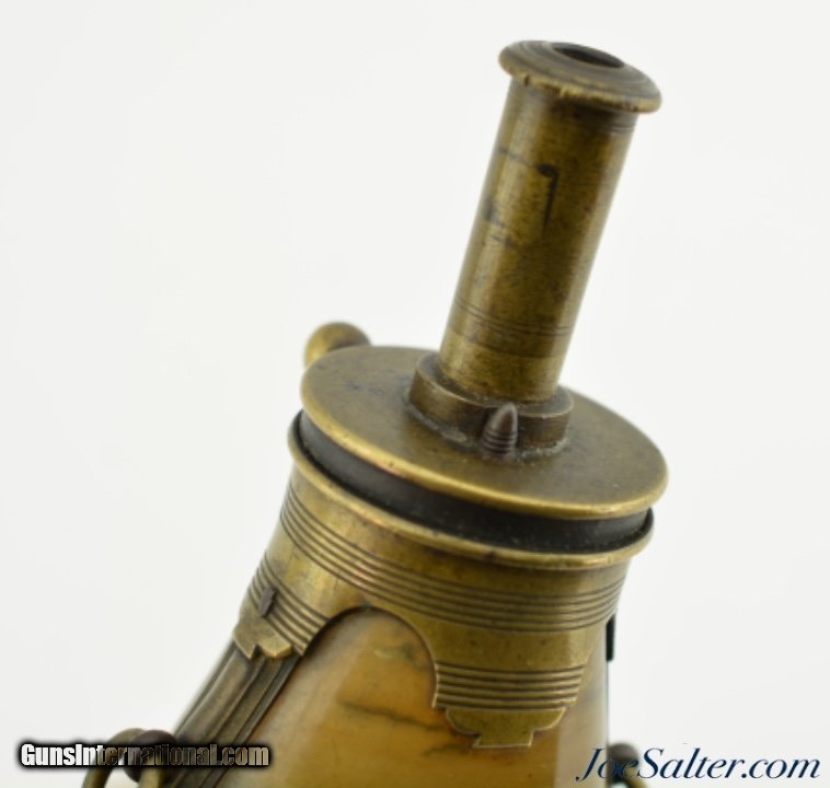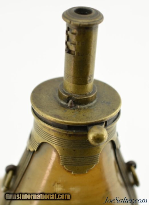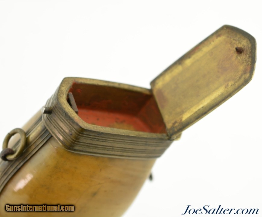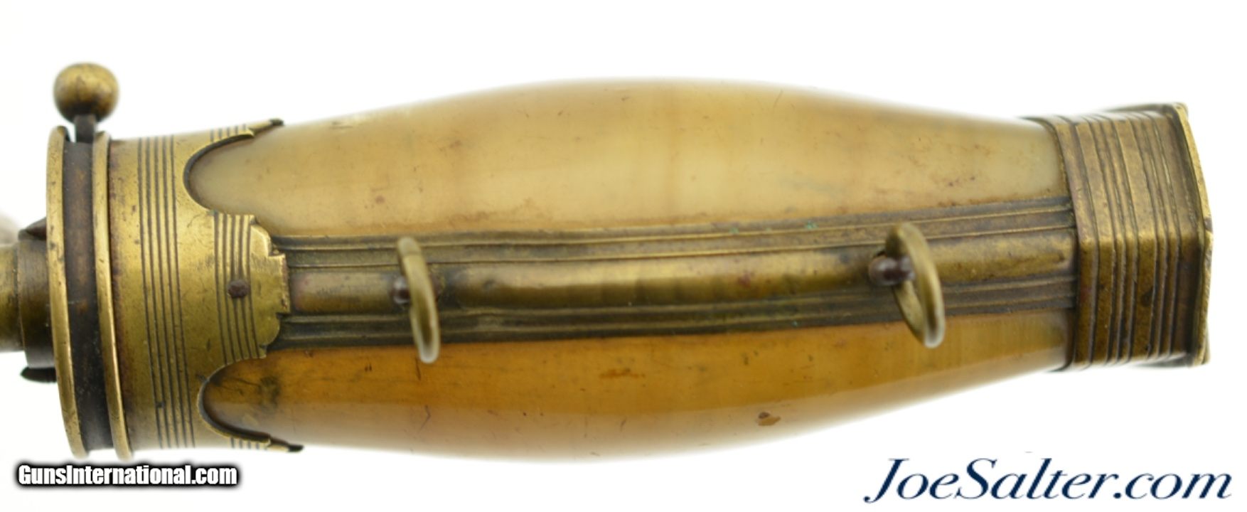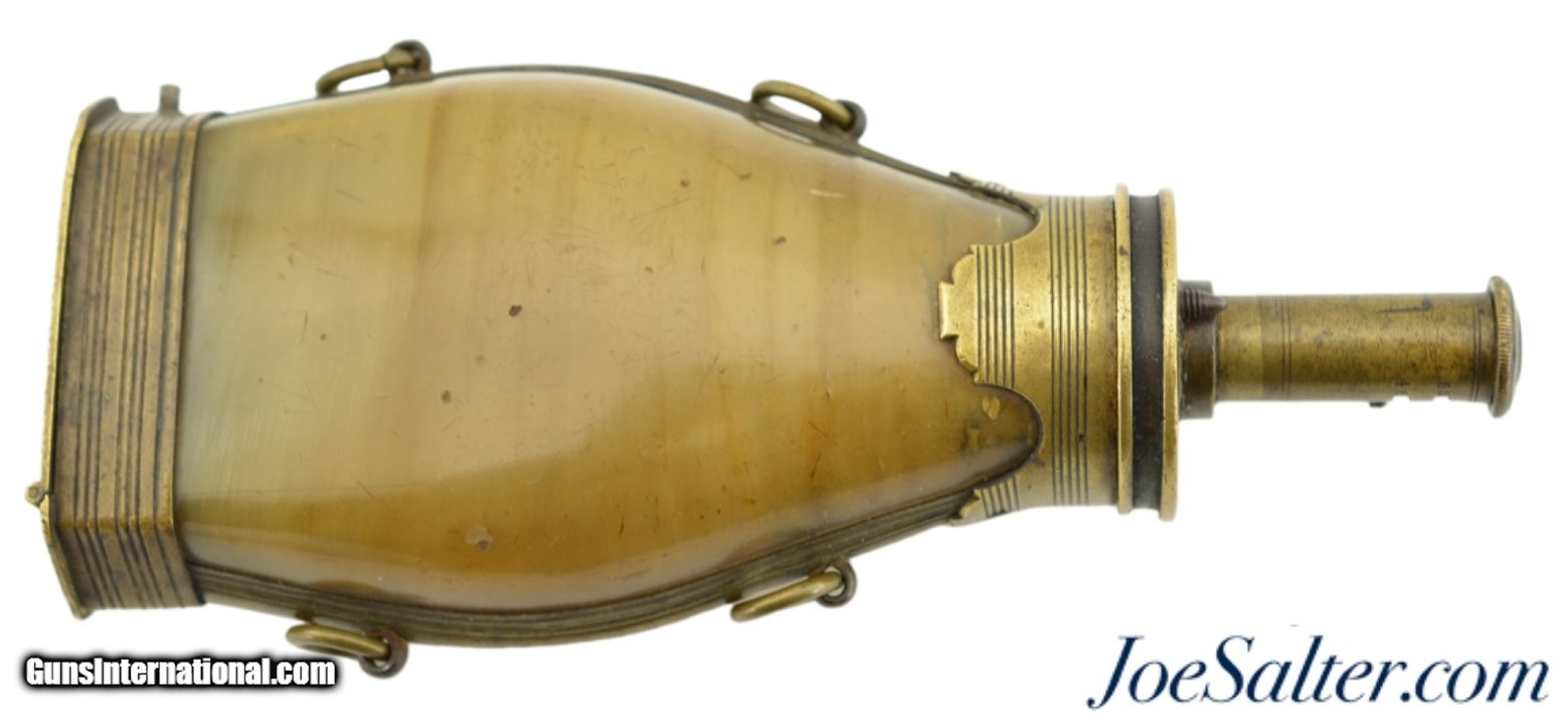 Description: This is a very well-made, "perfume bottle" shaped flask with translucent horn body and brass spout and fittings. The horn walls are in excellent condition with no cracks or breaks, and the brass has a mellow ochre patina throughout. The flask has an adjustable spout, reinforcing brass straps along the sides with cord rings, and a small patch or bullet compartment on the bottom with push-stud clasp. This is a handsome little pistol-sized flask, and is in fine condition. It would make a great display piece or decorative accent. SOLD |