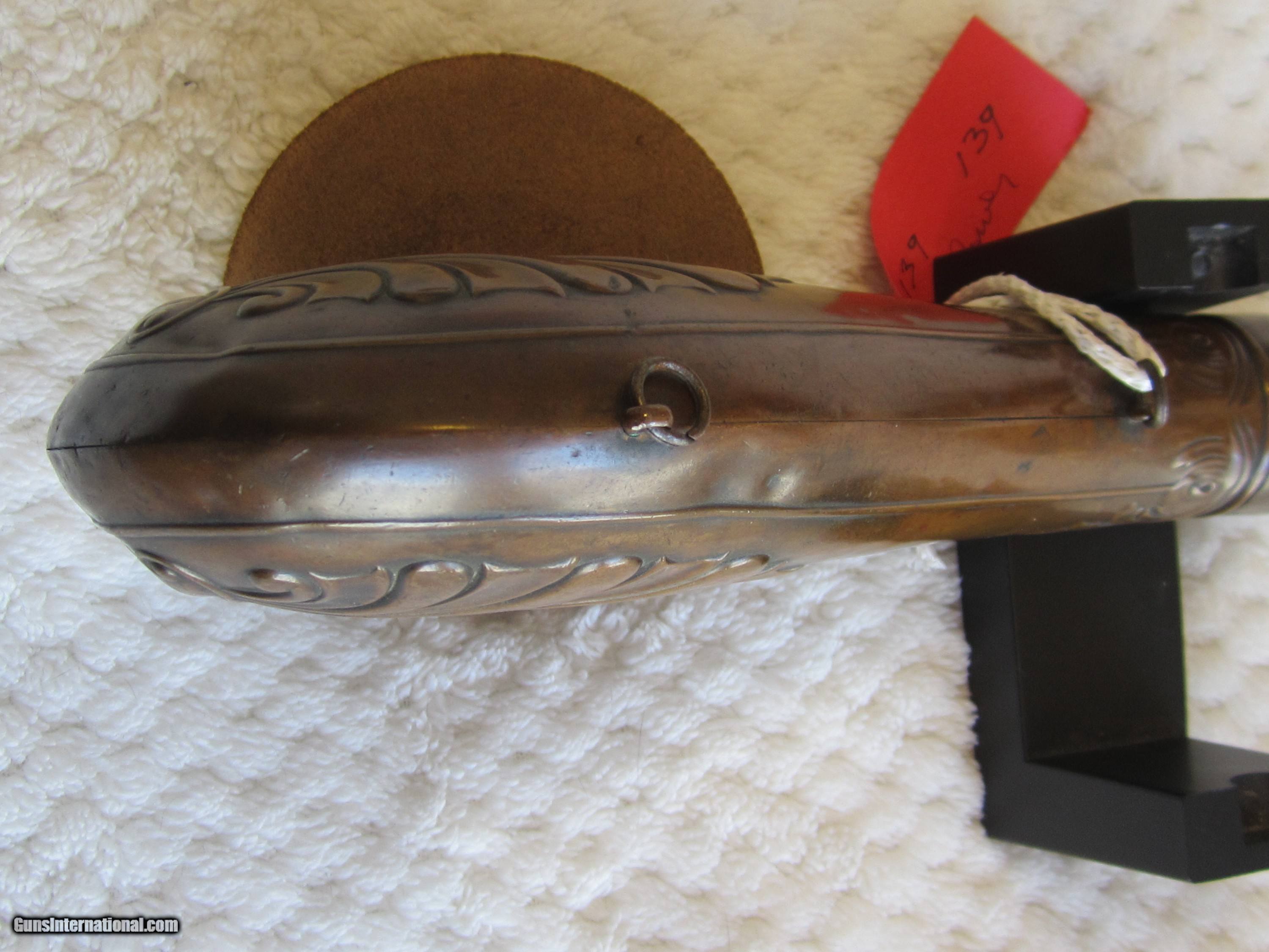 Description: # 139 $ 175- No maker name. Shell & Bush design. 9 X 4 1/2". See Riling Powder Flask Book page 291- N365. Very good condition ( see pictures). Made of copper.- nice patina. Springs work. Add $15- for shipping. NOTE: Can combine with Flask # 83 which has same design but is smaller to make an interesting pair. Short term interest free financing available if you buy more than one flask. . Antique flasks make good investments and are great gifts for birthdays & Xmas. ALL REASONABLE OFFERS CONSIDERED SOLD |