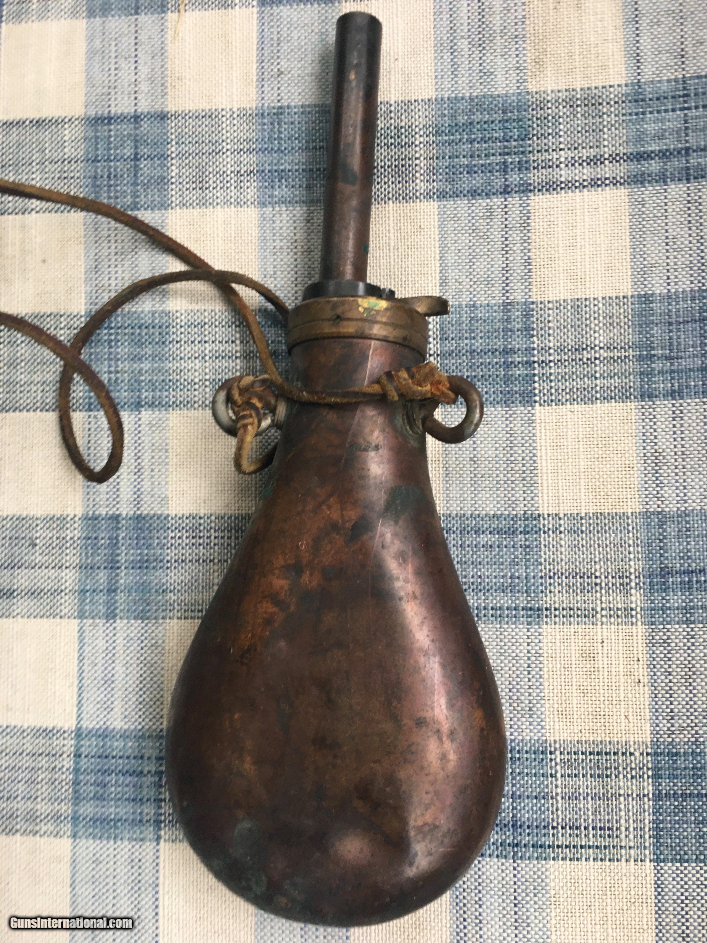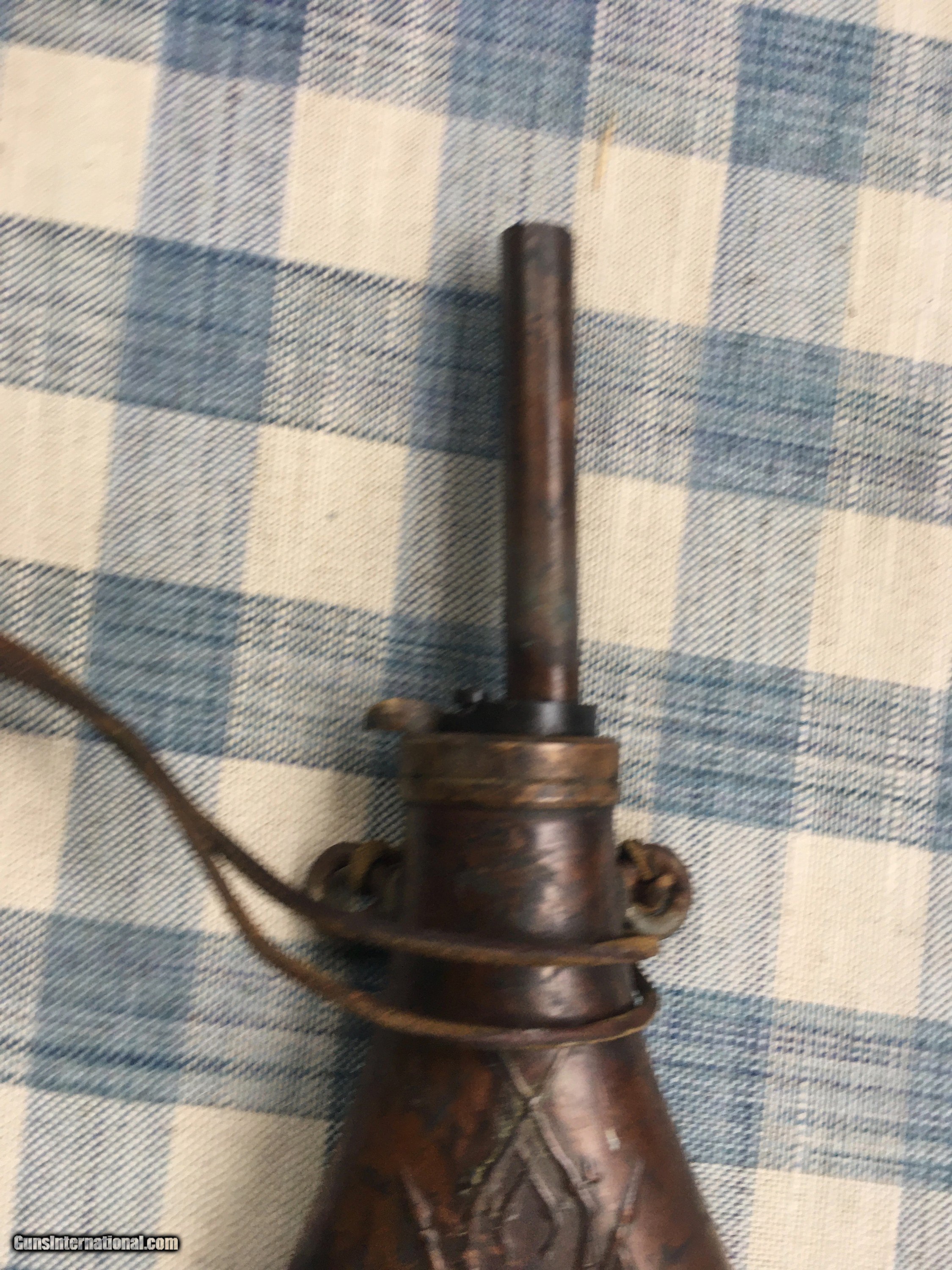 Description: Nice flask with long 3" nozzle , smal indent on back side. Pictures are a real good representation. Body less nozzle is 6"" tall ,3" wide. Opens and closes nicely with lanyard. Possibly for a Colt. Shipping is $15 USPS Priority SOLD |