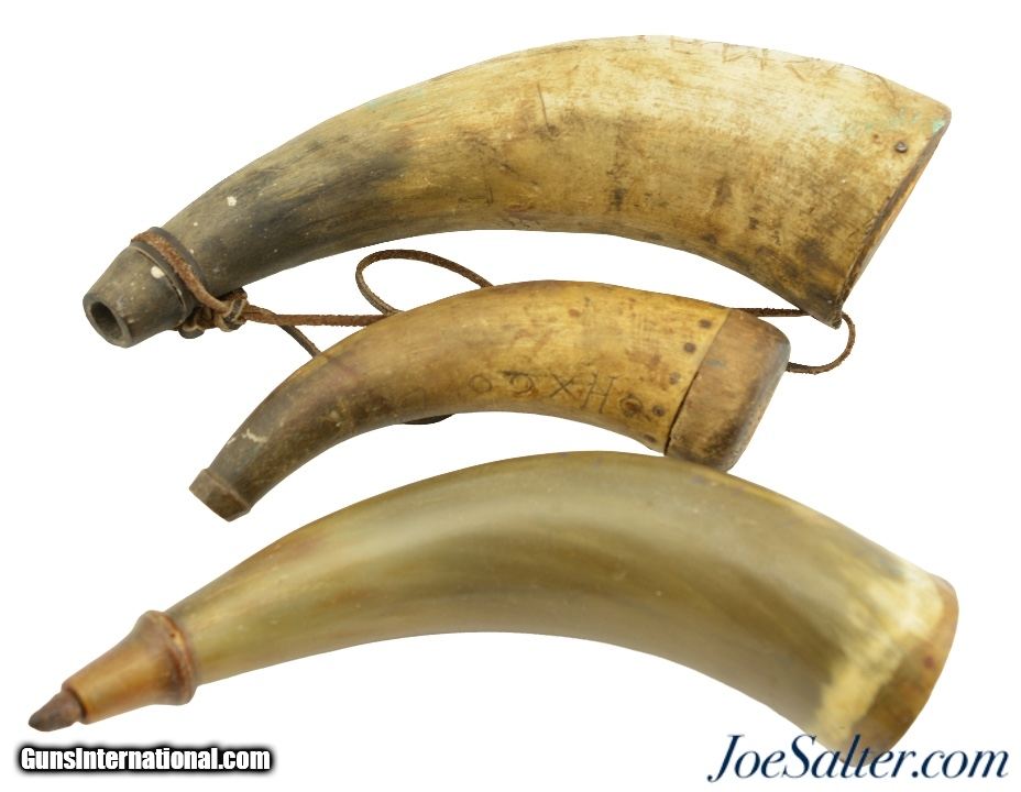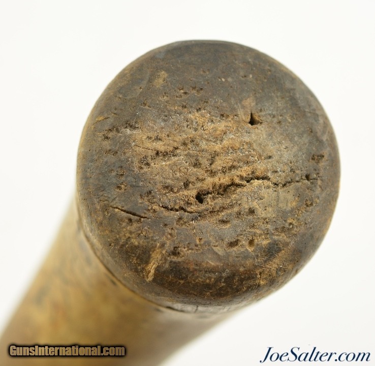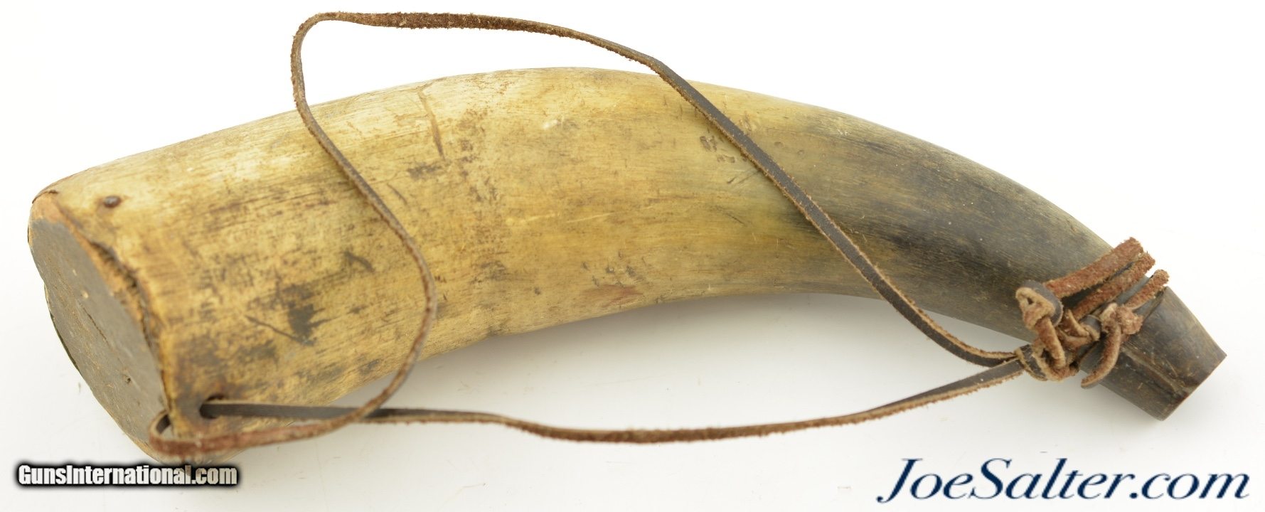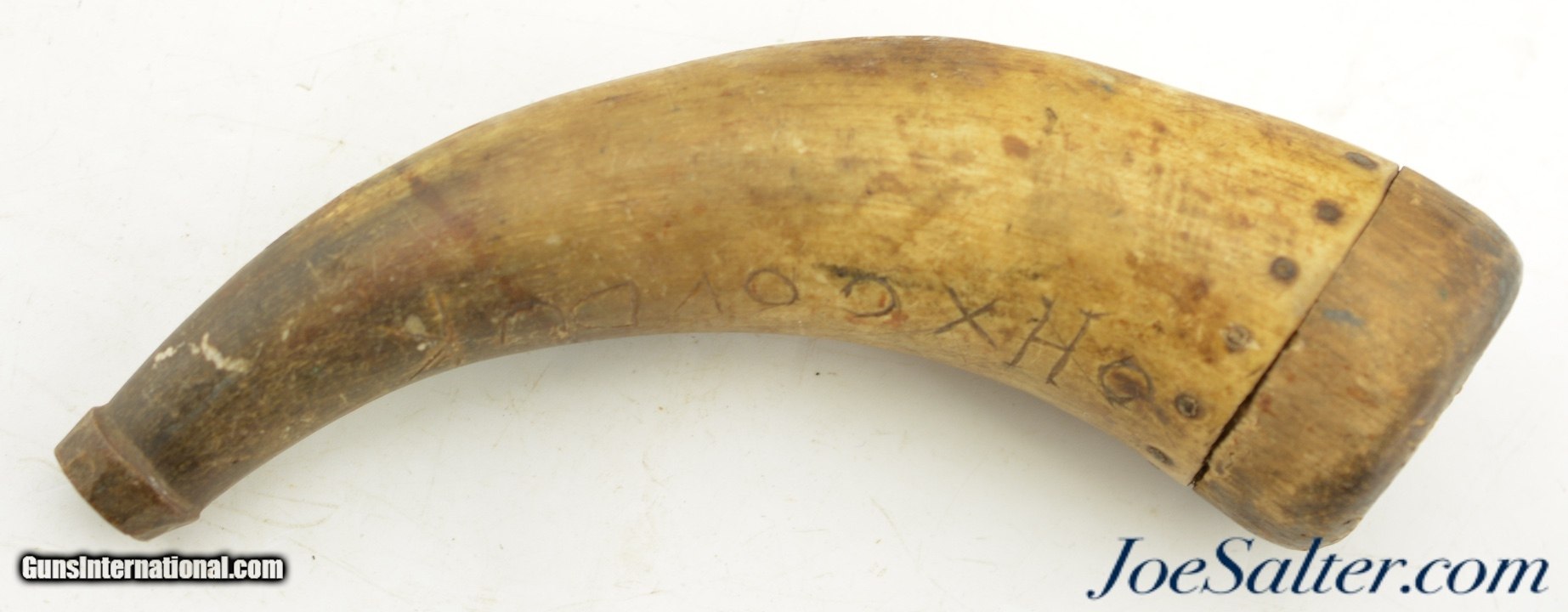 Description: This is a collection of 3 vintage powder horns containing 1 good condition, 6 1/2" horn with a large 1 3/4"x3/4" wooden plug, firmly nailed with 13 nails to the base of the horn. This one is etched "OHXCOVDUK" along the inside curve. The next is 9 1/2" with ornate carved collar with a small broken tip/plug. The wooden base is flat and nailed to the horn with "W.B." etched into the base in very good condition. The last is just over 10" and is the crudest of the three, the base having 3 nails but may be the oldest in the group. This has what appears to be an ARROW on one side and "P/l/BA" on the top curve. This is in good condition without a stopper and has a contemporary; Price: $119.00 Contact Seller |